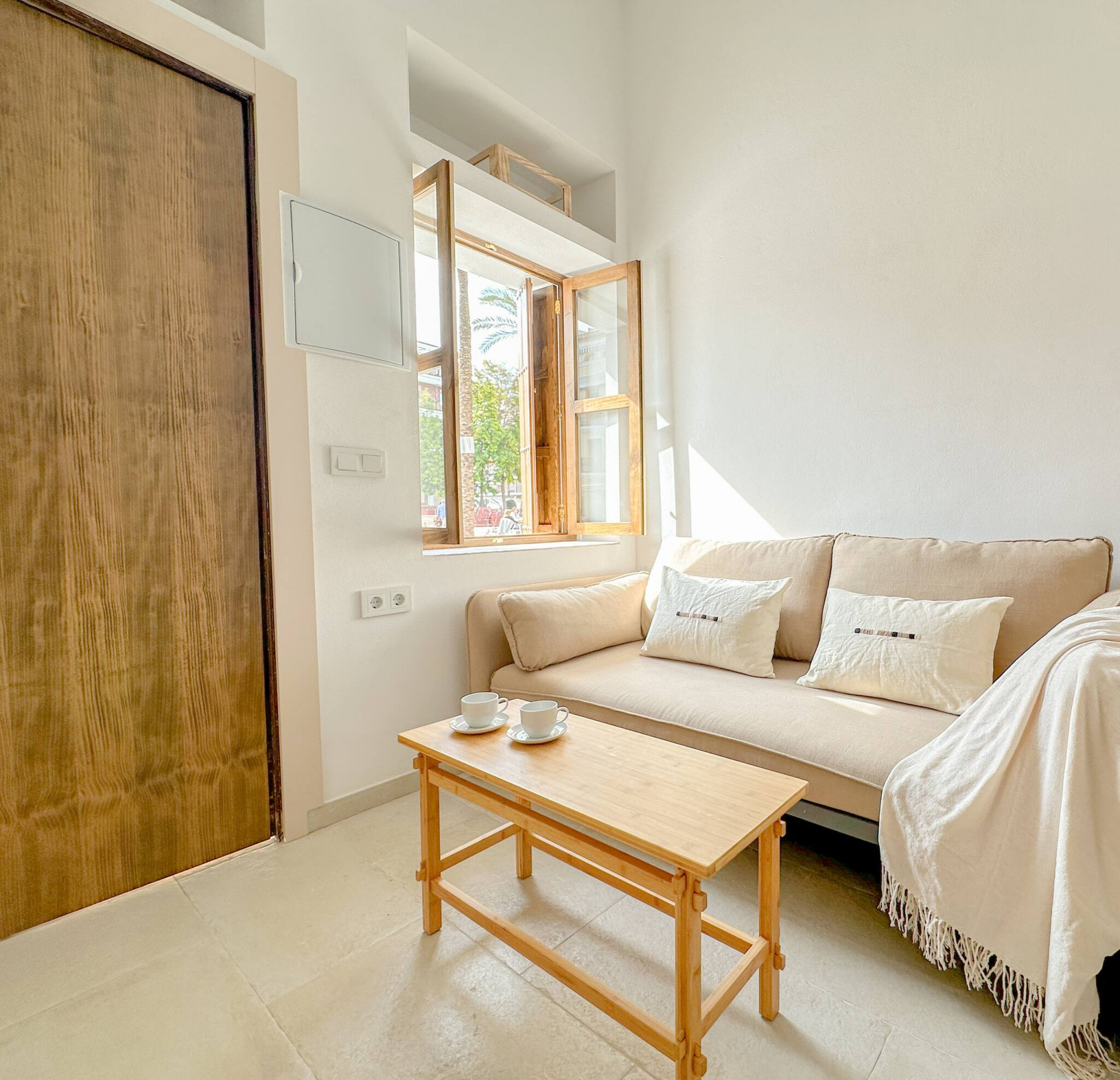 > Living-comedor: Este es un ambiente muy acogedor y cuidadosamente decorado, junto a la puerta de ingreso y en frente a la cocina. Este espacio cuenta con un cómodo sofá cama de dos cuerpos y una mesita para disfrutar de un café o rica comida junto a la ventana, con vista a la Plaza España. Desde aquí se accede a la escalera para ingresar al dormitorio.