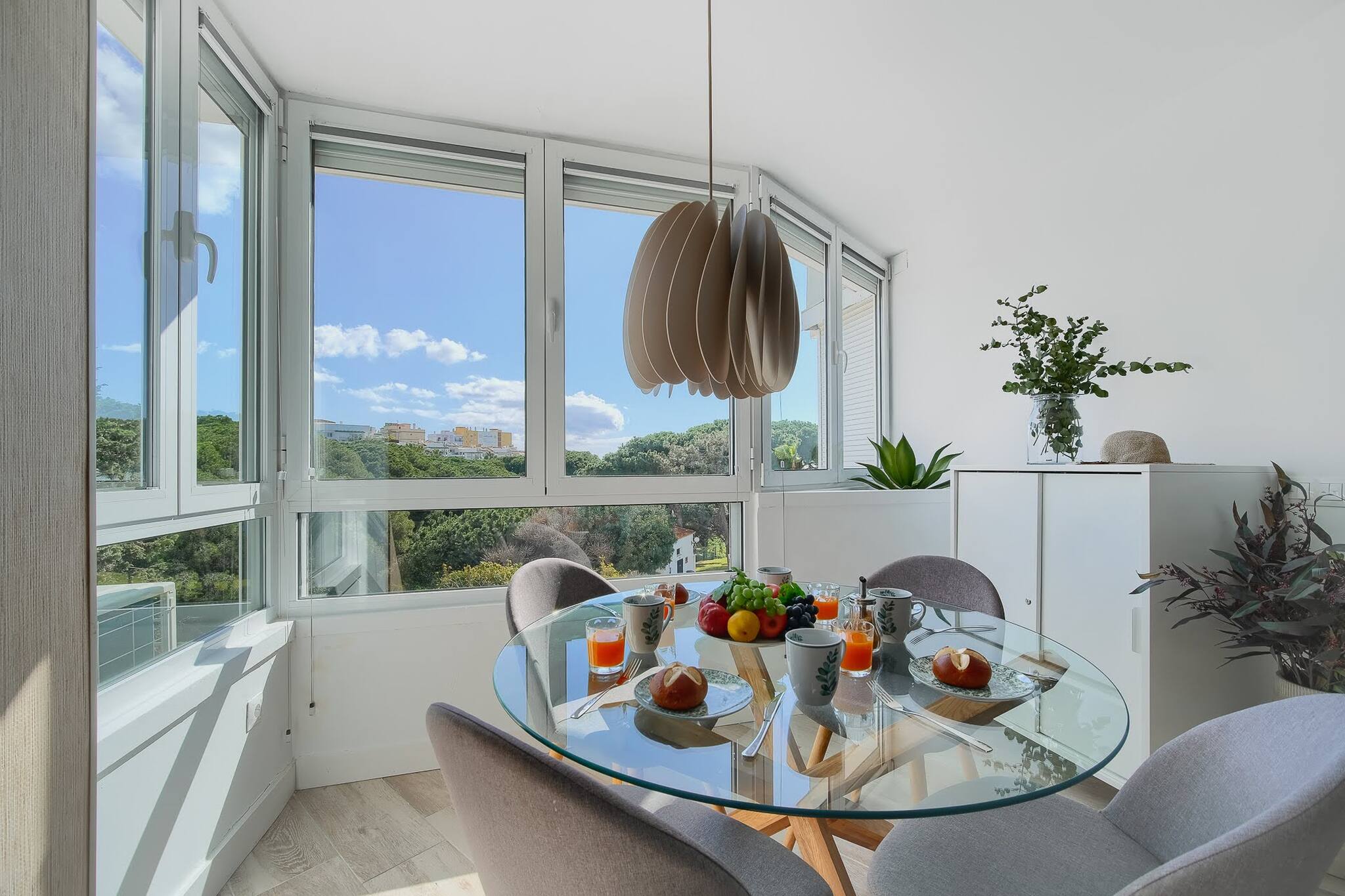 La mesa para 4 comensales se encuentra junto un gran ventanal que ocupa casi toda la pared del fondo. Las vistas al jardín de la urbanización y a la playa desde allí, son bellísimas.