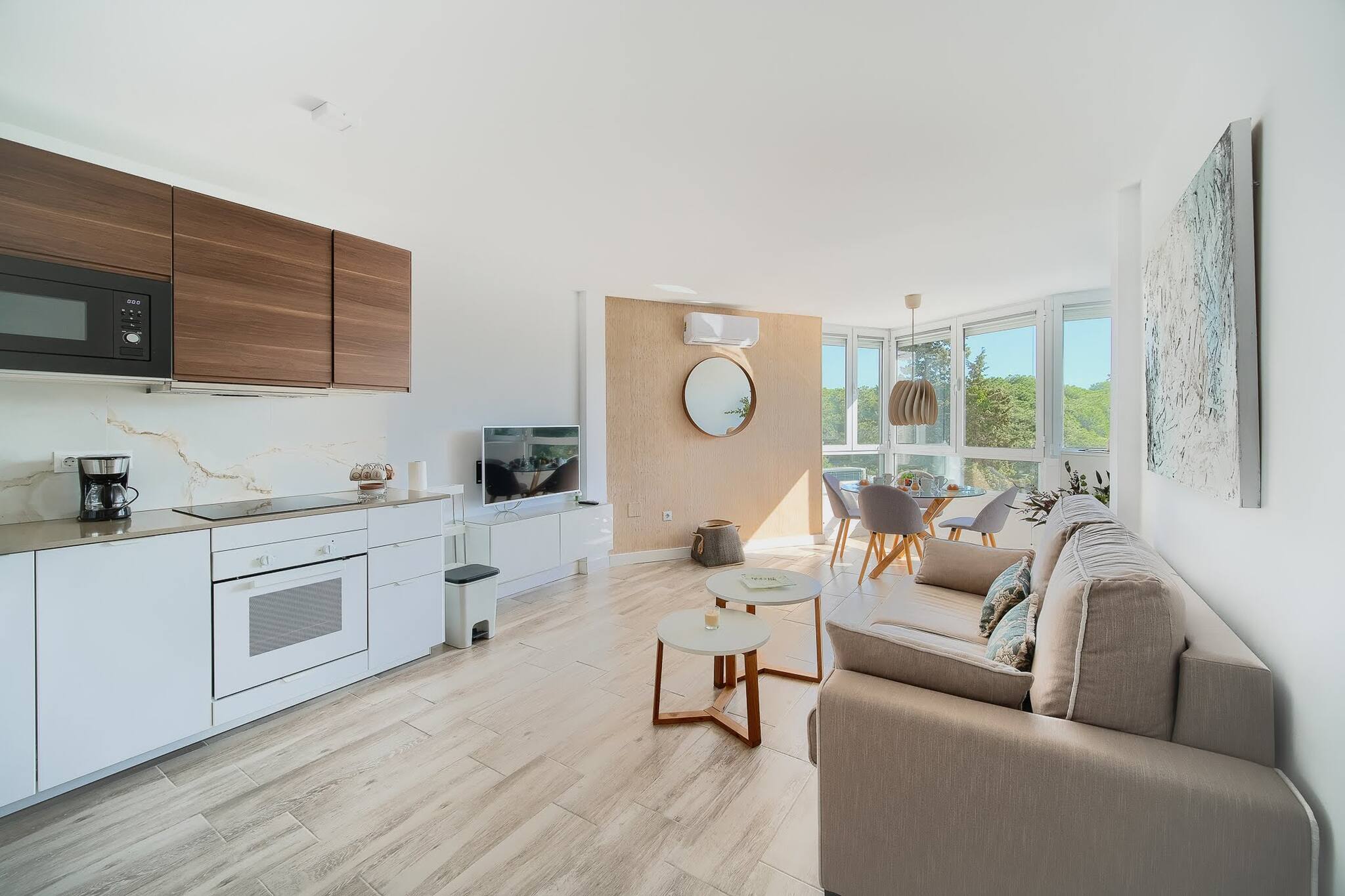 Incluye una cama de matrimonio integrada que se puede guardar fácilmente, transformando el ambiente en una área aún más amplia y versátil. El área de salón cuenta con un cómodo sofá-cama donde pueden dormir 2 huéspedes más, y una Smart TV.