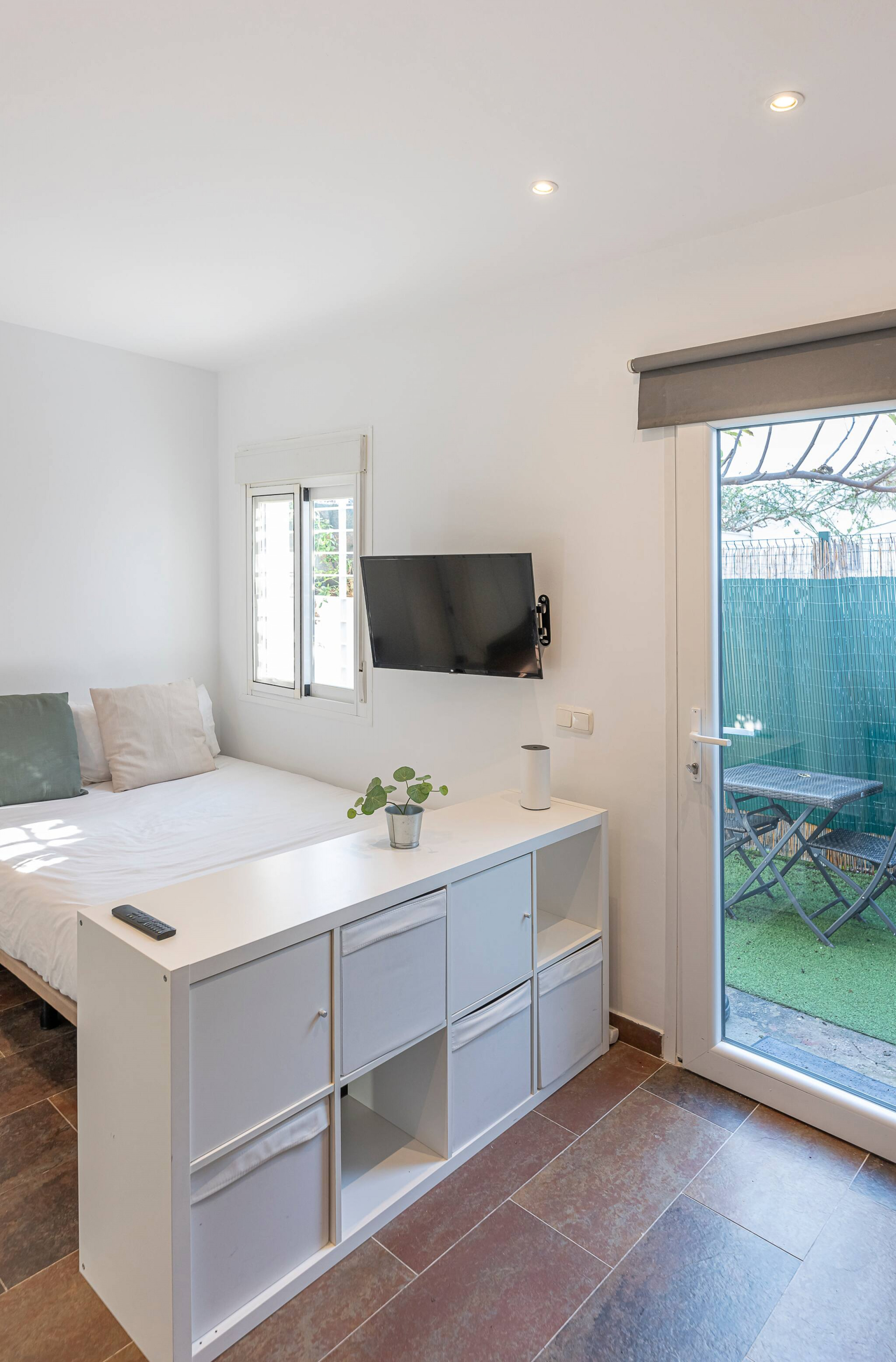 >Espacio de descanso: La zona de descanso, separada del salón por un práctico mueble para guardar tus pertenencias, cuenta con una cómoda cama doble con mesa de noche con una lámpara. También dispone de un Smart TV para un momento de entretenimiento.