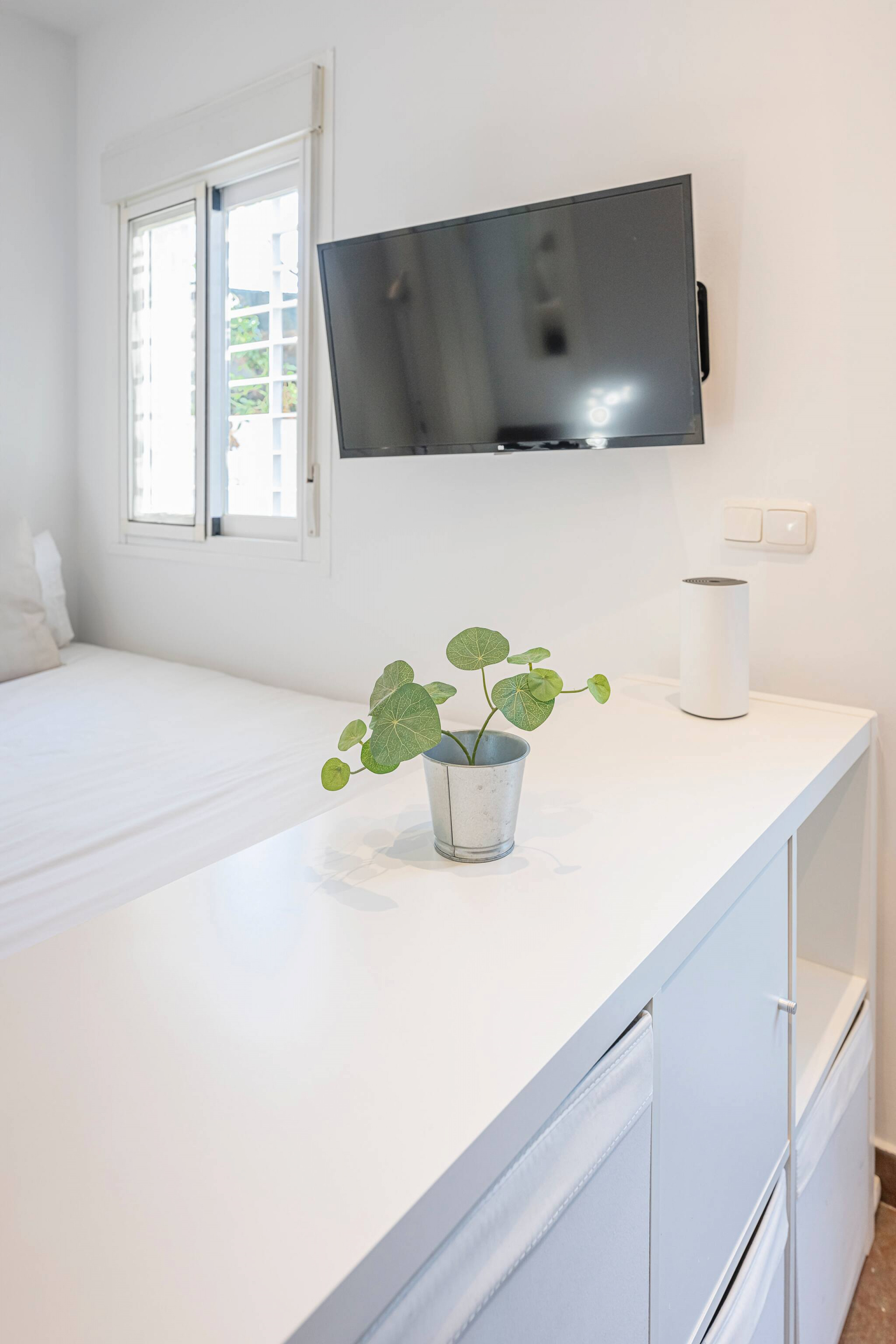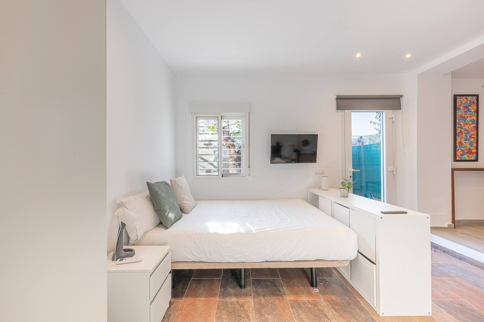 > Dormitorio: Dormitorio luminoso y acogedor con cama doble de 135 cm, ideal para un descanso reparador. El espacio cuenta además con un sofá individual, televisión de pantalla plana y acceso directo al balcón, lo que permite disfrutar de abundante luz natural y de un ambiente relajante.