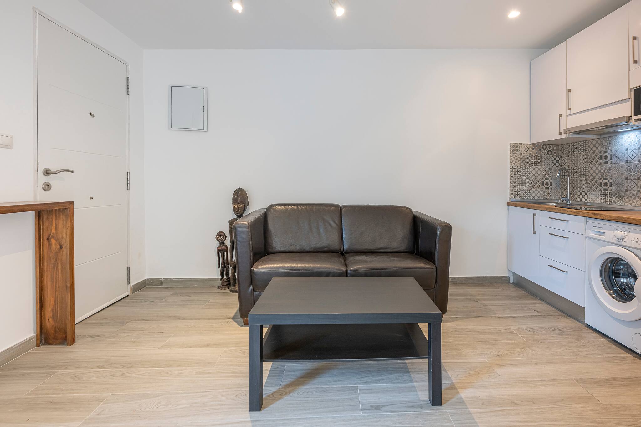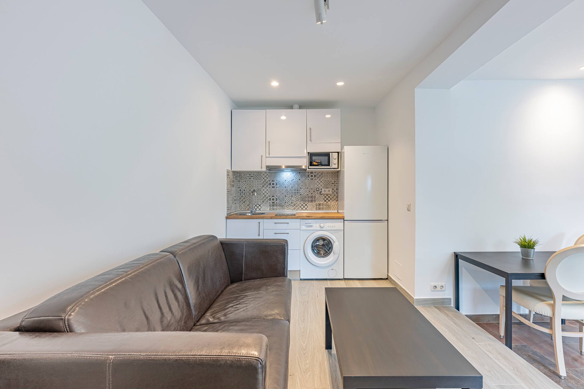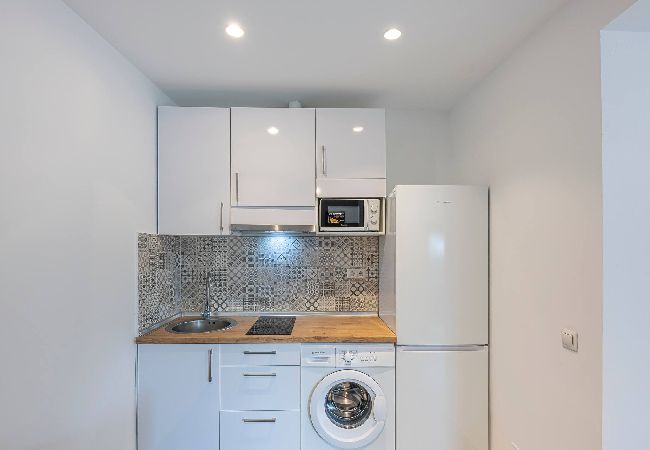 - Cocina: A la entrada, encontrarás una cocina equipada con dos hornallas de vitrocerámica, microondas, cafetera Dolce Gusto (y otra de estilo italiana), hervidor de agua, un pequeño congelador y todos los utensilios necesarios para preparar comidas caseras. También cuenta con una mesa para dos comensales, perfecta para disfrutar de tus platos en compañía.
