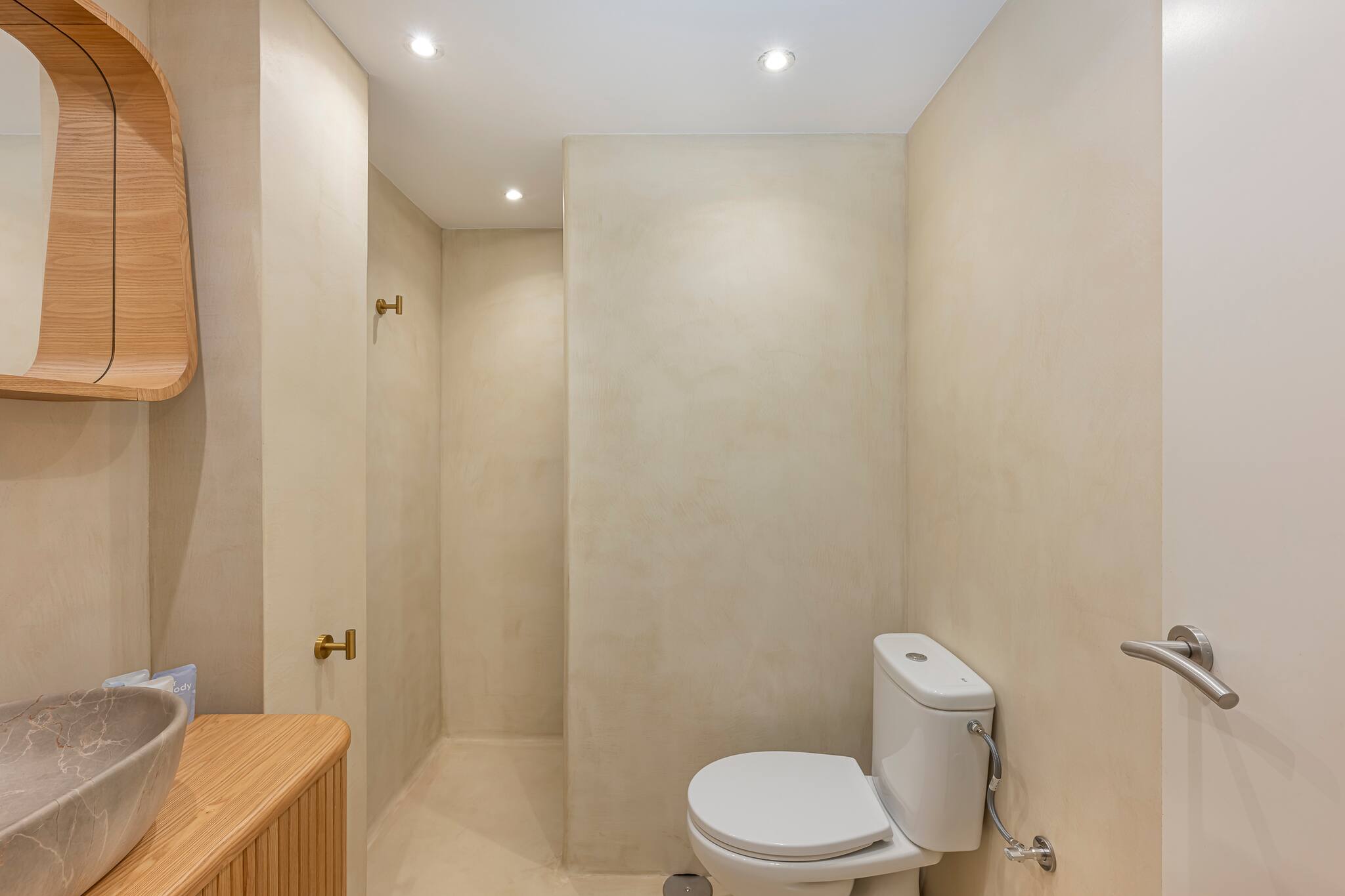 El cómodo baño en tonos naturales tiene una ducha con mampara de vidrio, inodoro, lavabo, secador de pelo y espacio de guardado.