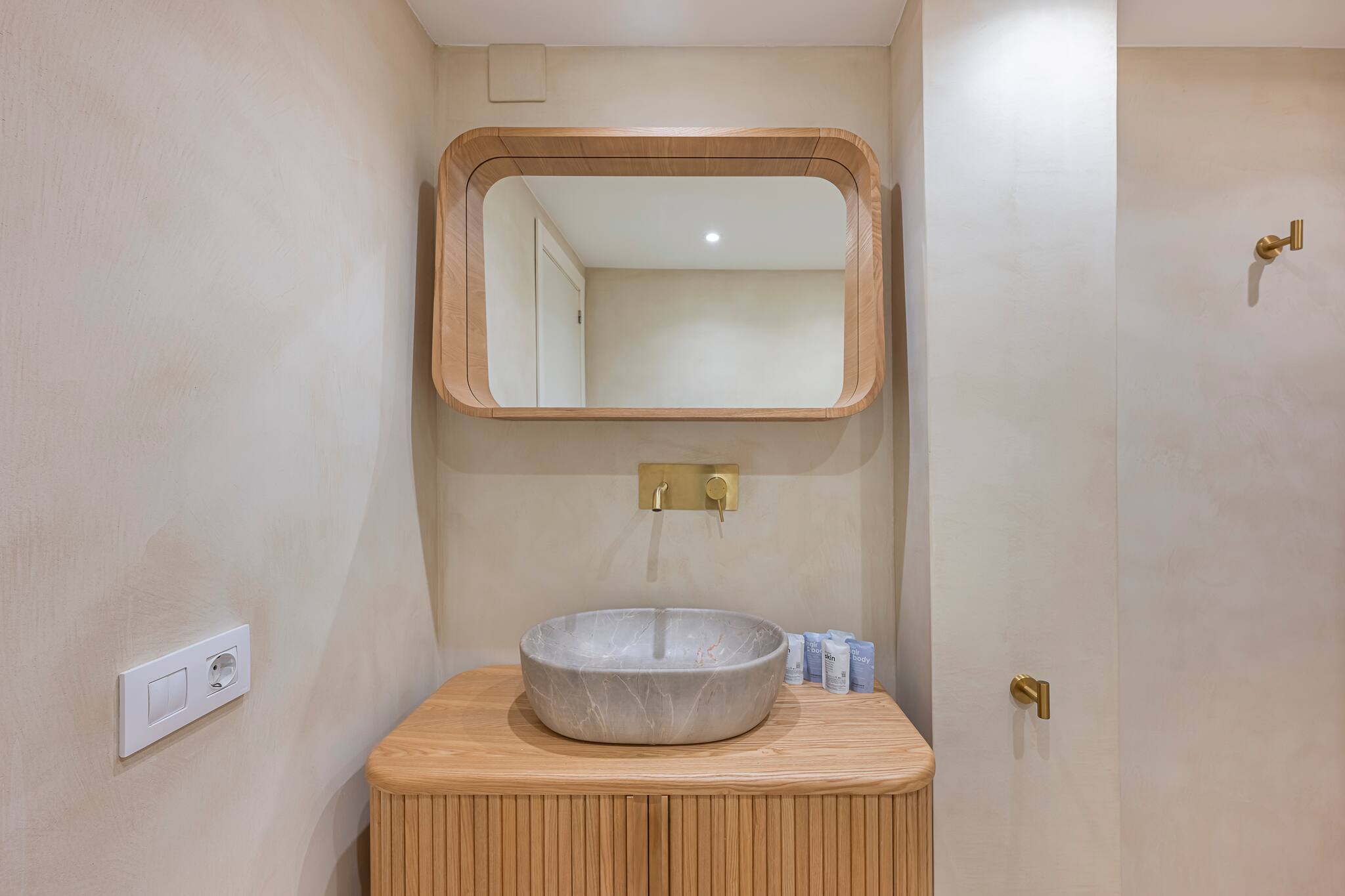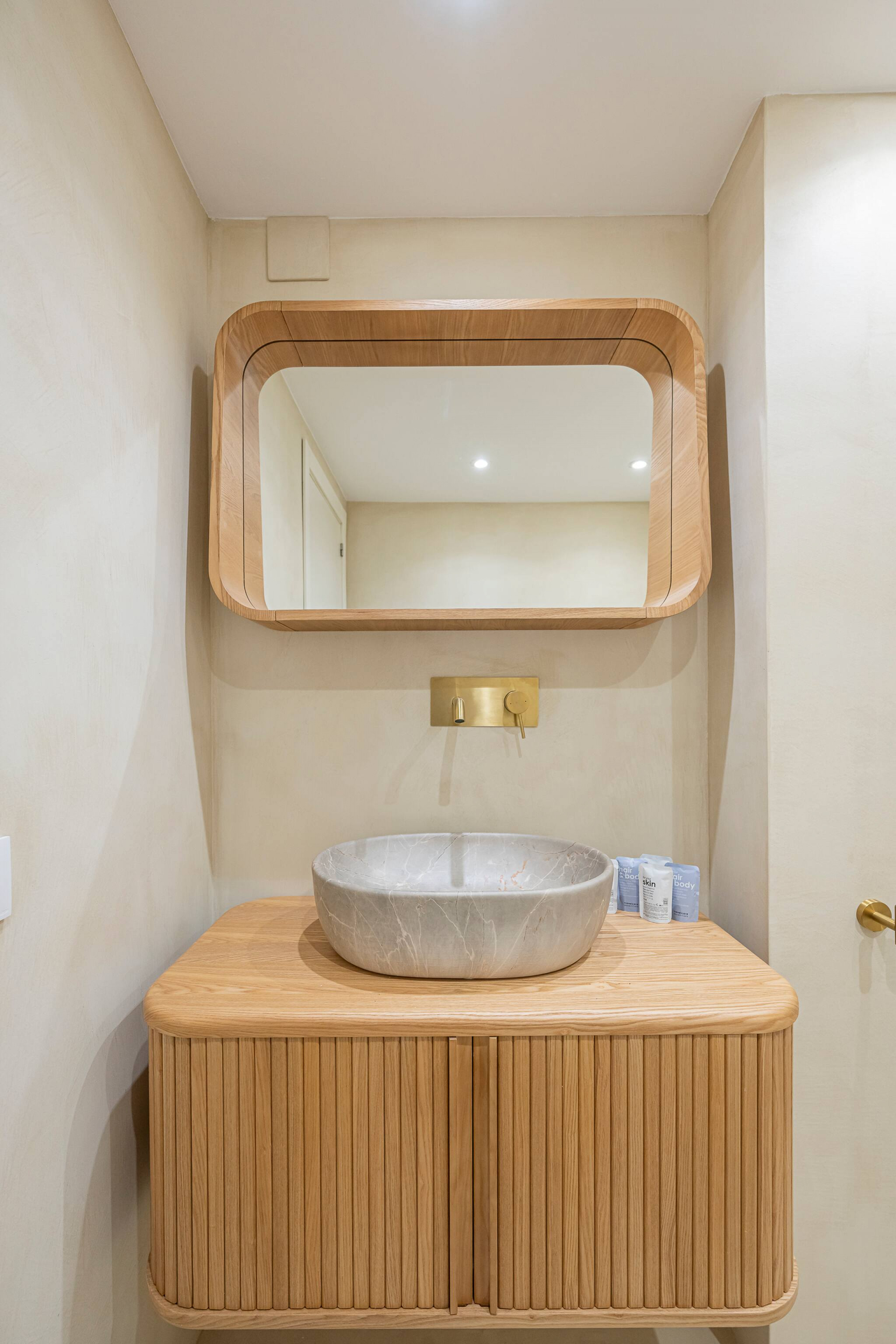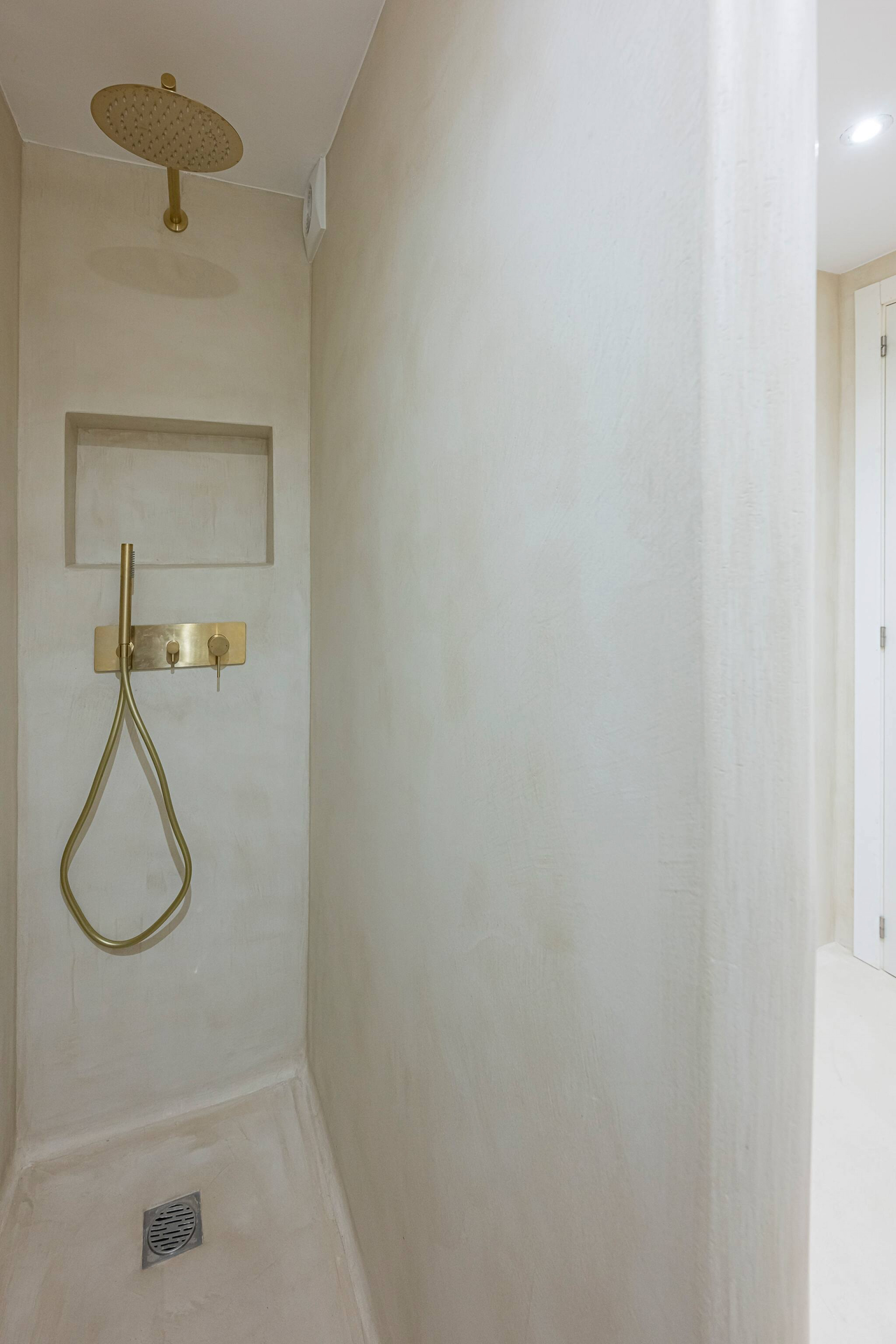 > Este baño combina paredes en tonos neutros con acabados dorados y madera cálida, logrando un equilibrio entre modernidad y confort. La iluminación sutil realza la textura de los materiales y convierte la ducha y el lavabo de mármol en un rincón sofisticado para el cuidado personal.