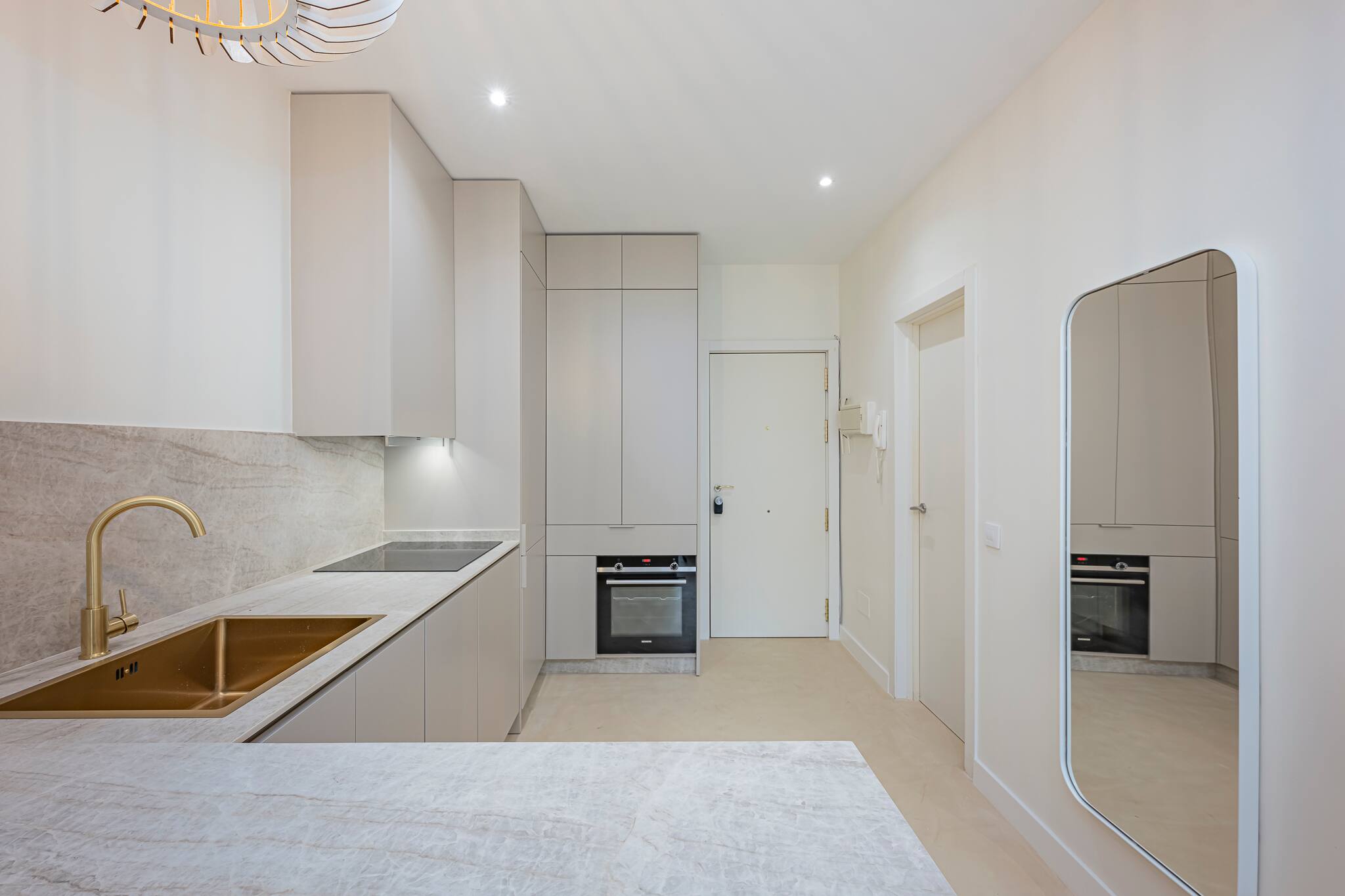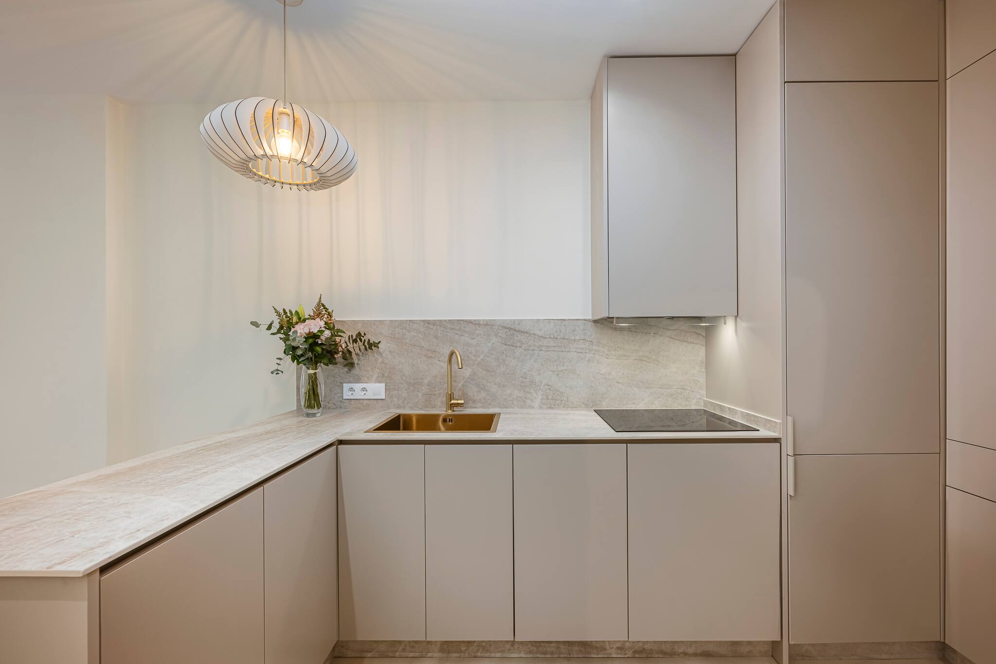 > Elegante cocina integrada, con líneas minimalistas y acabados de calidad. Dispone de vitrocerámica, horno, microondas y amplia capacidad de almacenaje, pensada para que disfrutes de la practicidad sin renunciar al diseño.