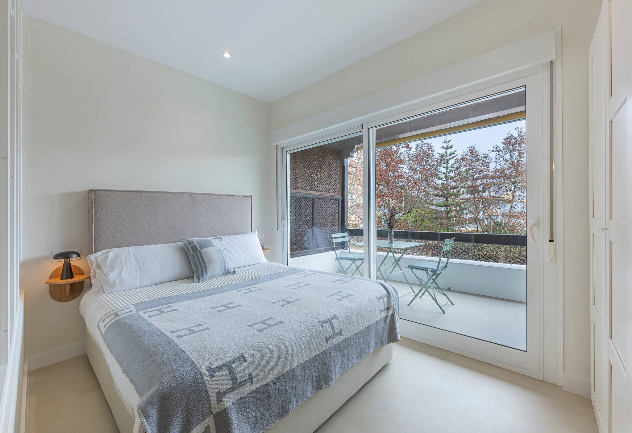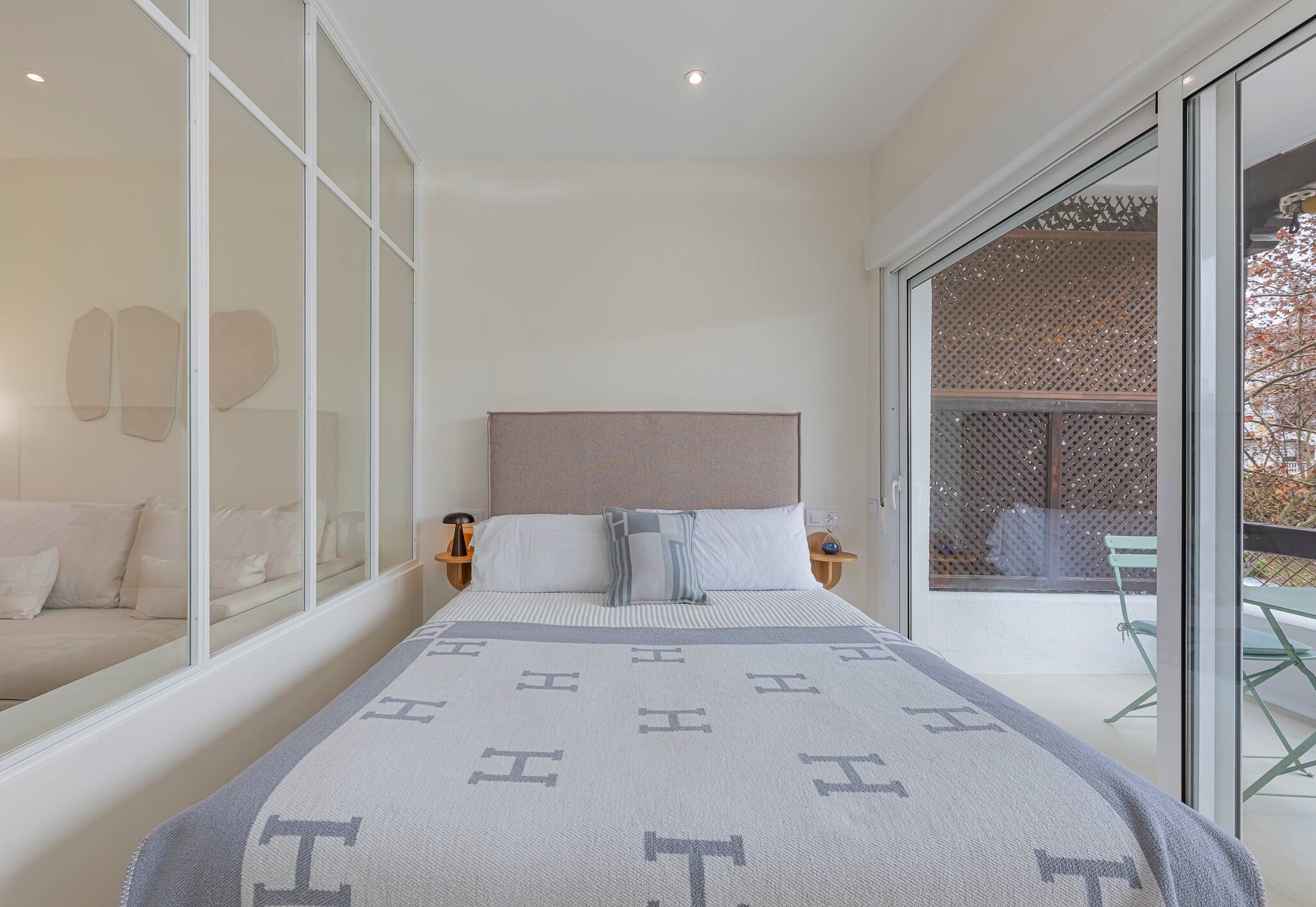 > Acogedor dormitorio con cama doble de 135 cm, pensado para brindar comodidad y tranquilidad. Dispone de un espejo y una TV para momentos de relax. Sus amplios ventanales ofrecen salida directa al balcón y llenan la estancia de luz natural durante todo el día.