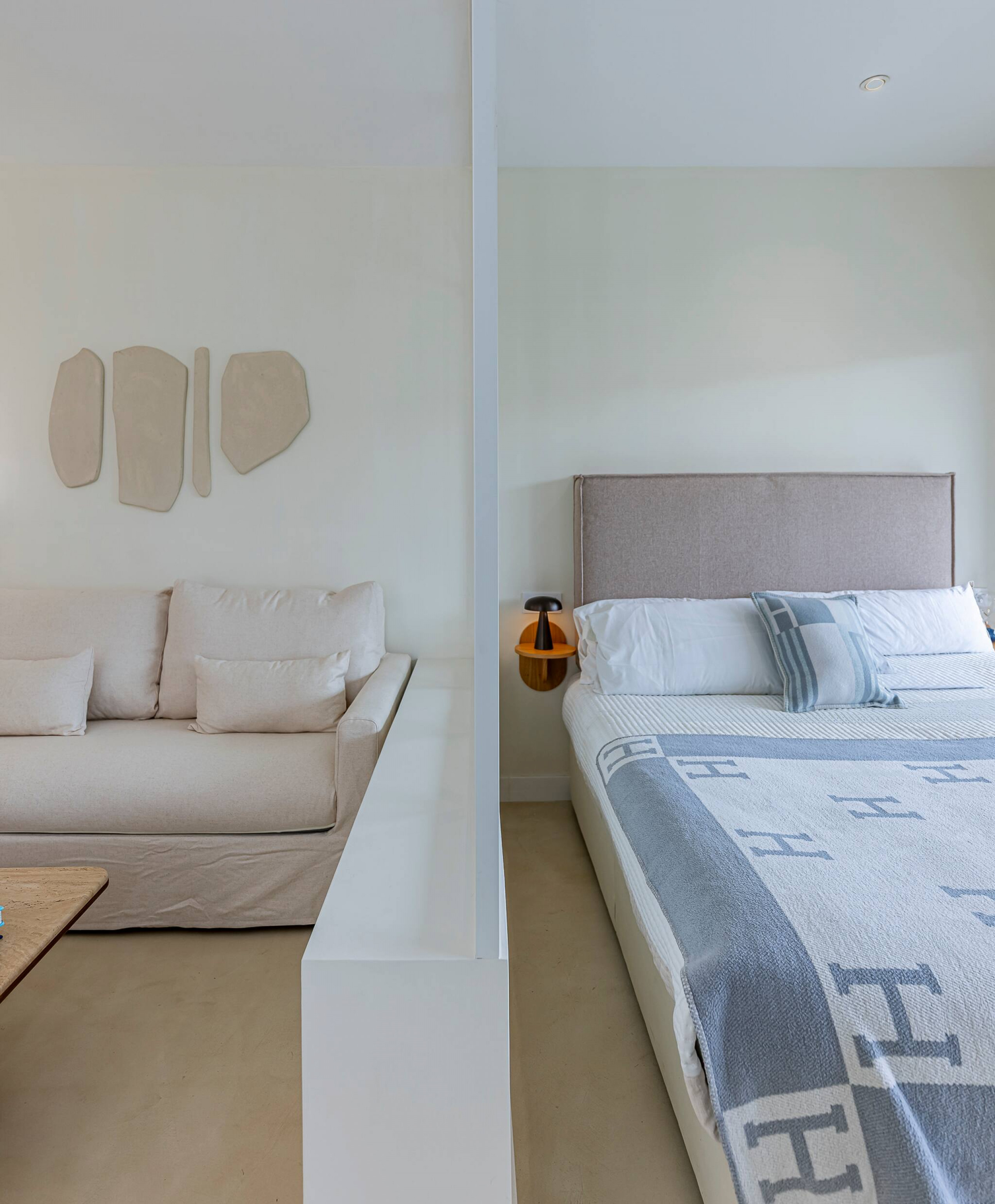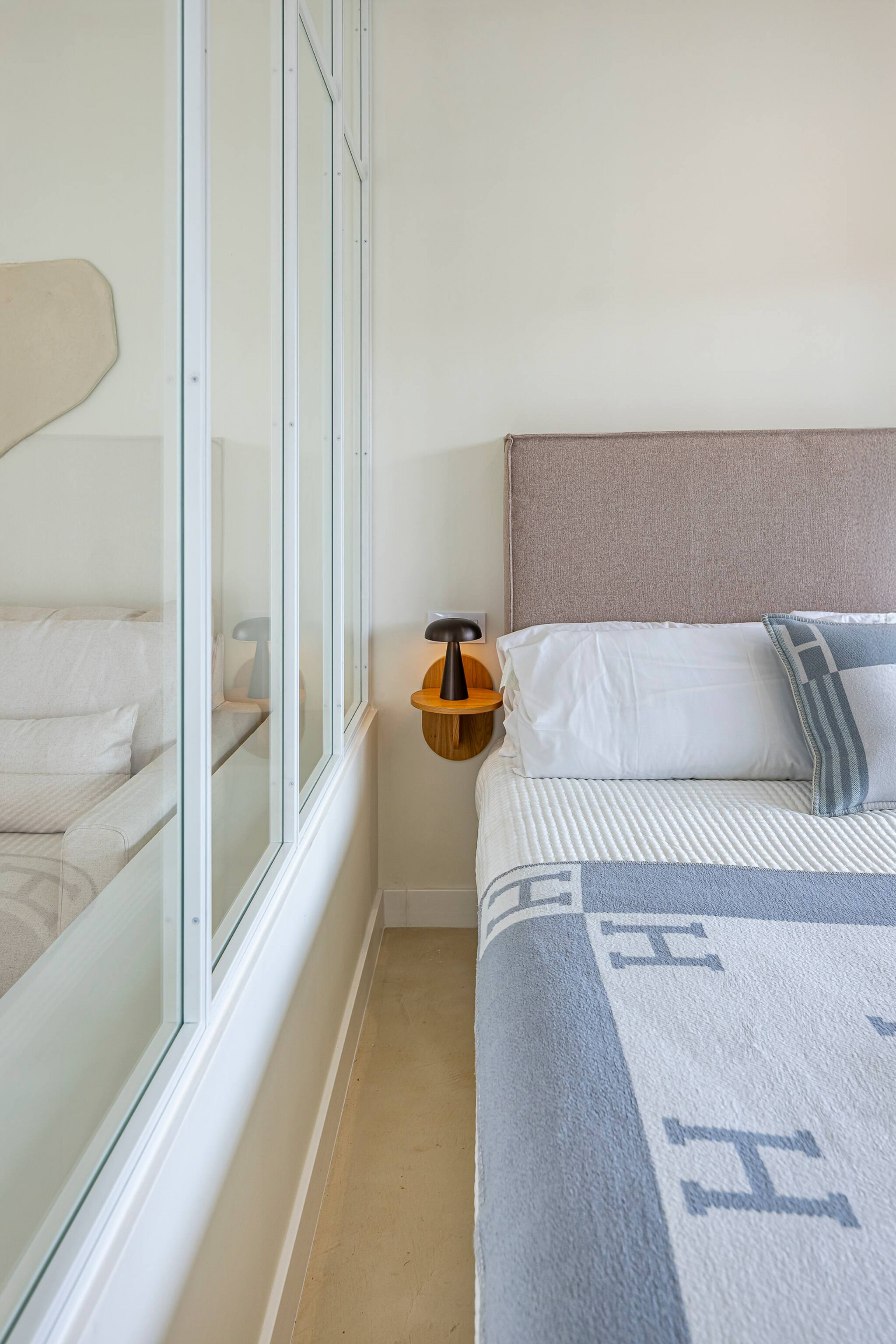 El interior está pensado al detalle: cuenta con aire acondicionado, calefacción central y una cocina americana totalmente equipada con electrodomésticos de alta gama, incluyendo lavavajillas y horno. El dormitorio, integrado con elegancia mediante un cerramiento acristalado, ofrece un ambiente sereno y acogedor.