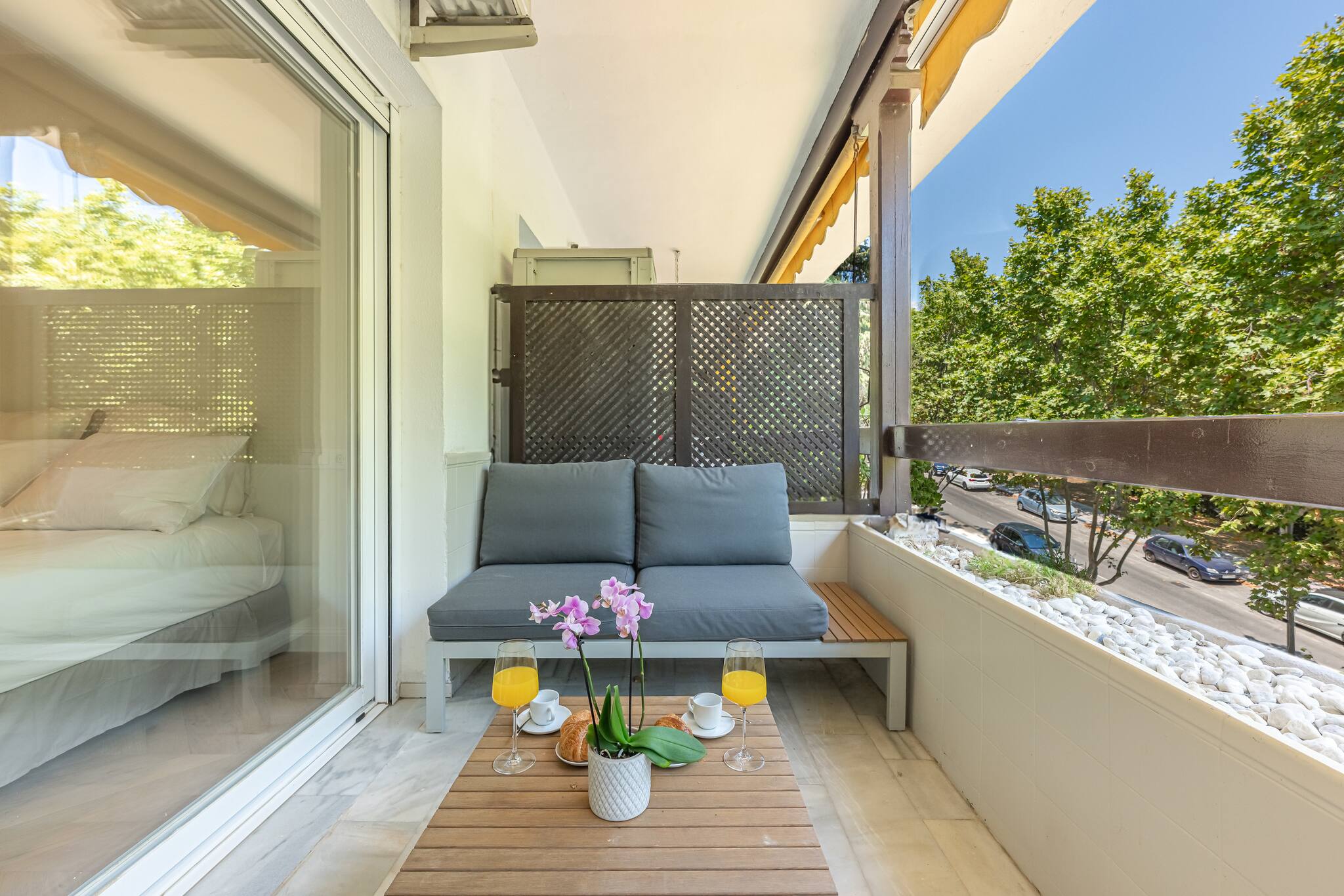 > Amplio balcón rodeado de vegetación, equipado con un cómodo sofá ideal para relajarse al aire libre. Es el espacio perfecto para leer, descansar o disfrutar de la brisa mediterránea en un entorno tranquilo.