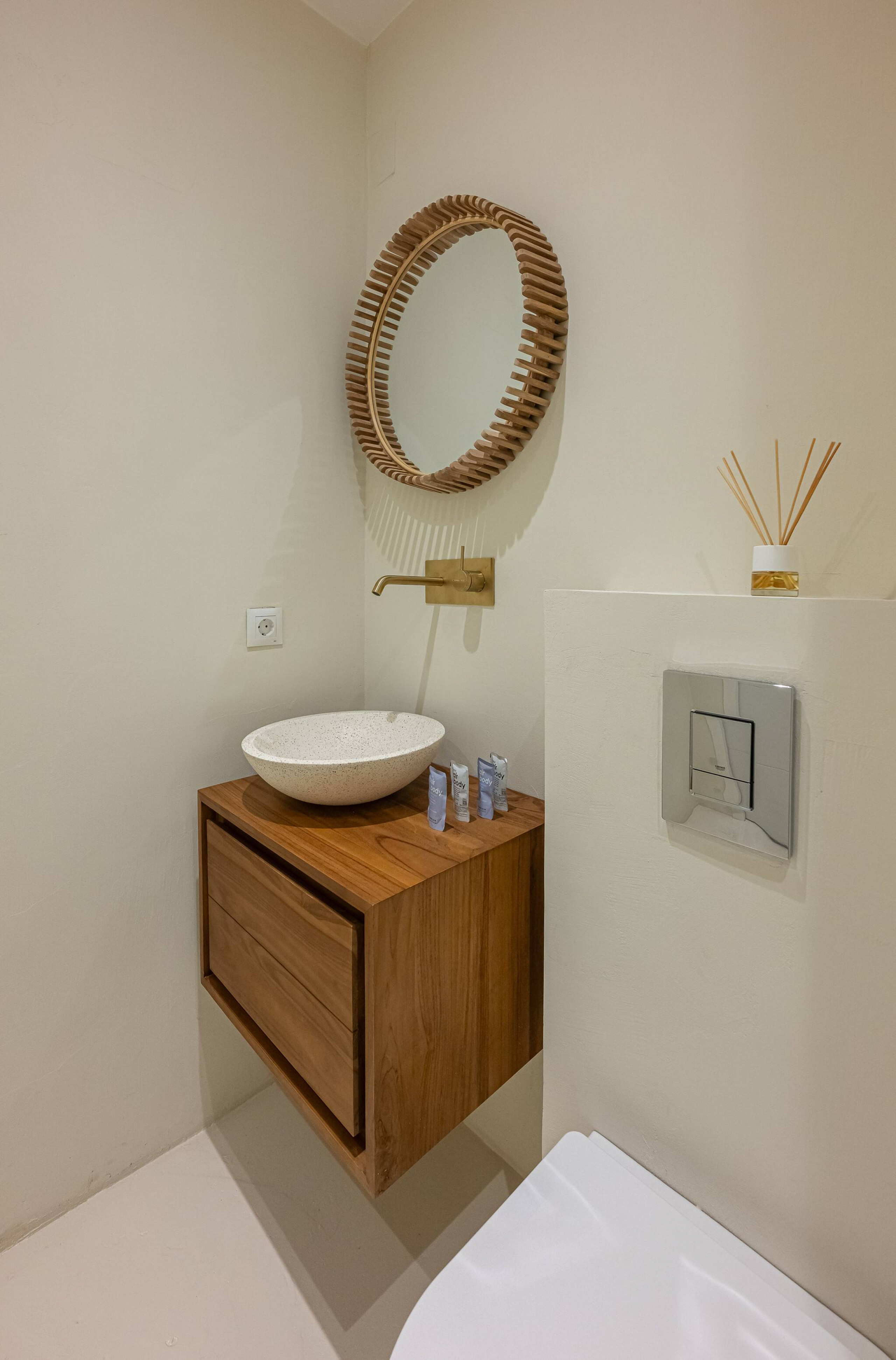 > Este baño combina paredes en tonos neutros con acabados dorados y madera cálida, logrando un equilibrio entre modernidad y confort. La iluminación sutil realza la textura de los materiales y convierte la ducha y el lavabo de mármol en un rincón sofisticado para el cuidado personal.