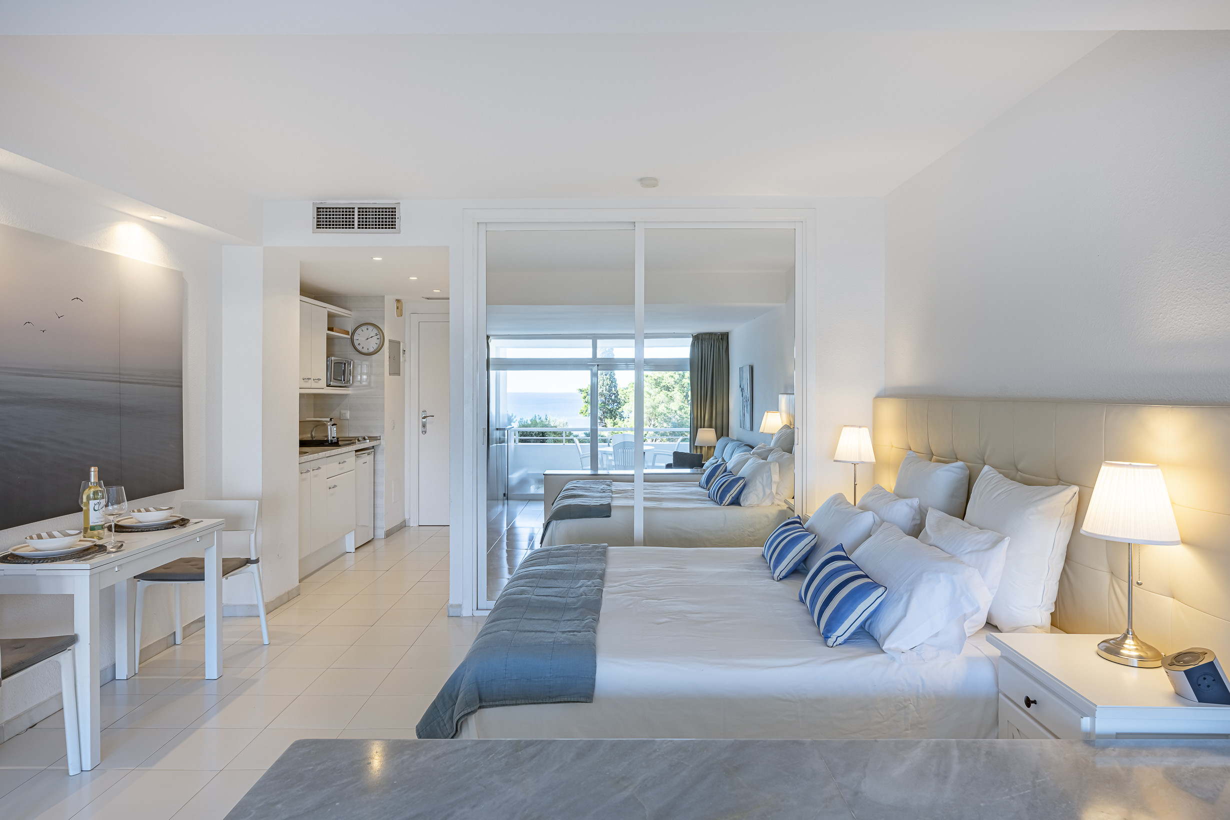 Un área diáfana y luminosa diseñada para la comodidad. Cuenta con una cama doble de alta calidad y un cómodo sofá cama, con capacidad para hasta 4 huéspedes. La habitación incluye una mesa de comedor y un televisor equipado con Chromecast para su entretenimiento. El acceso directo al balcón garantiza que el espacio esté lleno de luz natural.
