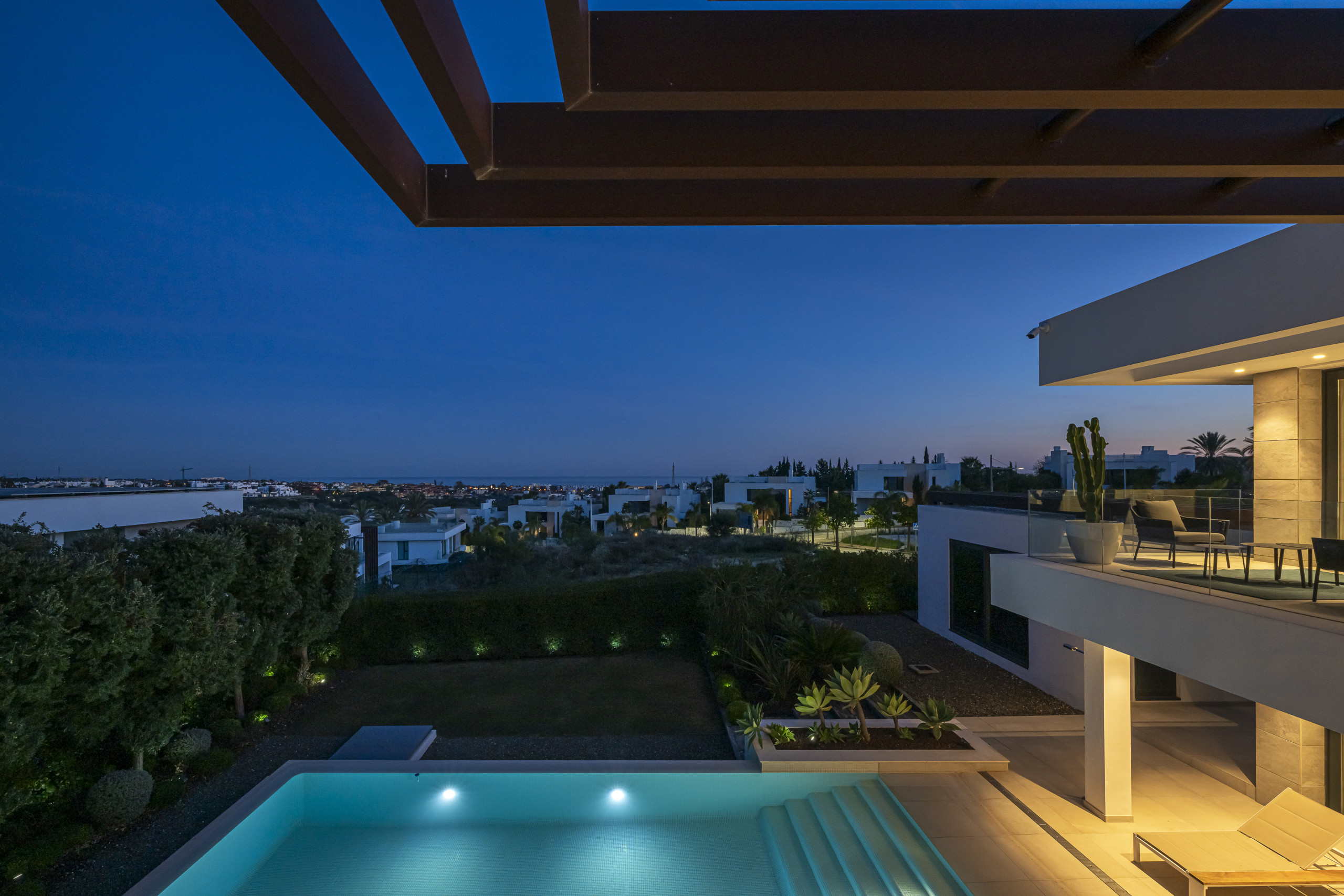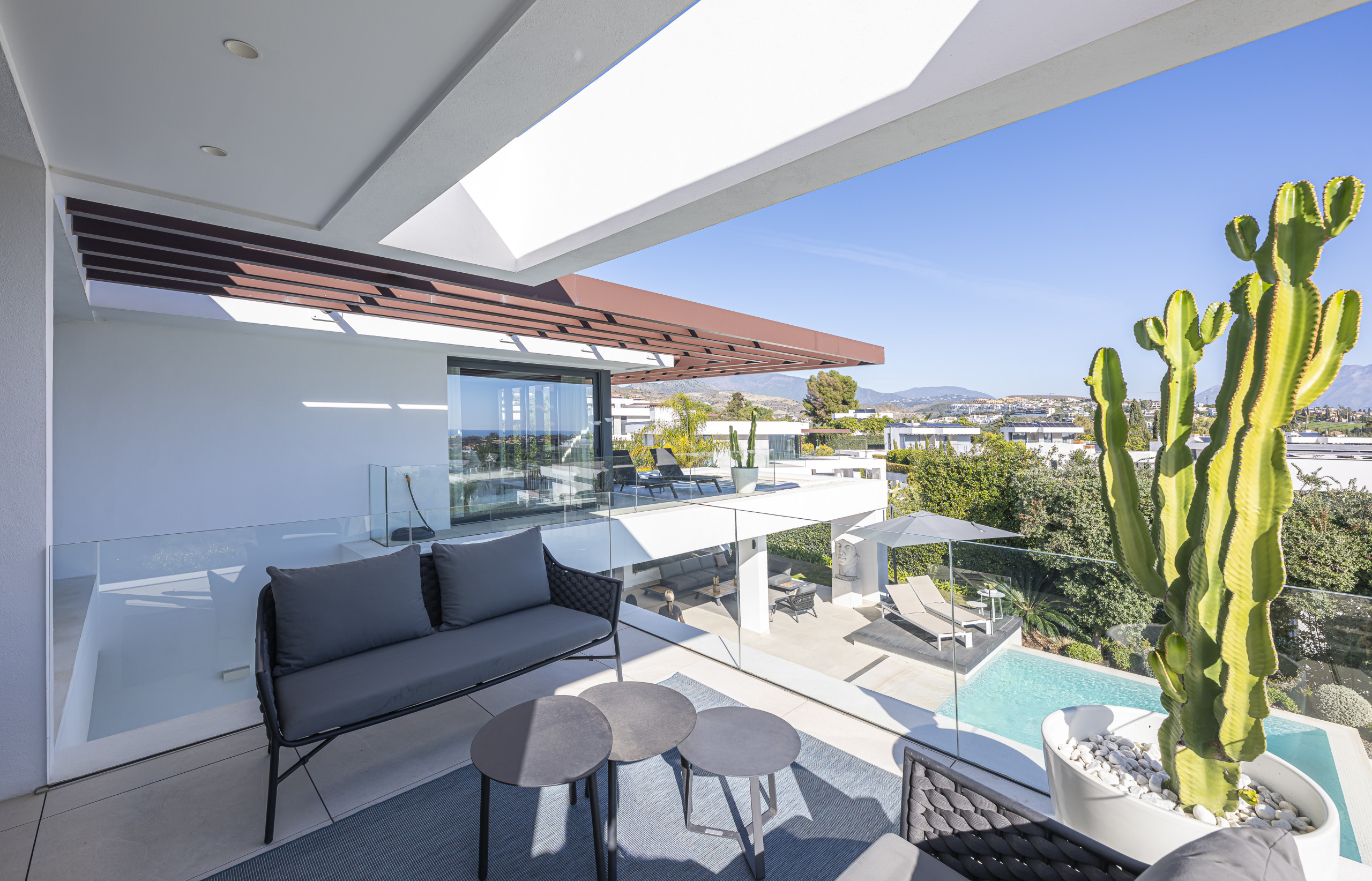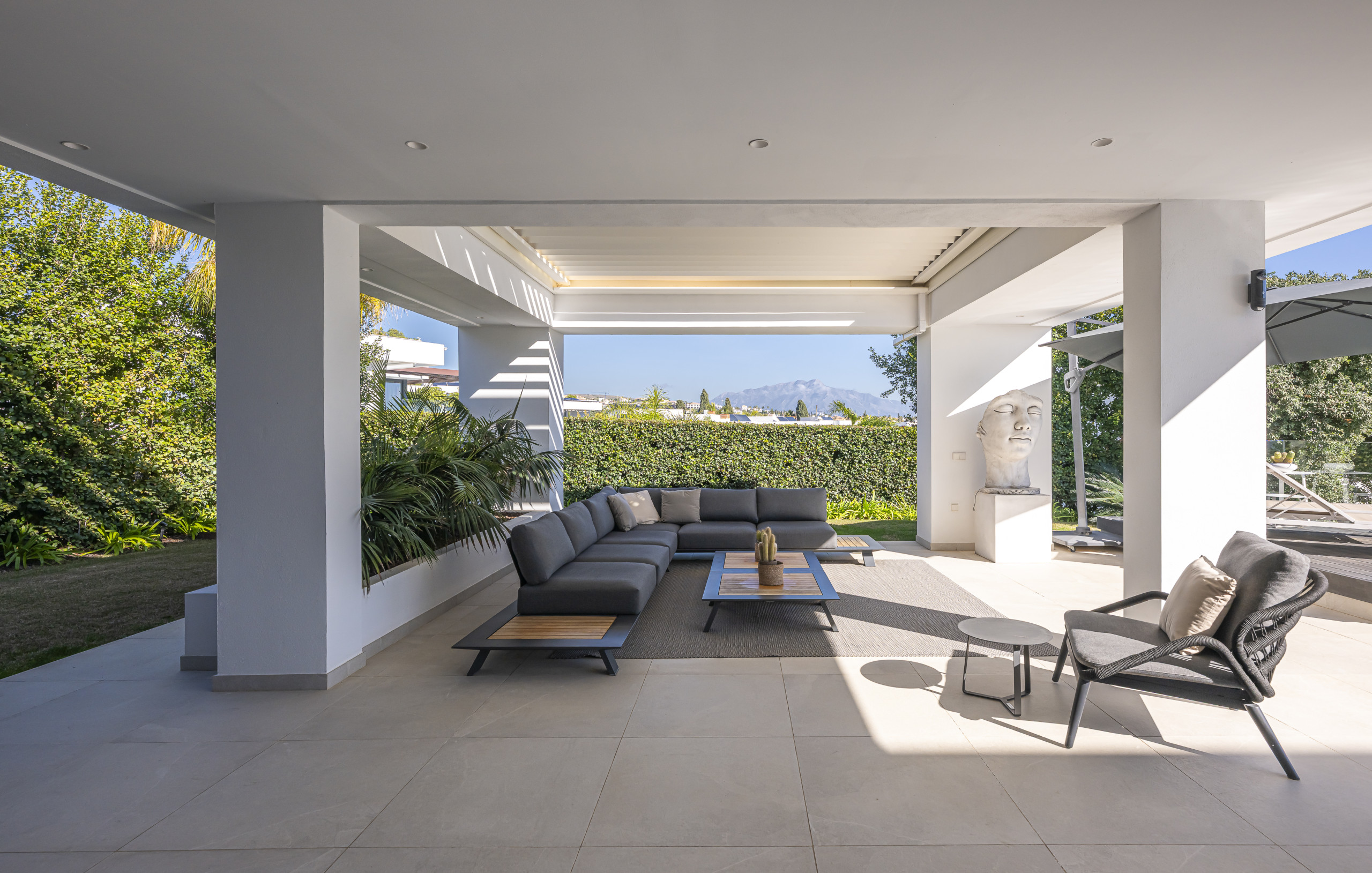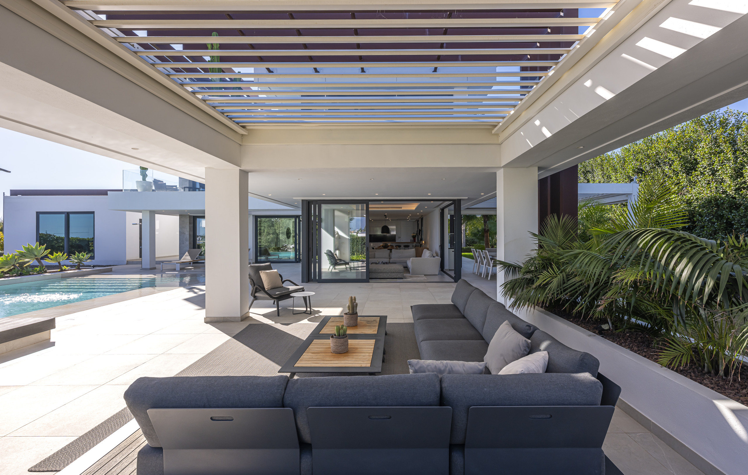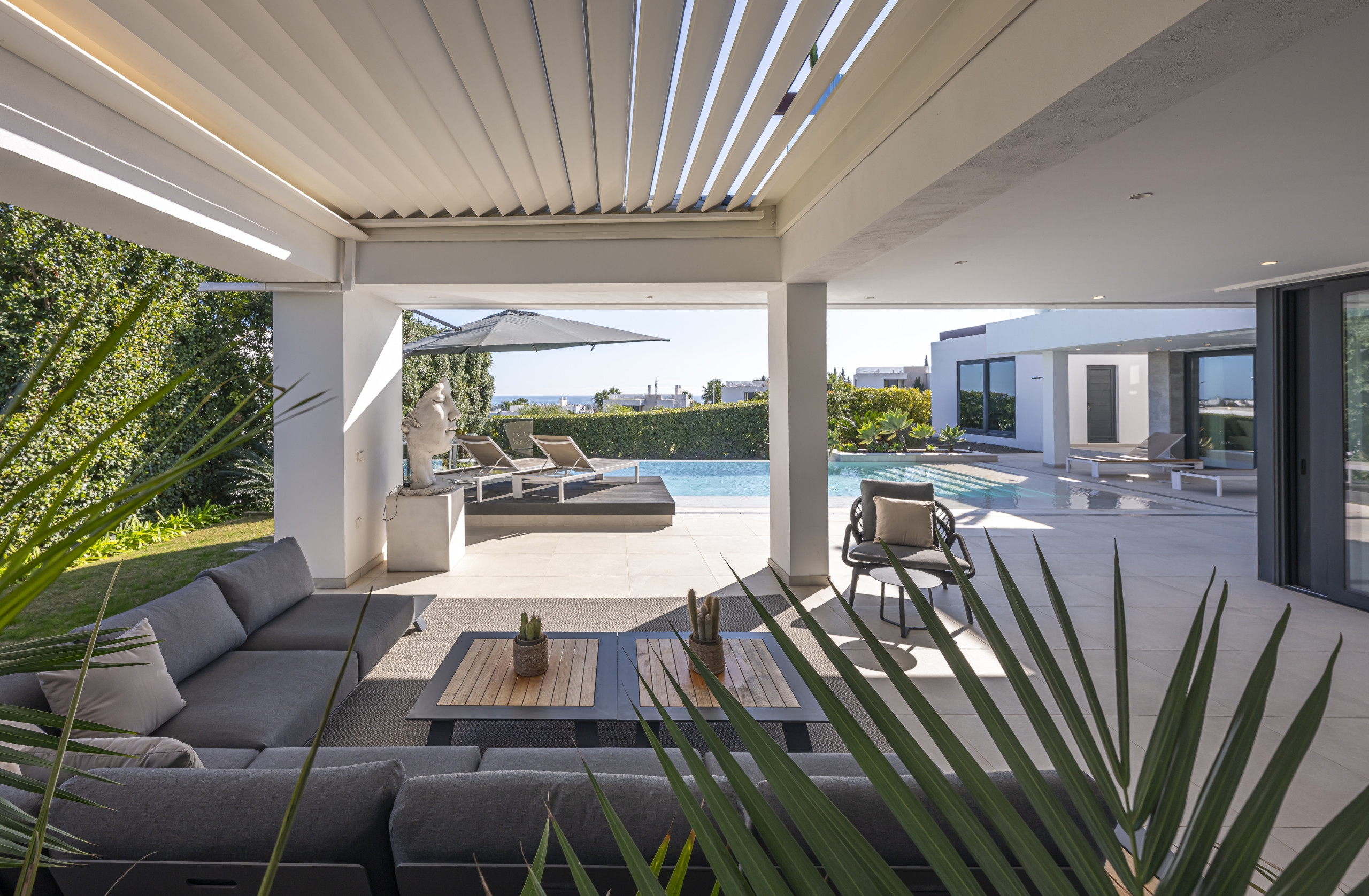 La zona exterior está diseñada para la relajación total. Disfrute de la piscina privada con cómodos tumbonas, un exuberante jardín mediterráneo y una refrescante ducha al aire libre. La pérgola motorizada le permite ajustar la sombra con solo pulsar un botón.