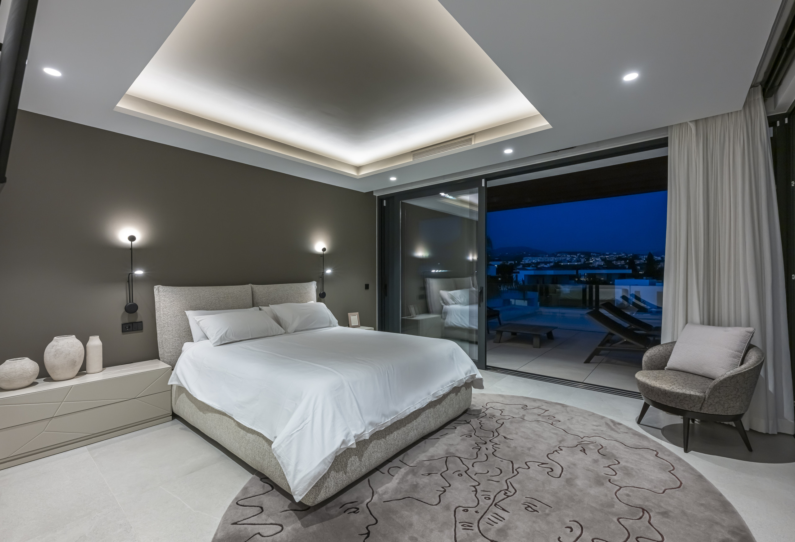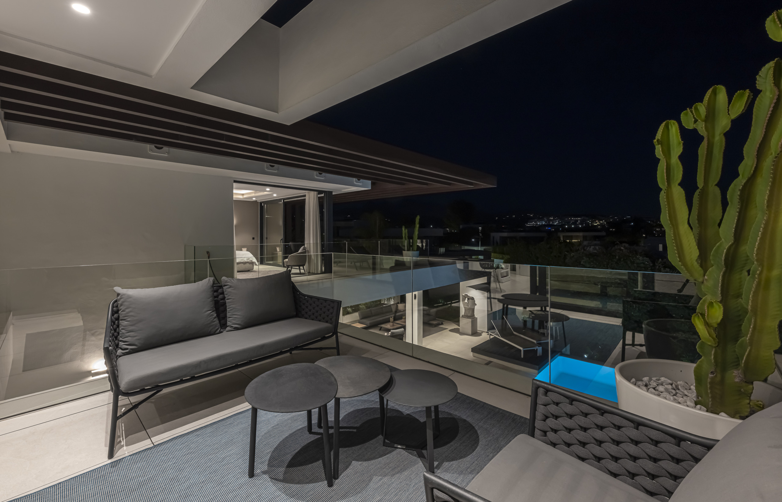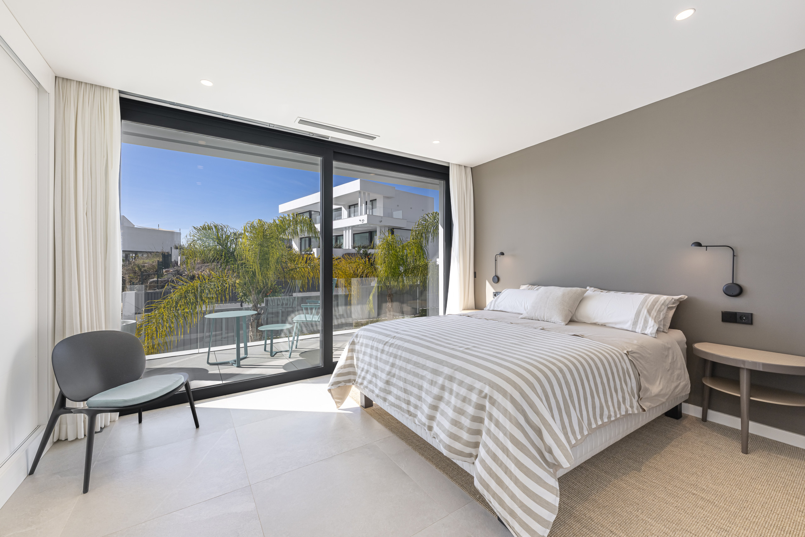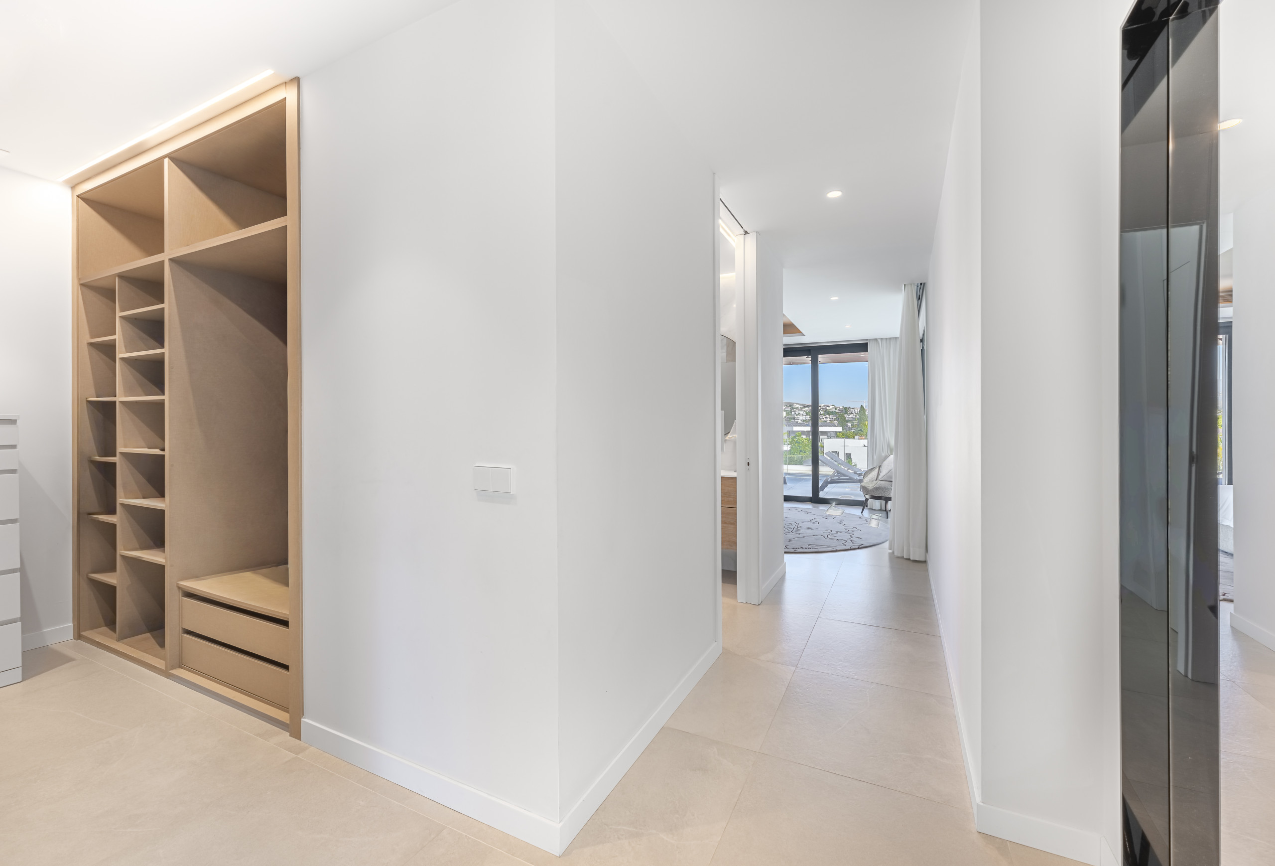 La zona exterior está diseñada para la relajación total. Disfrute de la piscina privada con cómodos tumbonas, un exuberante jardín mediterráneo y una refrescante ducha al aire libre. La pérgola motorizada le permite ajustar la sombra con solo pulsar un botón.