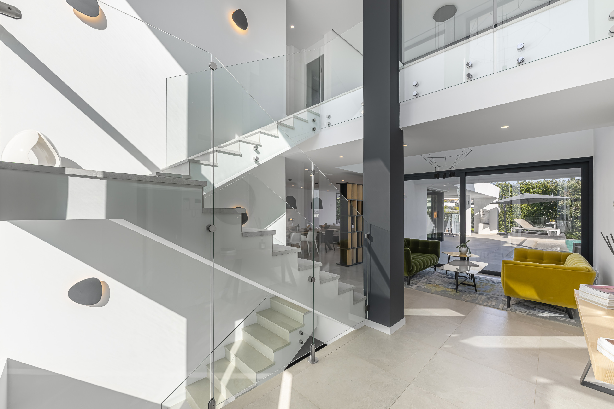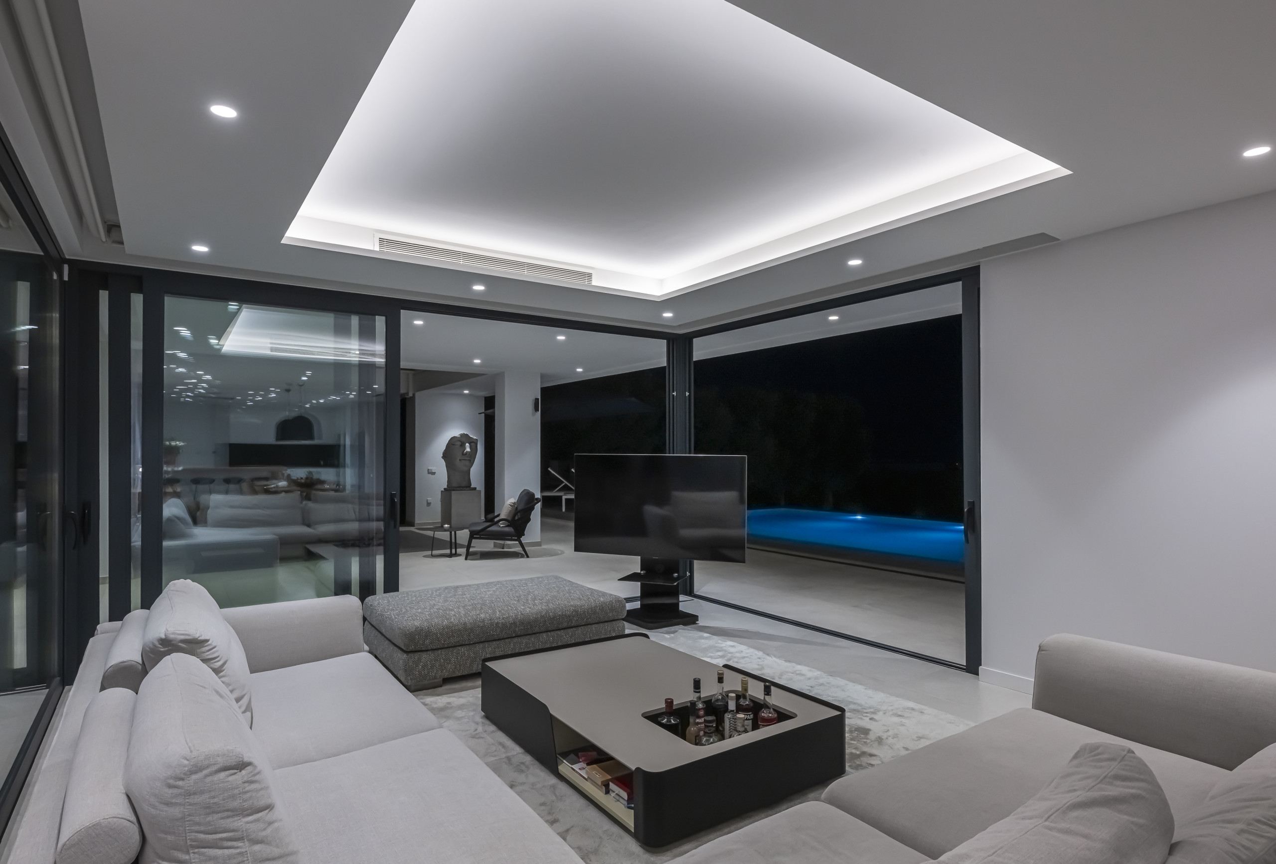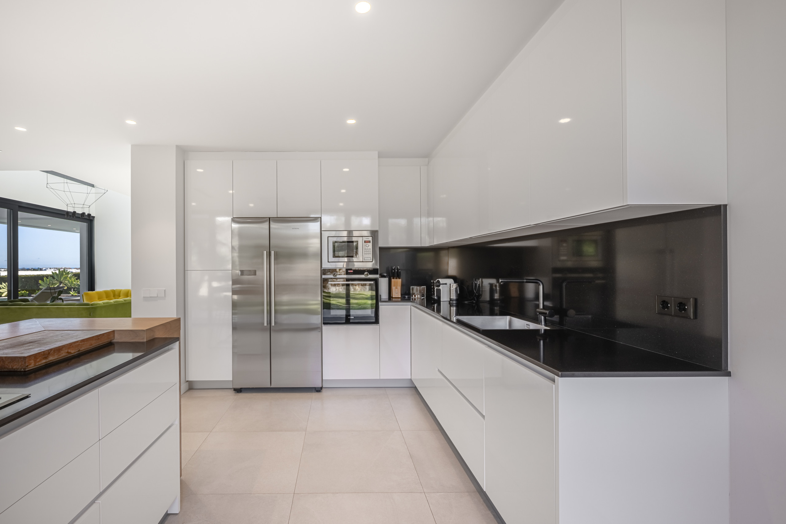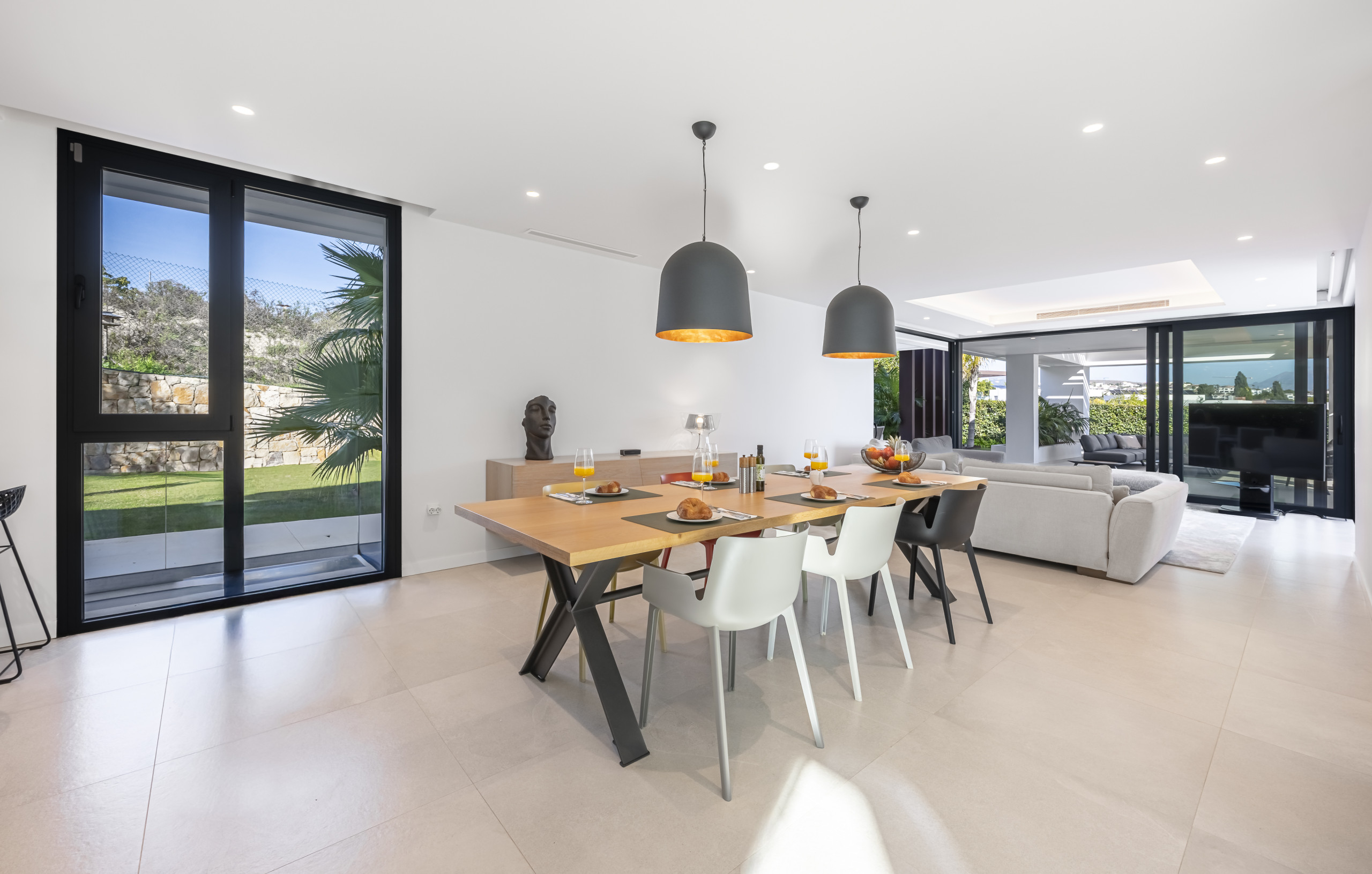 Un amplio y luminoso centro social con techos altos, decoración contemporánea y una gran Smart TV. El área de estar se abre directamente al jardín cuidado y la zona de la piscina a través de enormes puertas de vidrio, creando una conexión perfecta con el exterior.