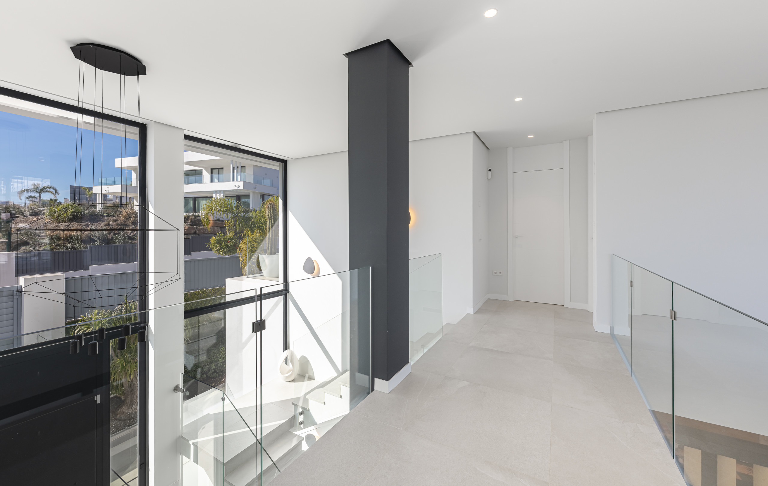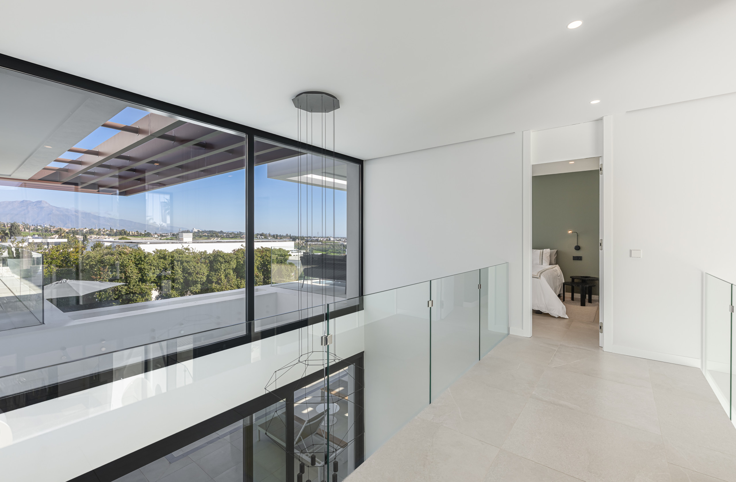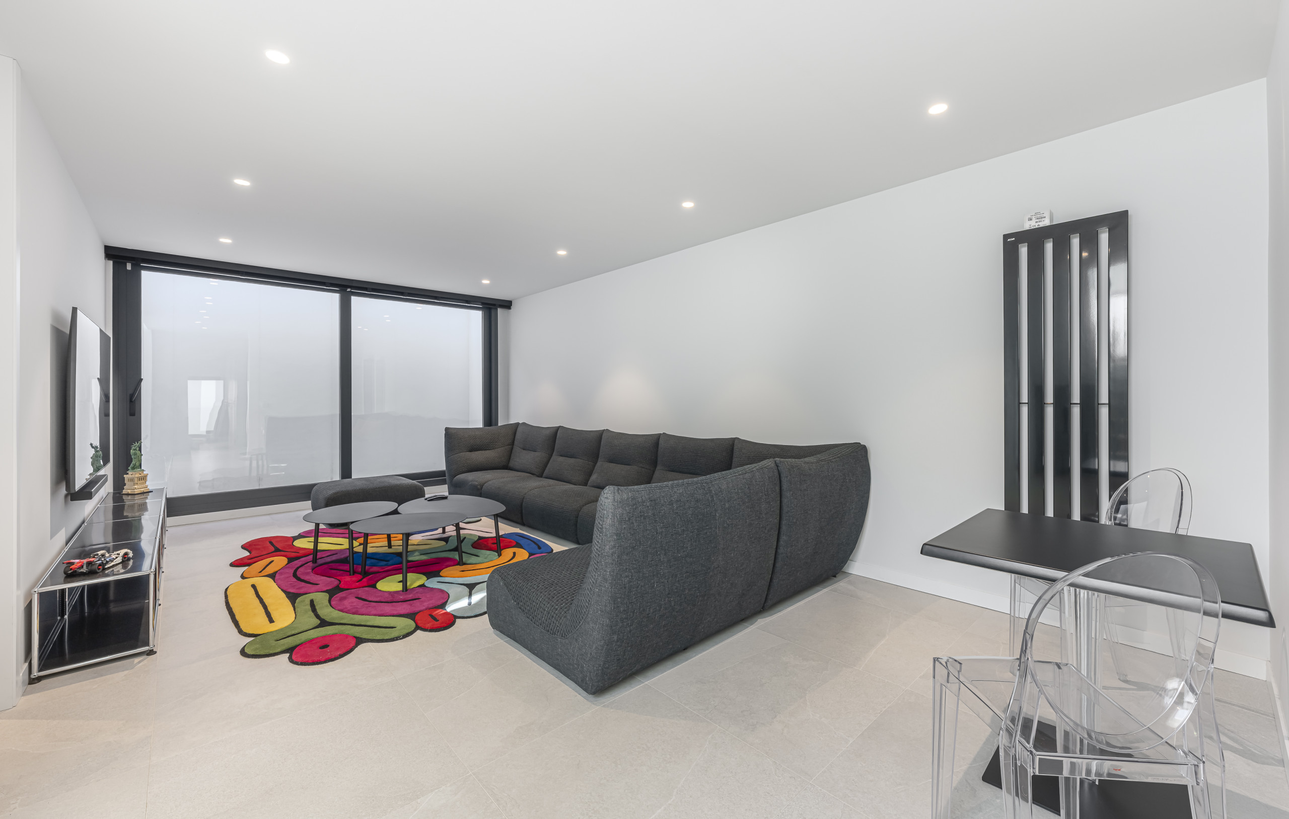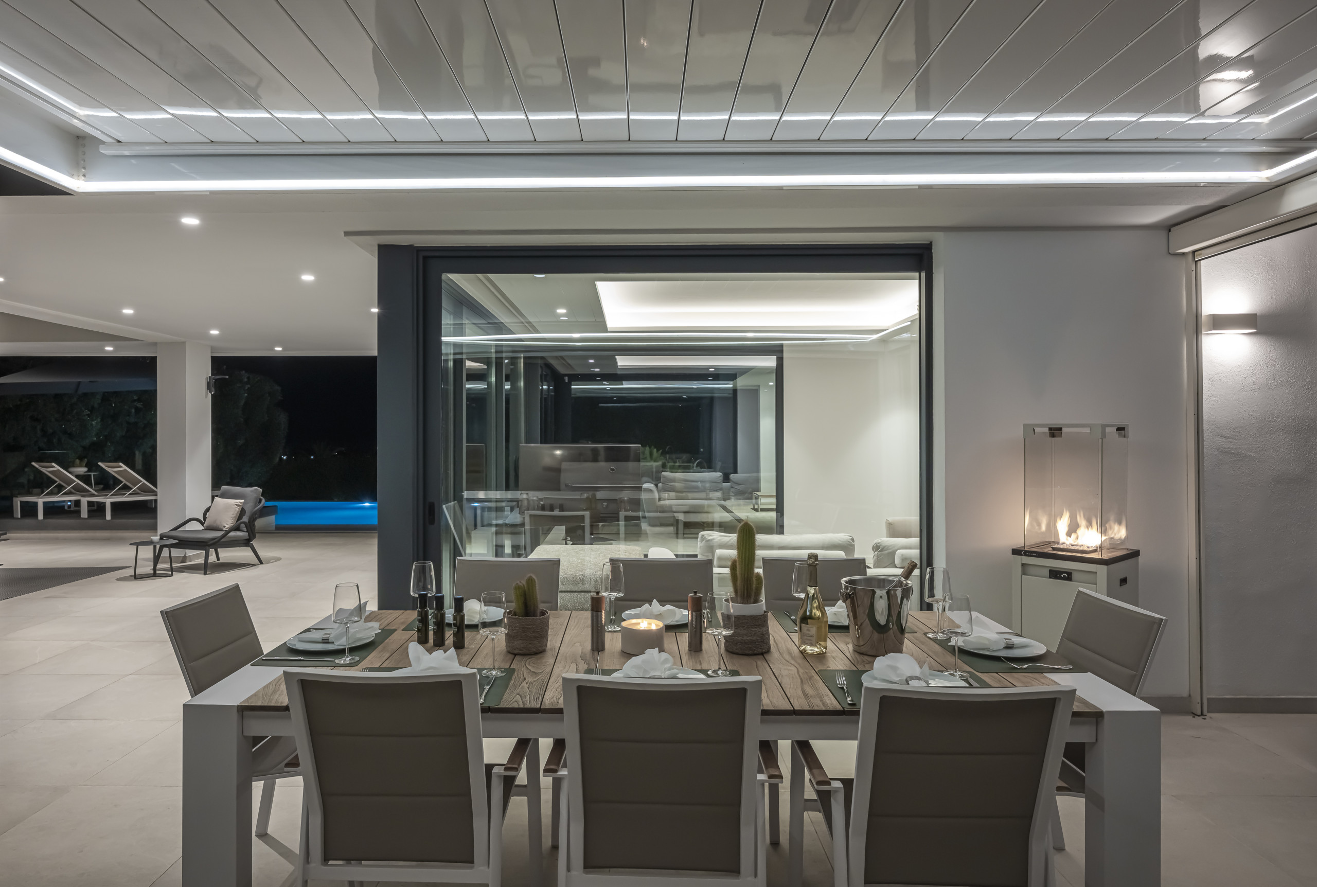 Un amplio y luminoso centro social con techos altos, decoración contemporánea y una gran Smart TV. El área de estar se abre directamente al jardín cuidado y la zona de la piscina a través de enormes puertas de vidrio, creando una conexión perfecta con el exterior.