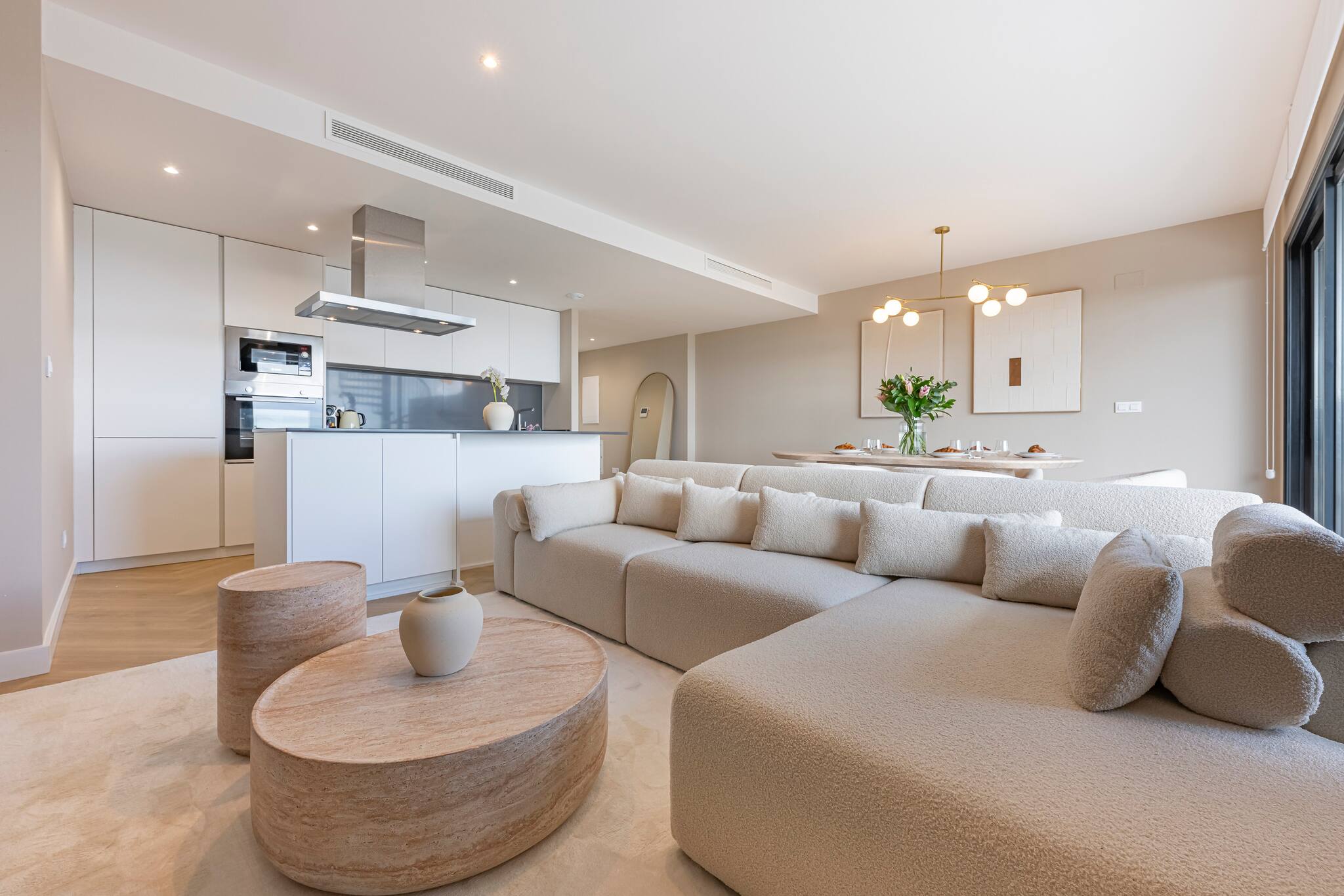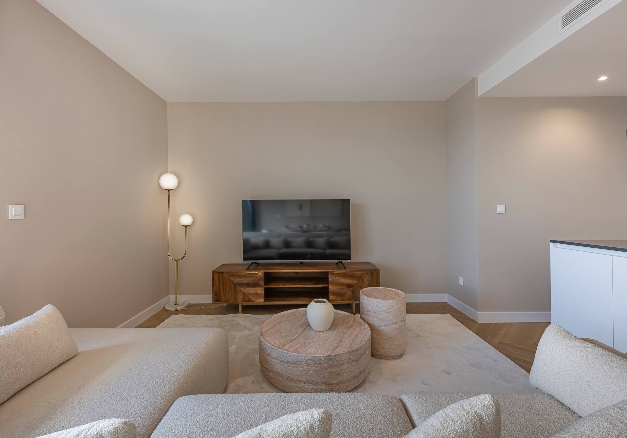 > Living room: spacious and elegant, like everything we will see here, it has a comfortable three-piece L-shaped sofa, a beautiful carpet, a set of coffee tables, a Smart TV, and a beautiful lamp with warm tones.