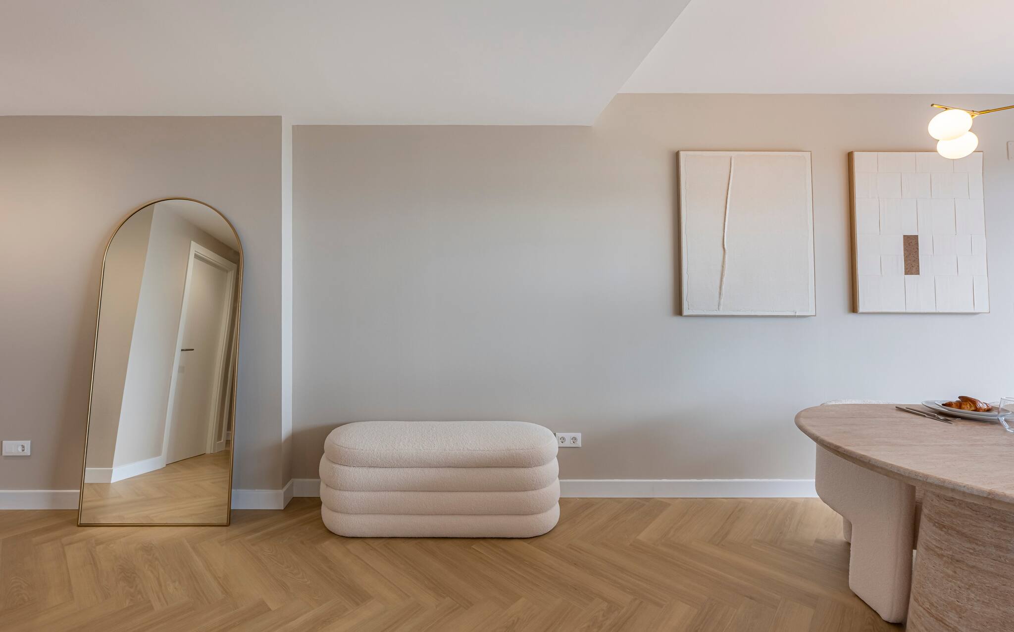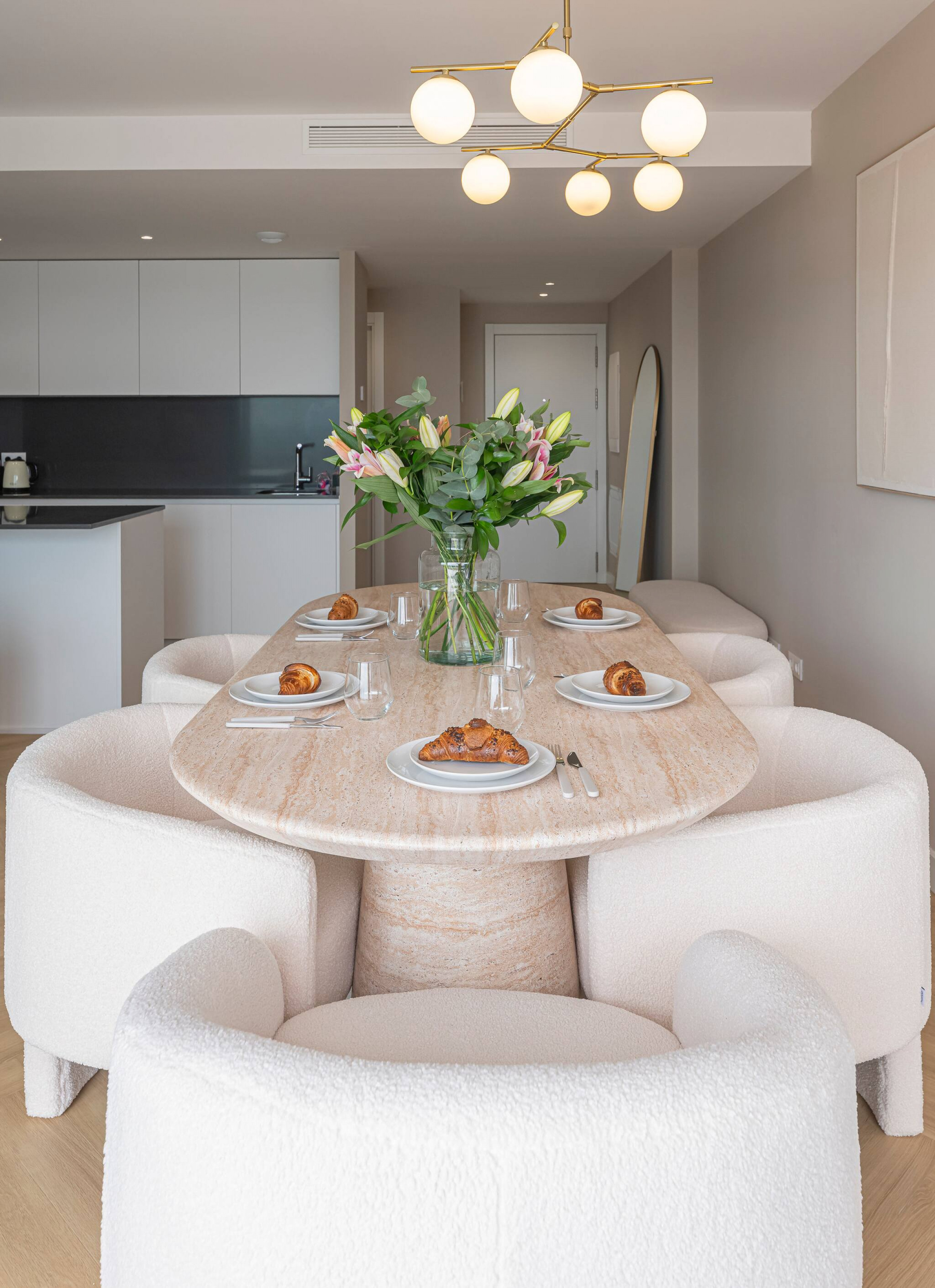 > Dining room: it has an elegant designer dining set, with a table for five people and comfortable chairs. With the light coming in from the terrace, it is a cool place to enjoy lunch, looking out to sea.