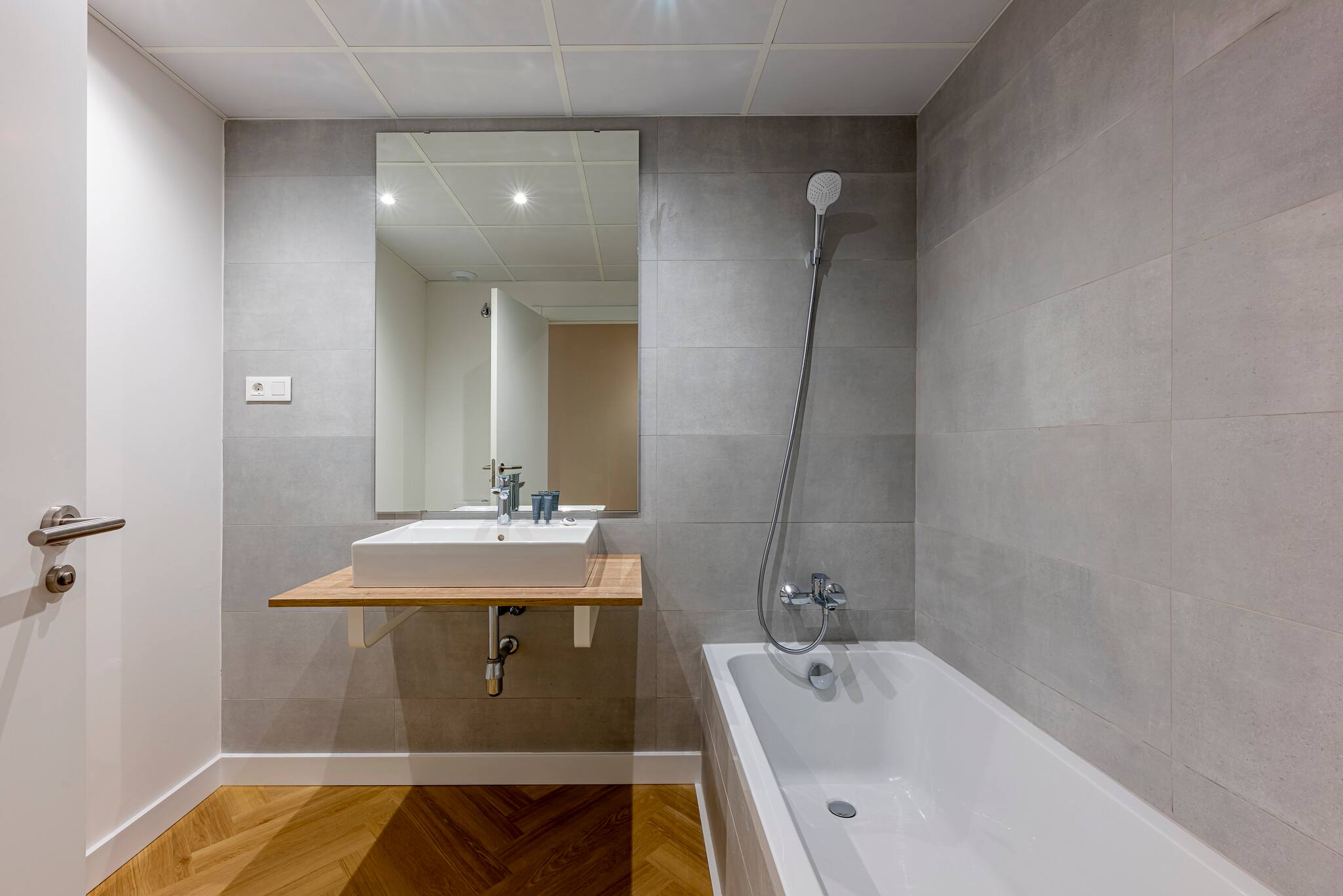 > Bathroom: it offers two bathrooms, one of them with a shower, double washbasin, large mirror, toilet, and storage space. The other has a bathtub, a toilet, and a single washbasin with a mirror.