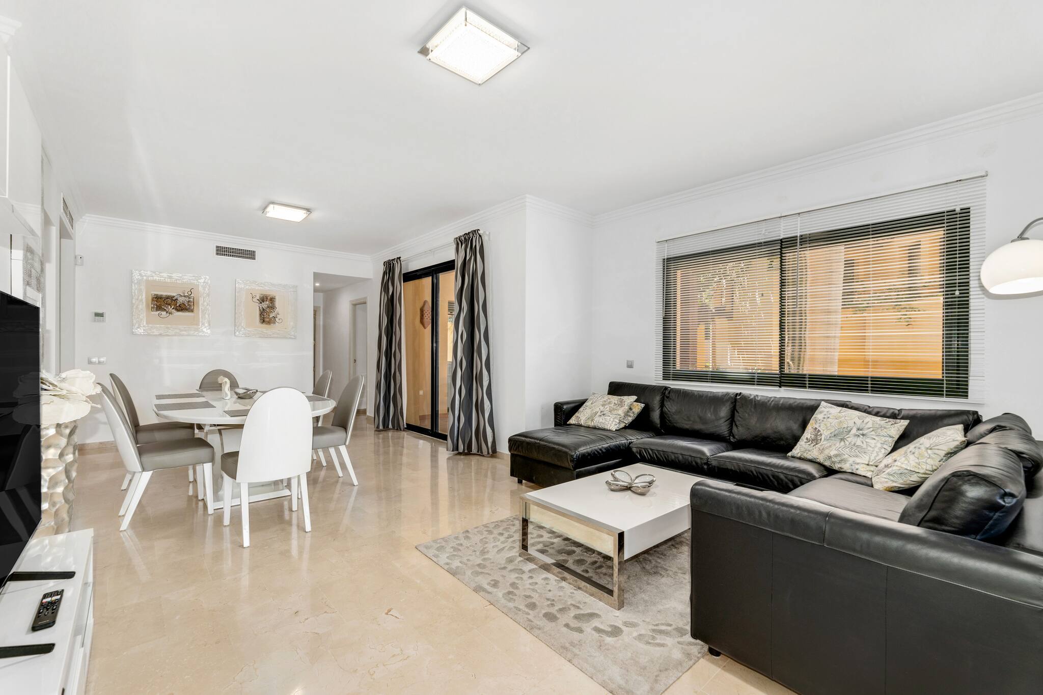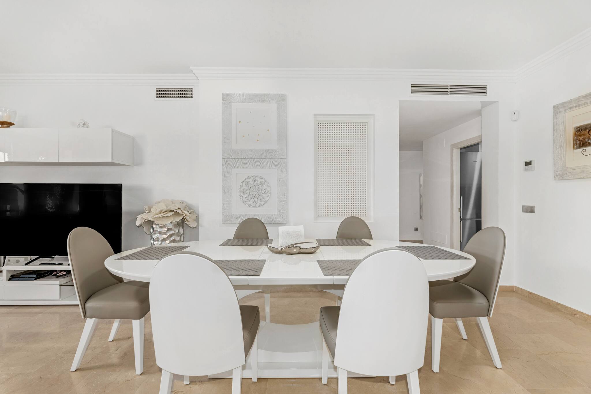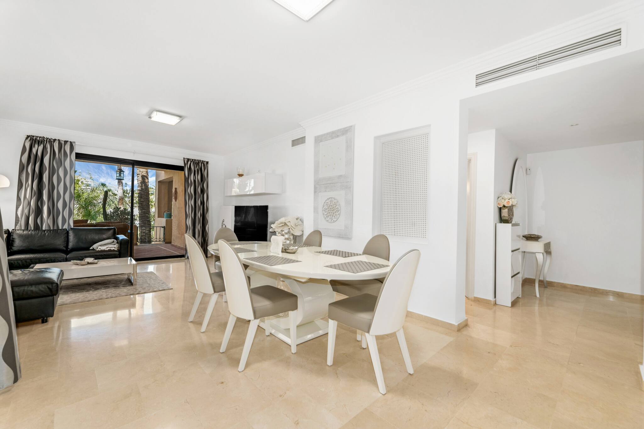 > Living Room: Decorated in white and grey tones, in the living room you'll find a wooden table for 6 people and a large corner sofa with Smart TV. From here you can access 2 of the terraces.