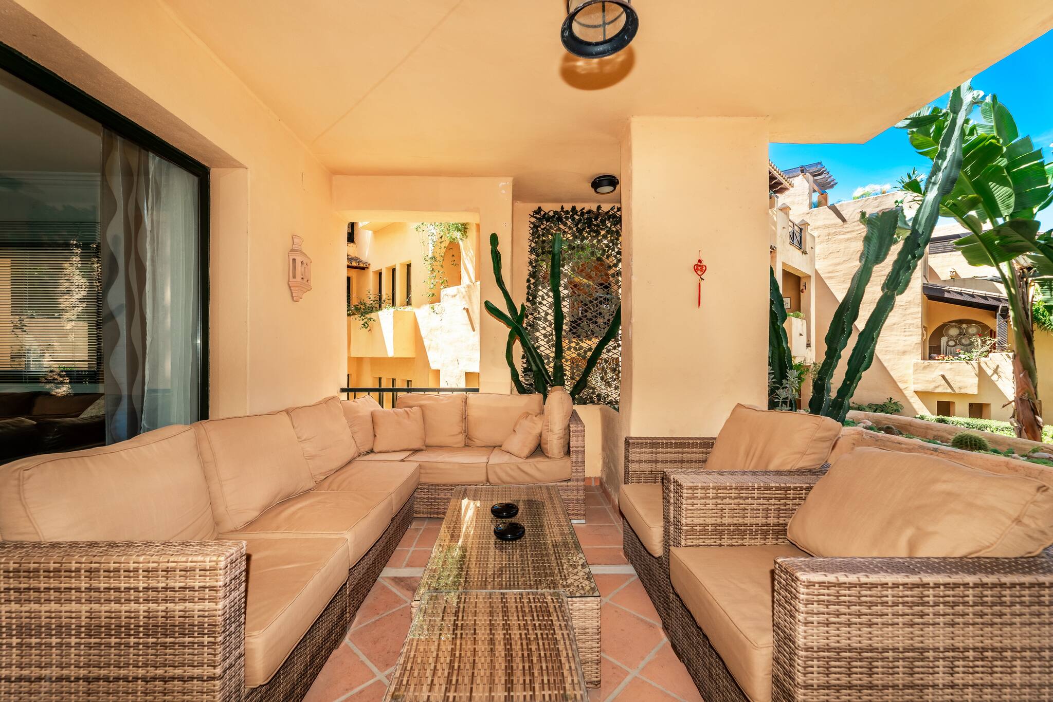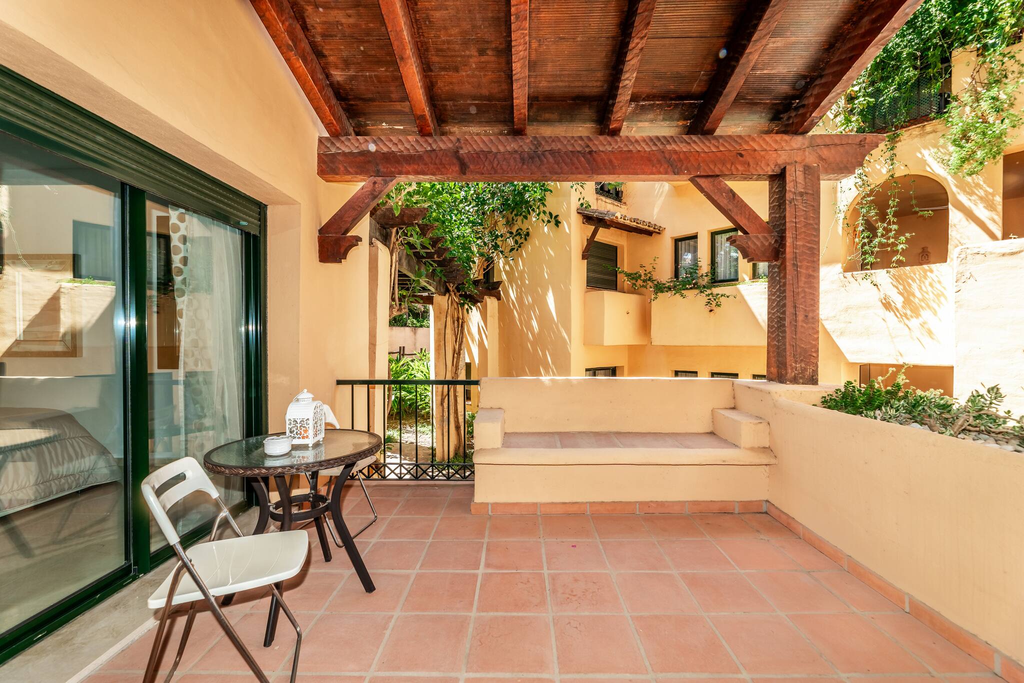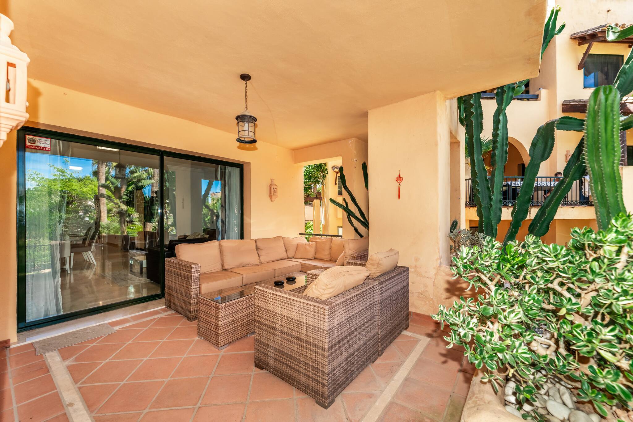 > Terrace: Beautiful covered terrace overlooking the beautiful garden and the urbanization. If you want to relax, we offer a set of outdoor armchairs overlooking the beautiful garden of the urbanization.