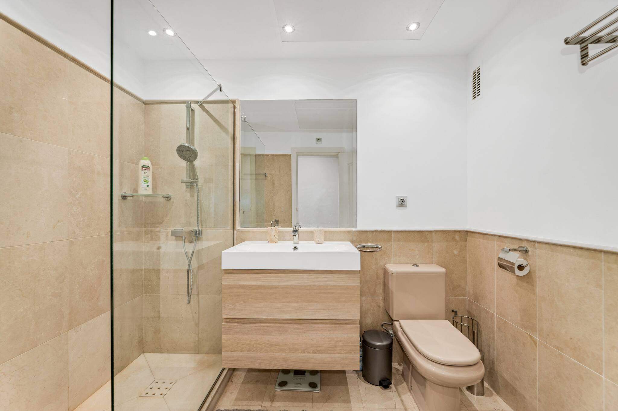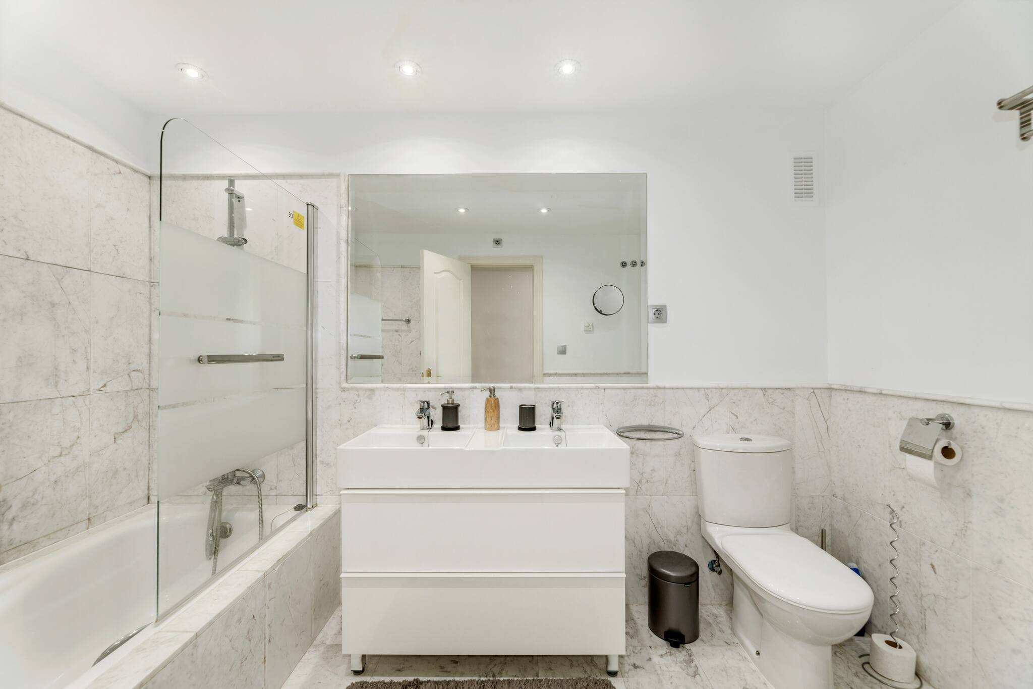 They have a shower and a bathtub respectively. The flat also has a powder room.
