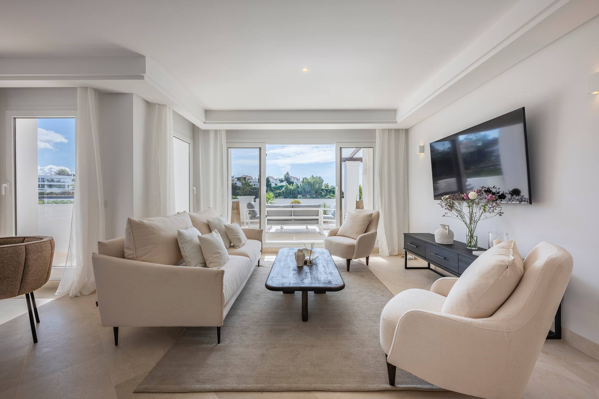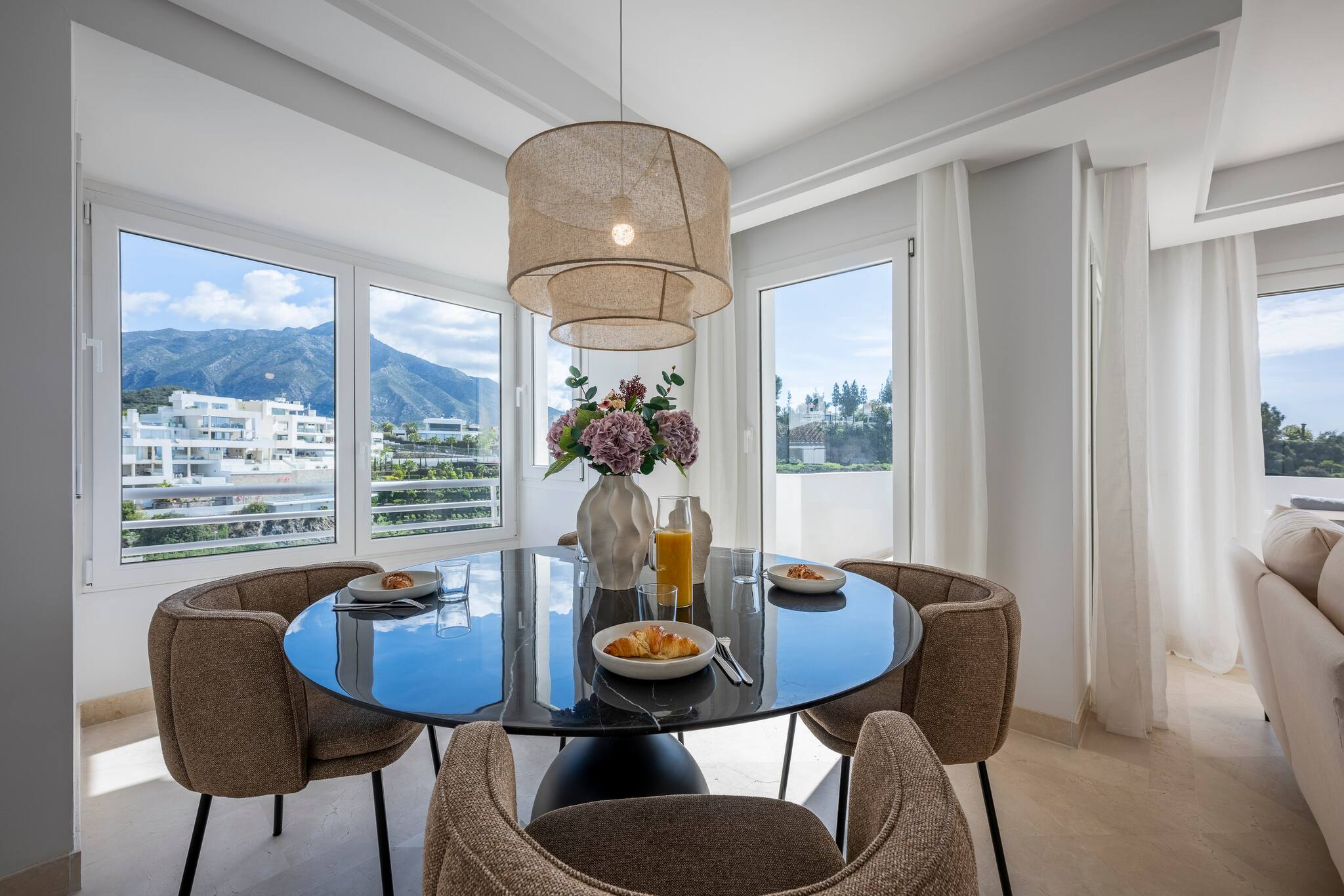 > Living & Dining Room: A cozy space with a round table and chairs for 4 guests. It features a two-seater sofa and two armchairs facing a Smart TV. From here, you can step out onto the balcony and enjoy beautiful views of the garden and mountains.