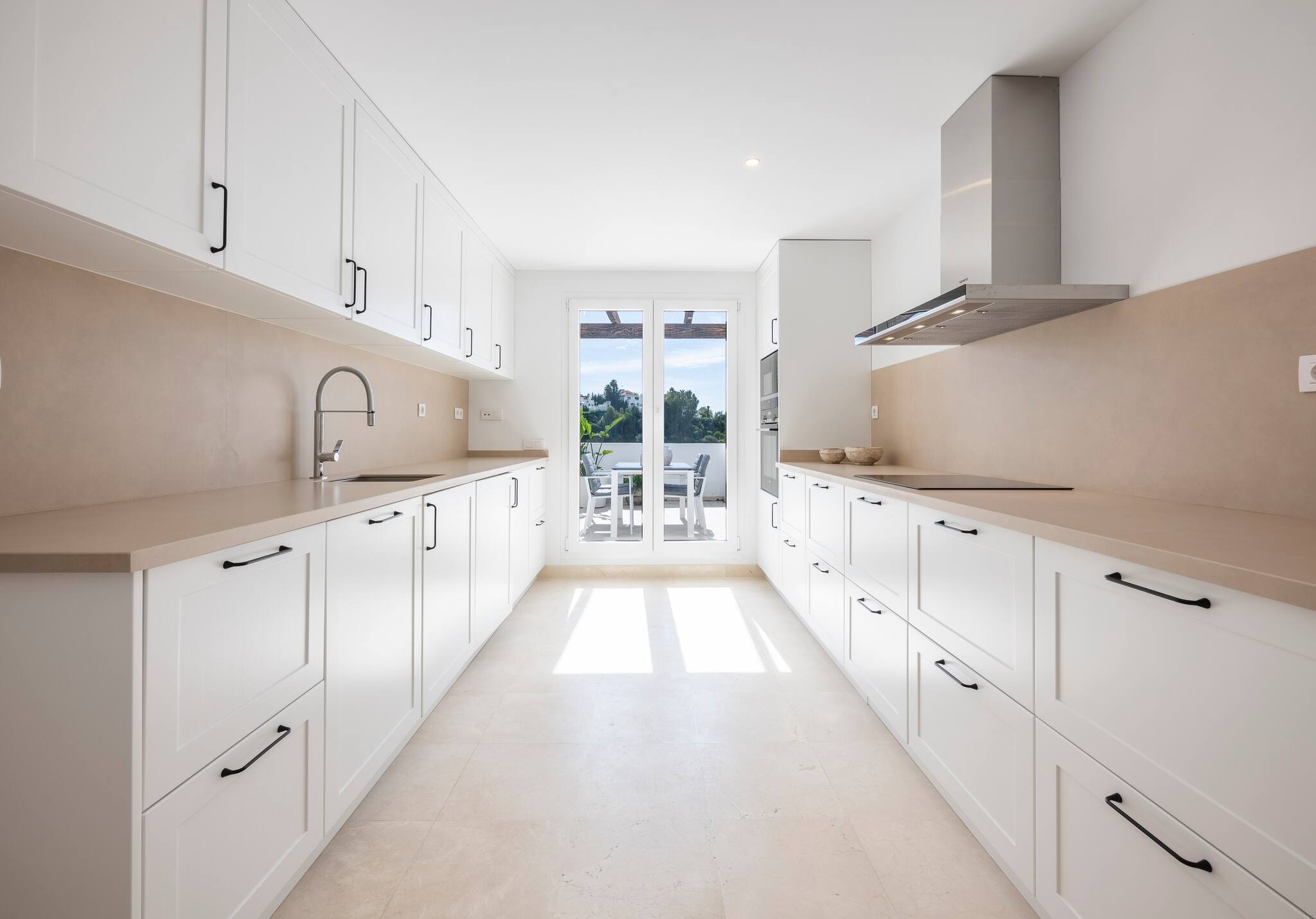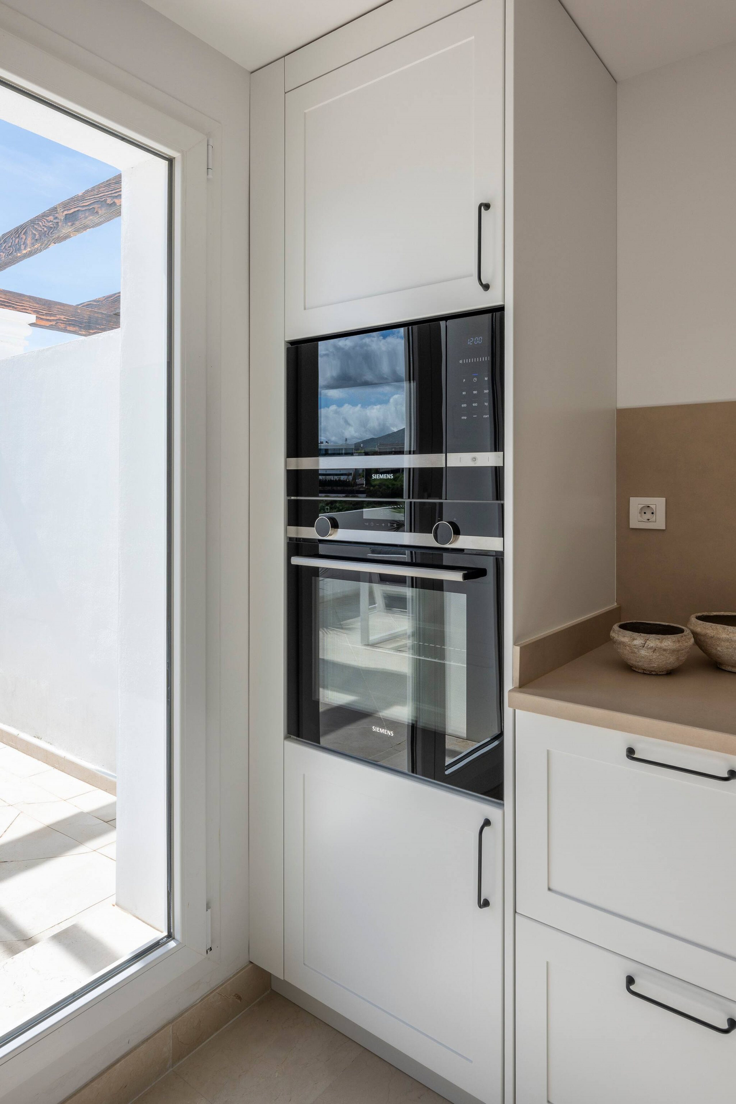> Kitchen: A spacious area equipped with a stove, oven, microwave, dishwasher, coffee machine, kettle, fridge, toaster, and all the necessary utensils to prepare a home-cooked meal. There’s plenty of storage space in the cupboards. The kitchen also opens onto a sunny terrace with outdoor furniture: a table and chairs for 4 people.