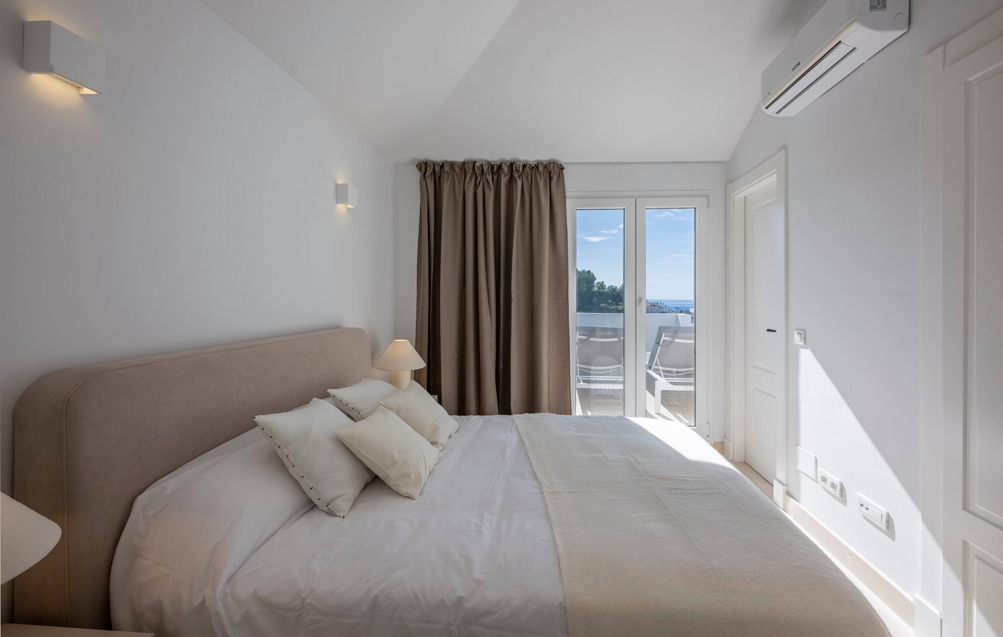 > Master Bedroom: Furnished with a 160x200cm bed placed beside a window that fills the room with natural light and provides access to a terrace with two sun loungers. It includes two bedside tables and a wardrobe to unpack and make yourself feel at home.