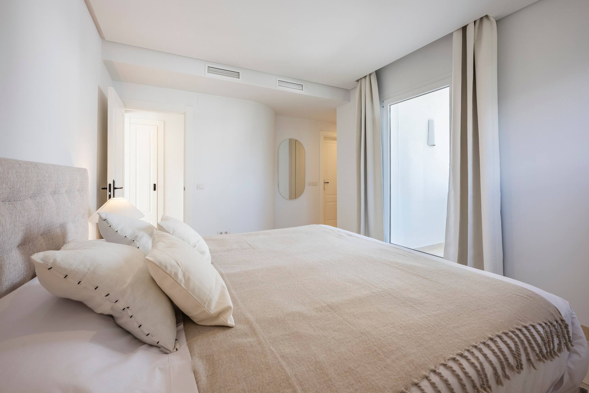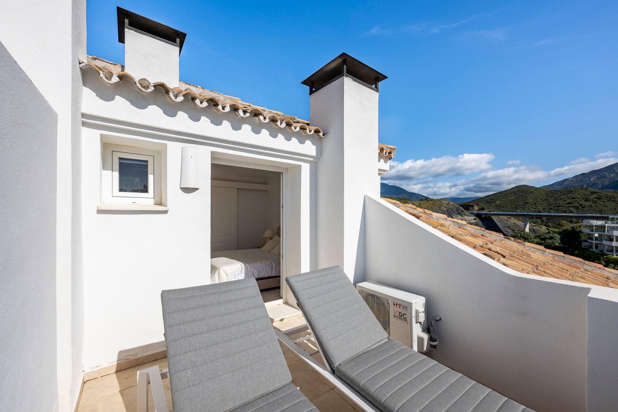 > Secondary Bedroom: This room features a comfortable 180x200cm bed, bedside tables, a wardrobe, and a large mirror. It also has direct access to a private terrace with stunning mountain views.