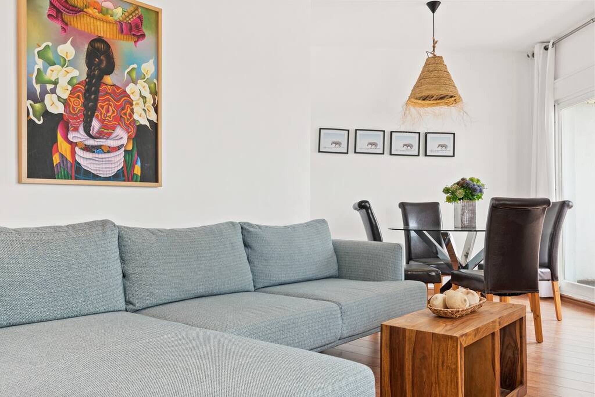 > Living room: spacious, with beautiful decoration details to make you feel at home. It is composed of a living area, where you can relax on the large sofa while enjoying the Smart TV (WIFI). Then, the dining area with a beautiful table and chairs for 4 people. It has access to the large terrace.