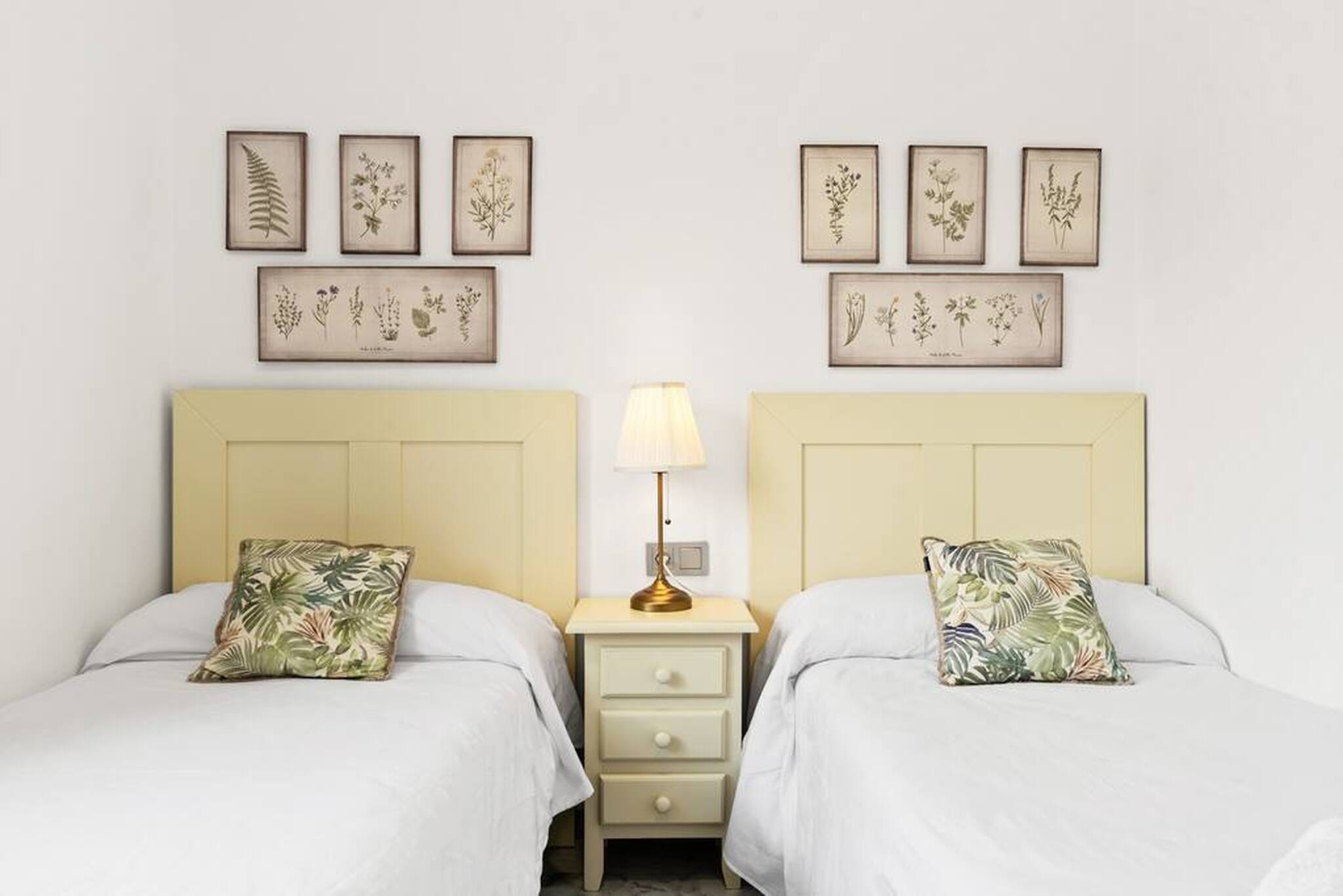 >Secondary bedroom: The secondary bedroom is cosy and functional, equipped with two single beds and a bedside table with a lamp. This room also has ample storage space, and a window that allows natural light to enter.