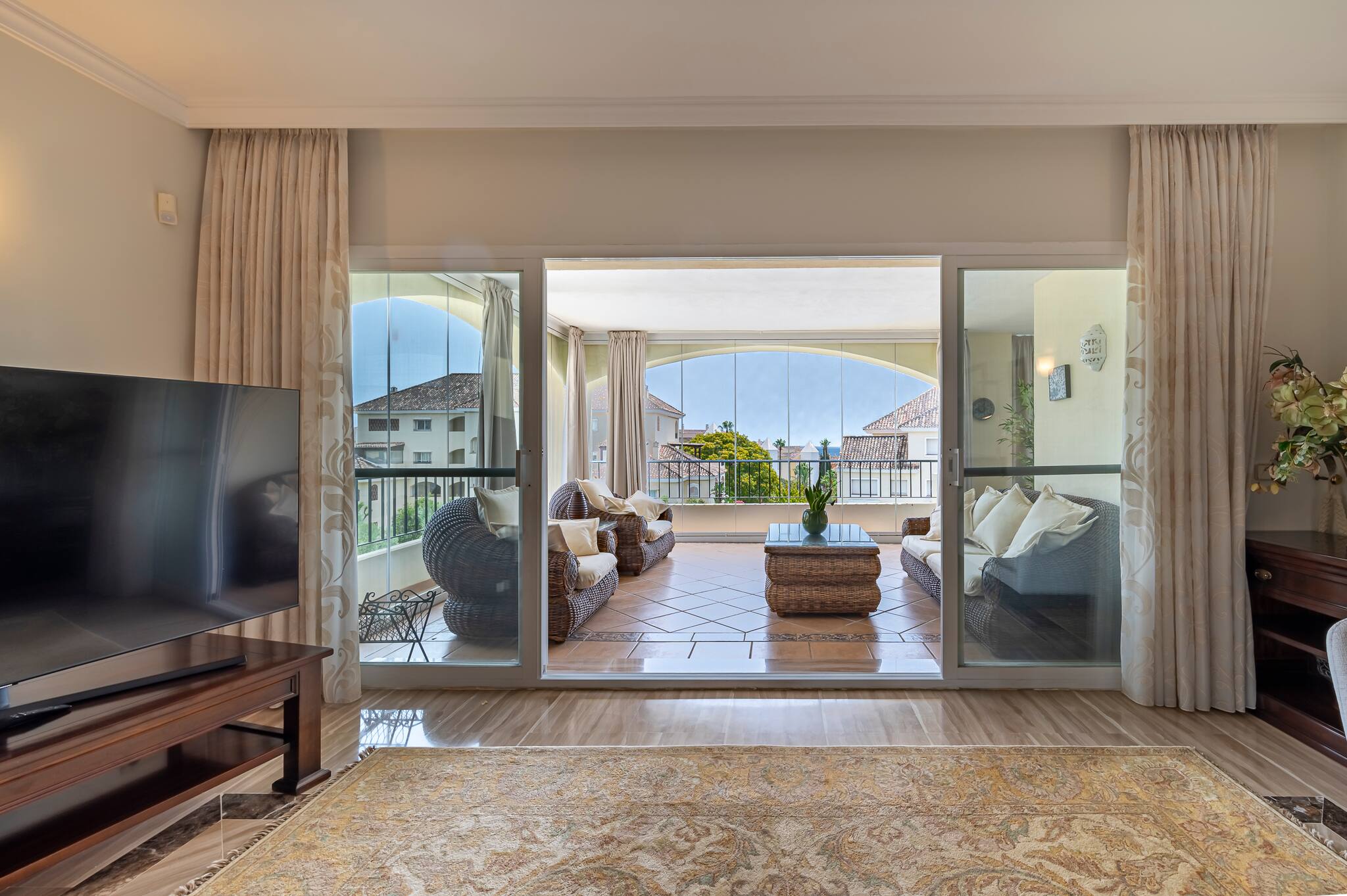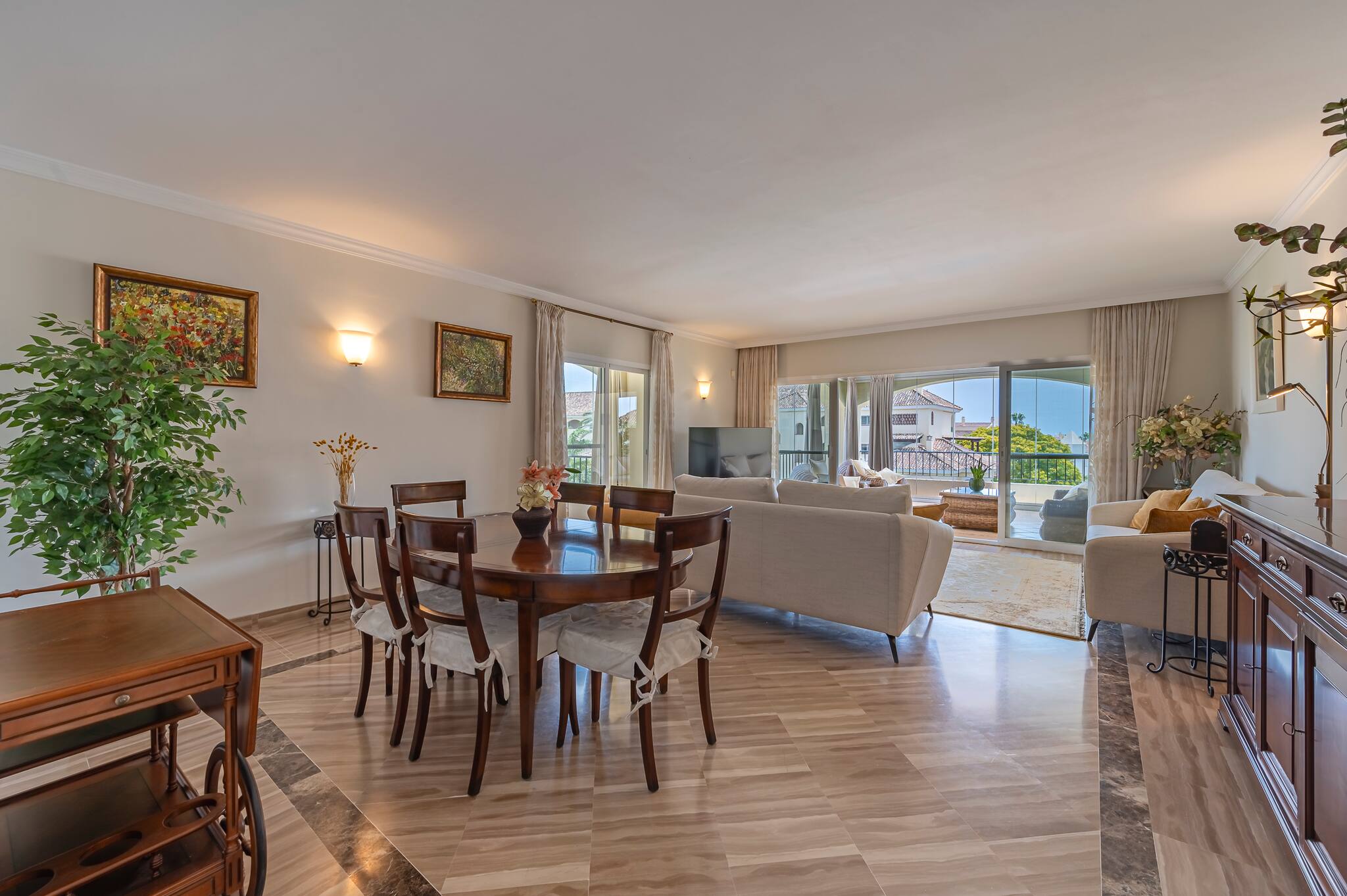 > Living room: spacious, consisting of a dining area with a beautiful table and chairs for 6 guests. Then, the living area, where you can relax in the comfortable sofa and armchairs while enjoying the Smart TV (WIFI). It has access to a large terrace.