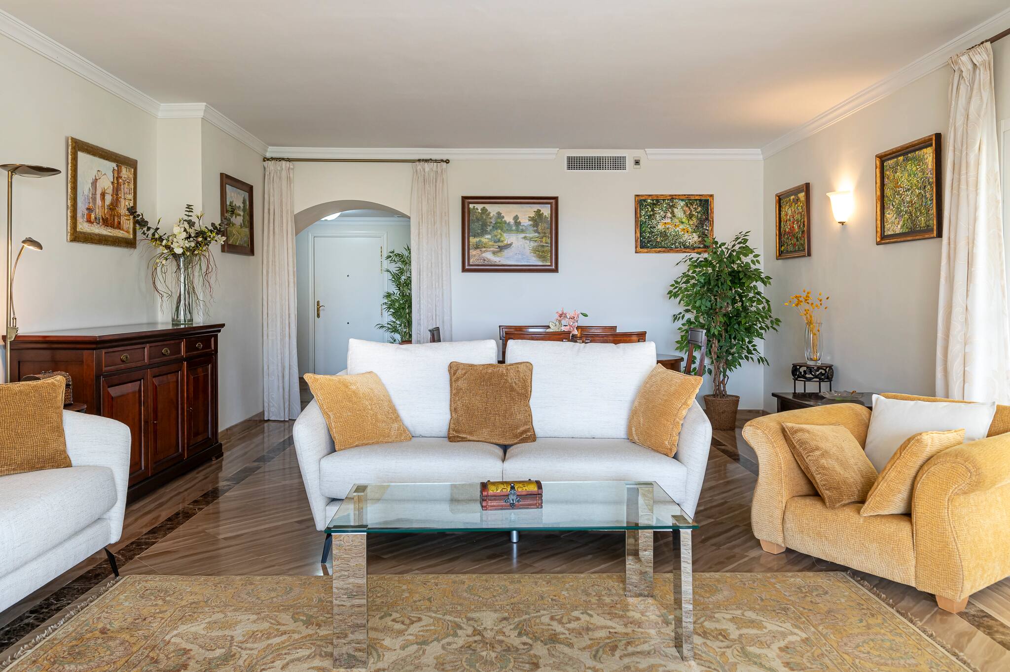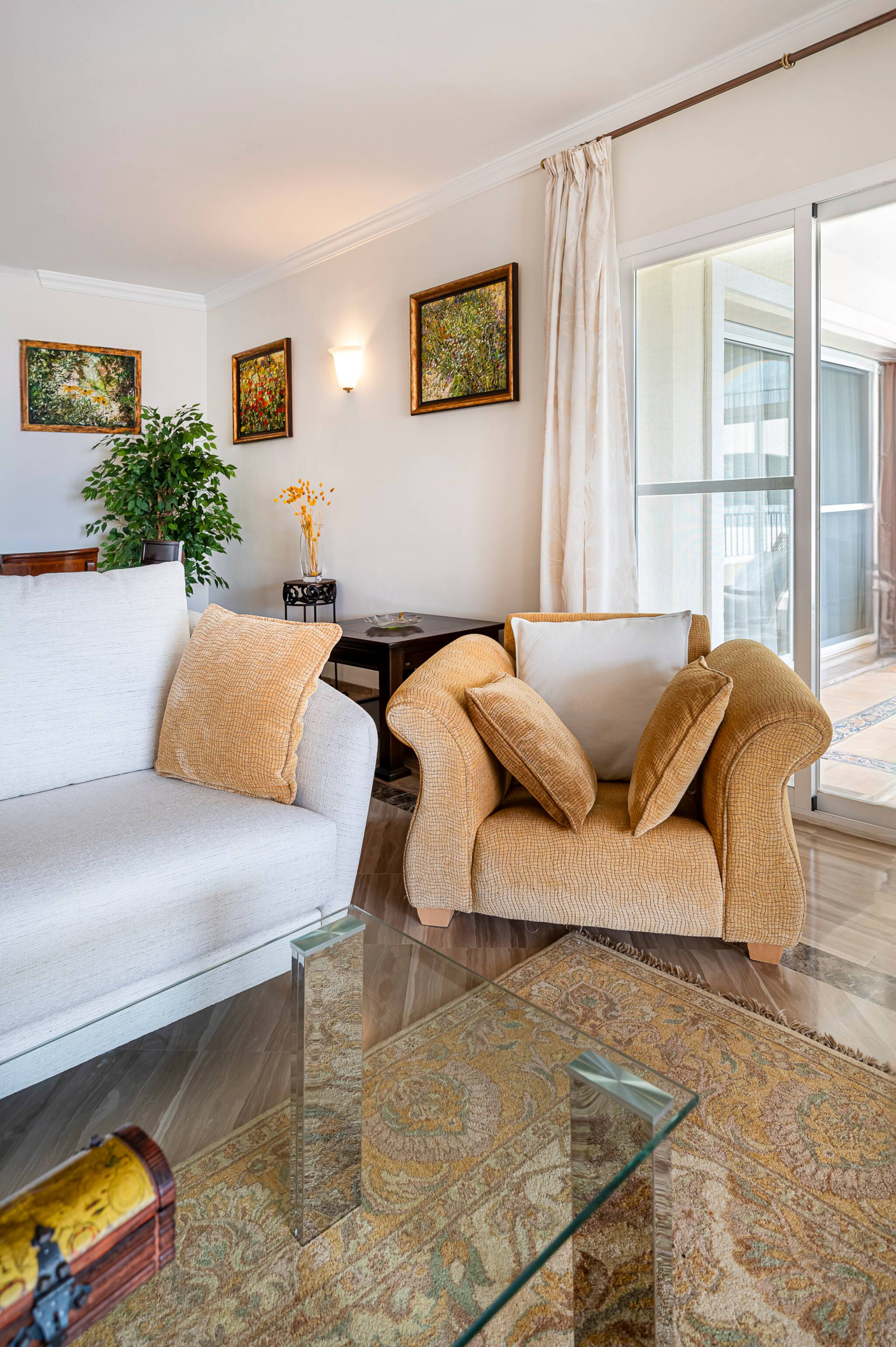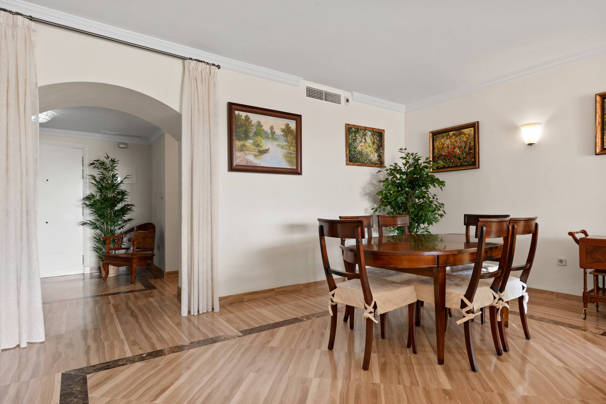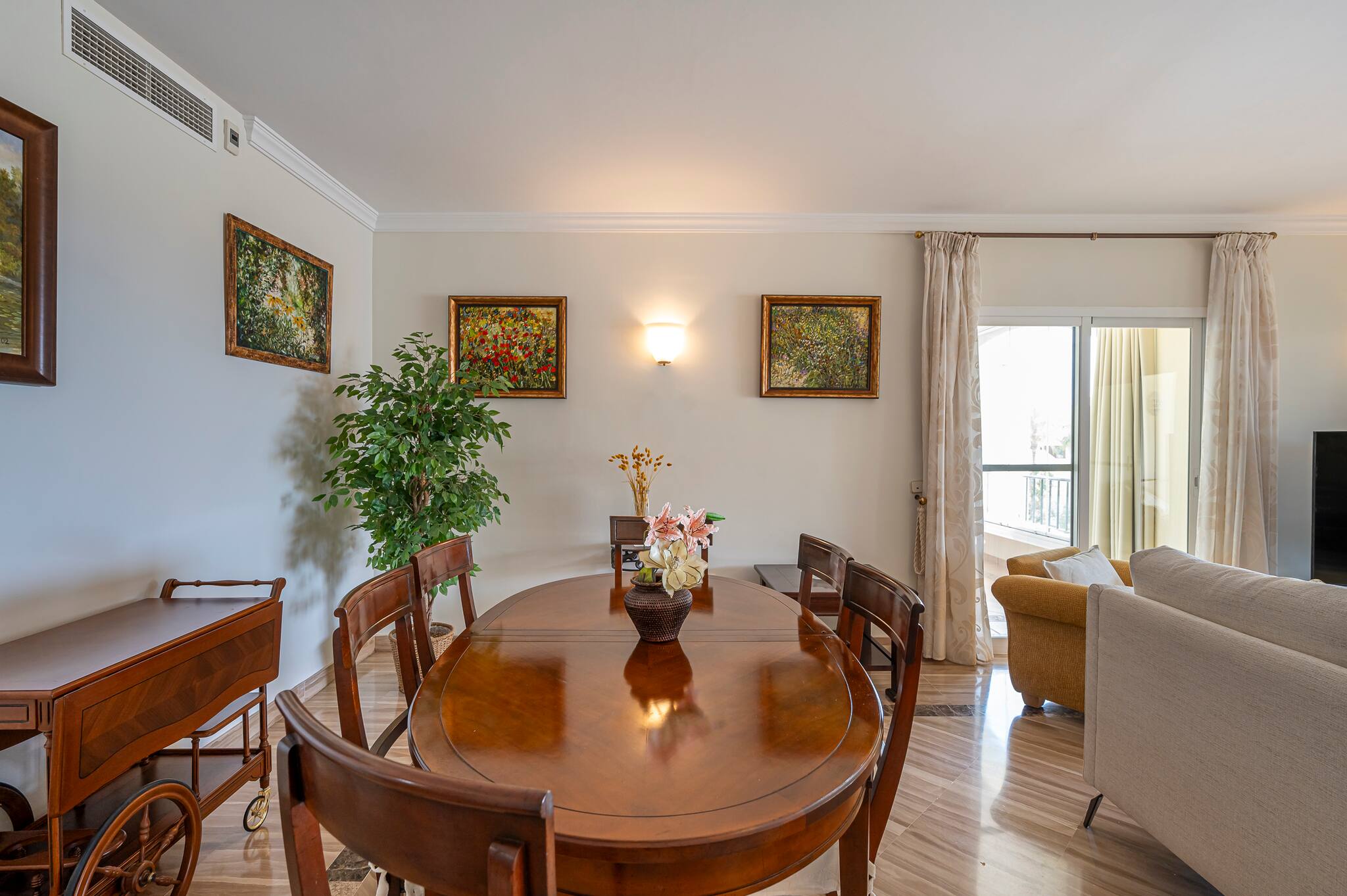 > Living room: spacious, with beautiful decoration details to make you feel at home. It is composed of a living area, where you can relax on the large sofa while enjoying the Smart TV (WIFI). Then, the dining area with a beautiful table and chairs for 4 people. It has access to the large terrace.