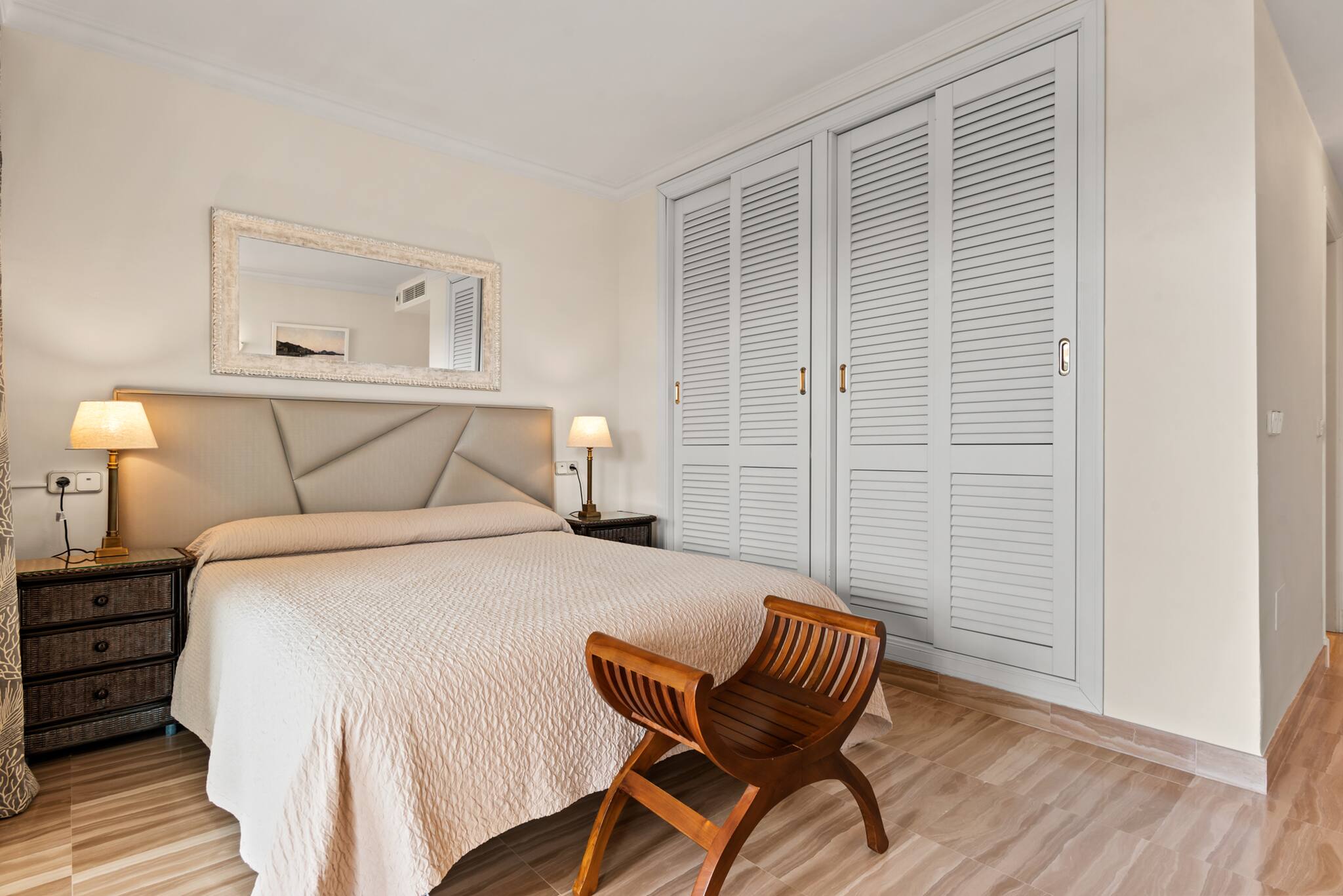 >Secondary bedroom: The secondary bedroom is cosy and functional, equipped with two single beds and a bedside table with a lamp. This room also has ample storage space, and a window that allows natural light to enter.