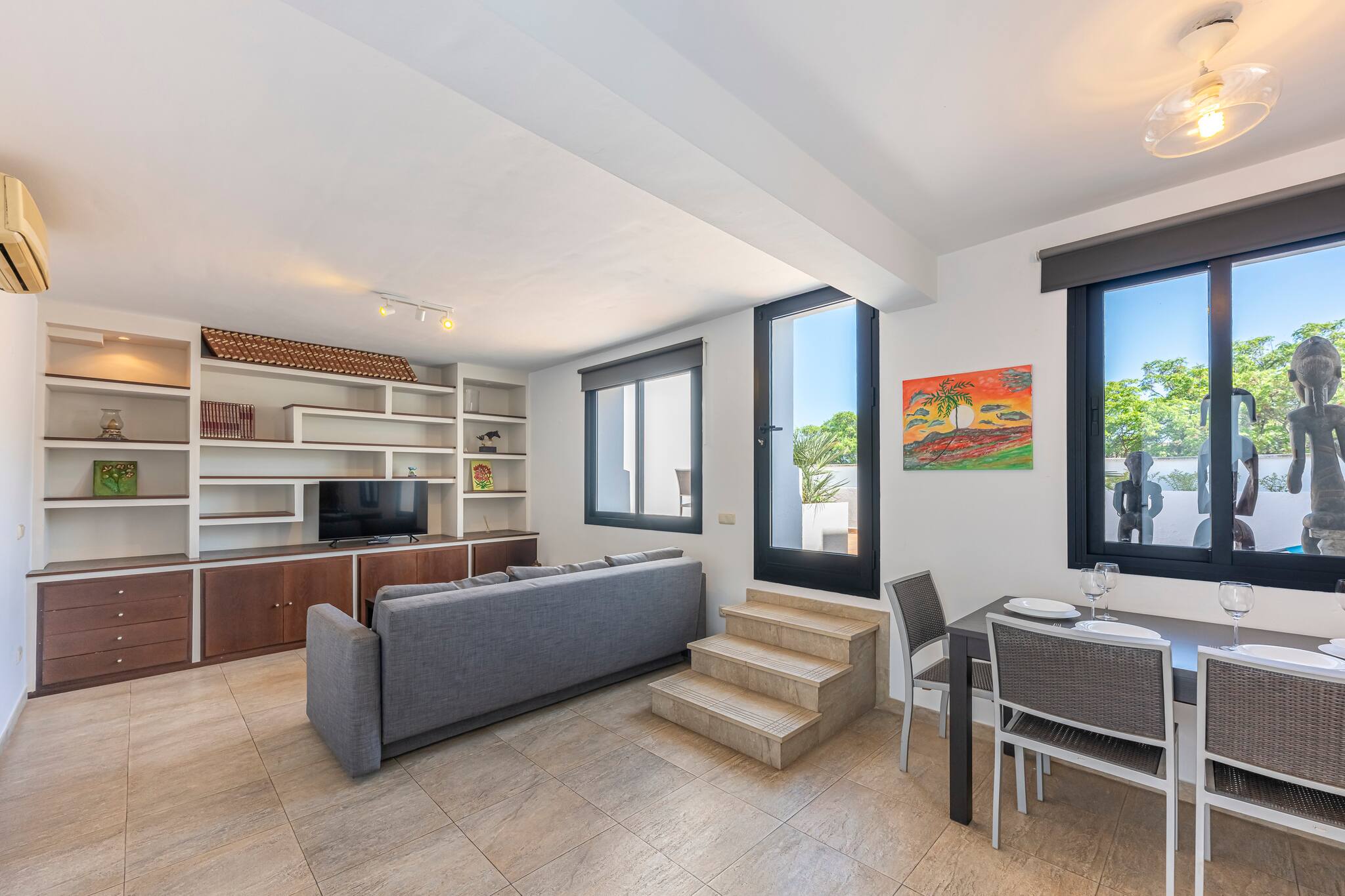 >Living room: A bright and welcoming space featuring a comfortable three-seater sofa and a coffee table, perfect for relaxing or watching TV. There's also a table and chair for casual dining. The room opens directly onto the terrace, filling the space with natural light.