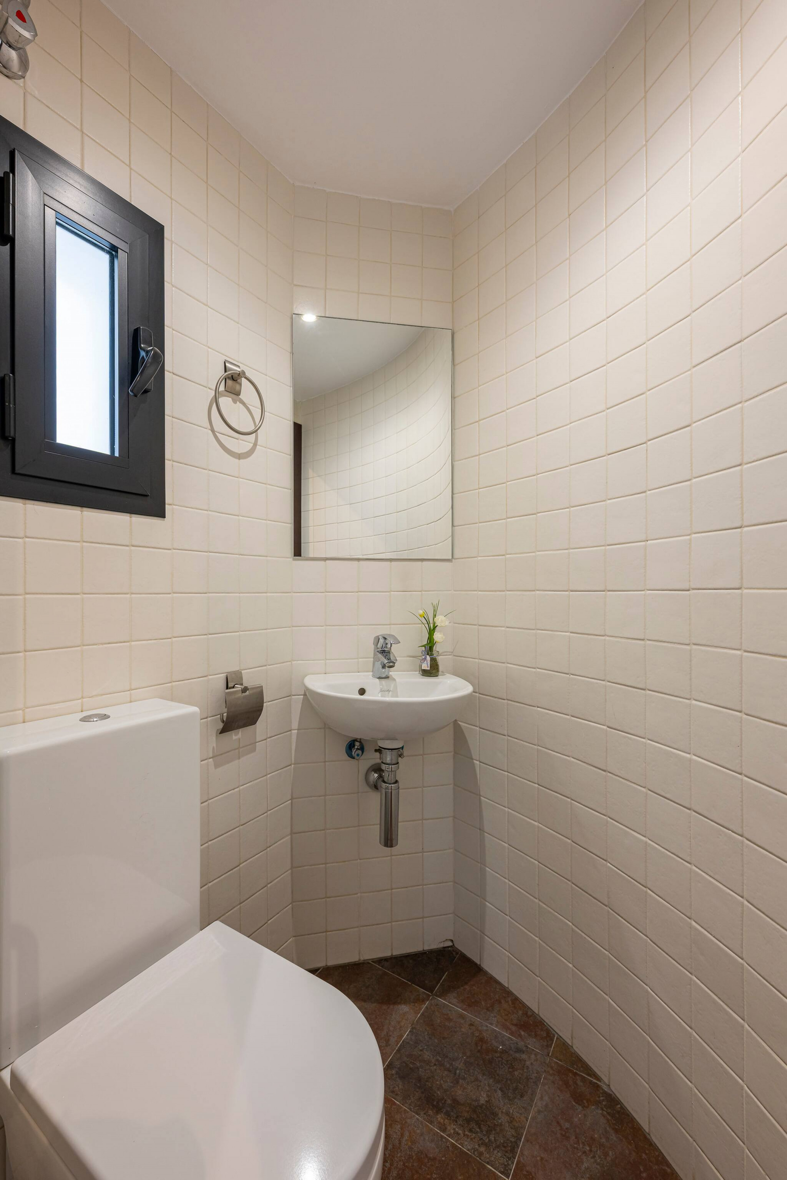 >Bathrooms: There are two bathrooms. The main one is spacious and filled with natural light, featuring a sink, mirror, toilet, shower, and bathtub. The second bathroom includes a toilet and is practical for guests or larger groups.