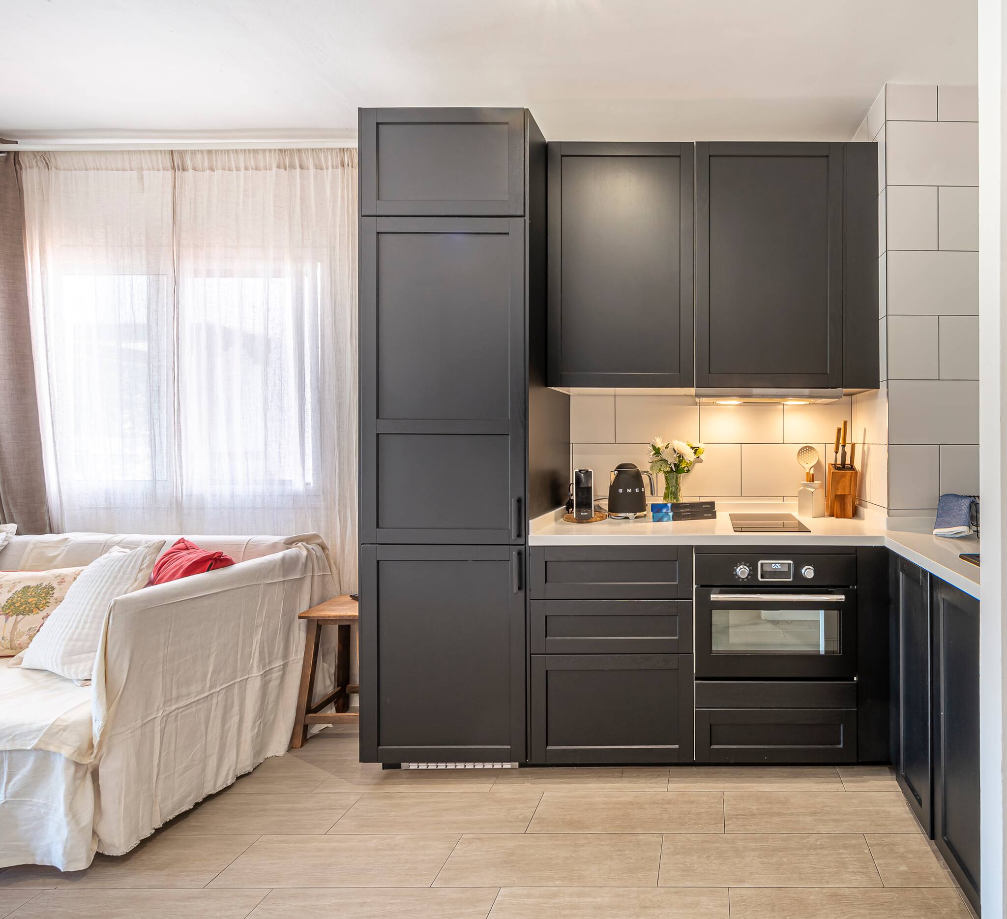 Next, you will find an air-conditioned living room, a comfortable sofa bed for 2 guests, and a Smart TV with Netflix.