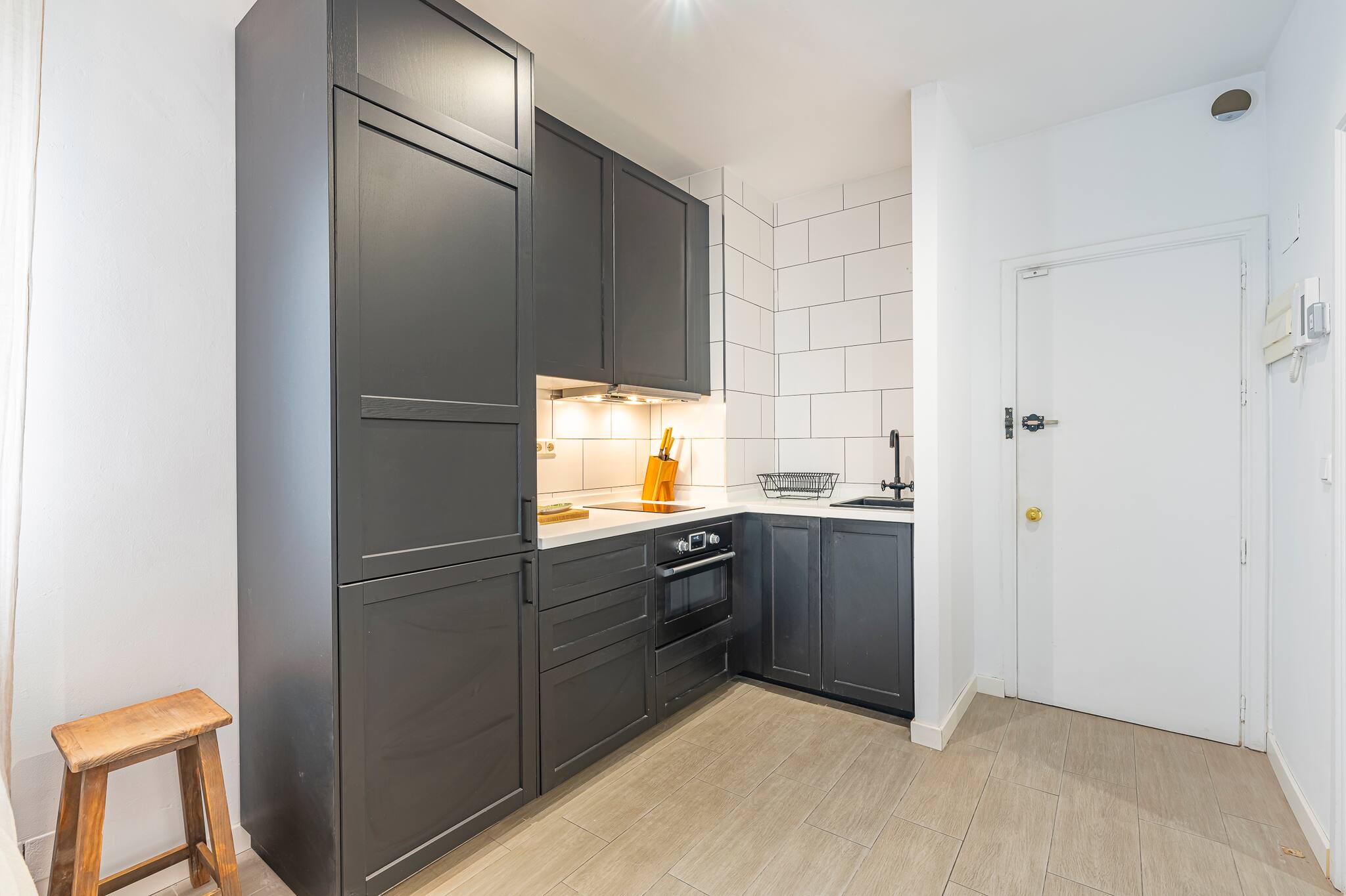 Upon entering the studio you will find a fully equipped kitchen with an oven, microwave, dishwasher, refrigerator and freezer, coffee machine, water heater, toaster and all the crockery to enjoy a delicious meal. It features a breakfast bar in light wood and a modern style in light tones.
