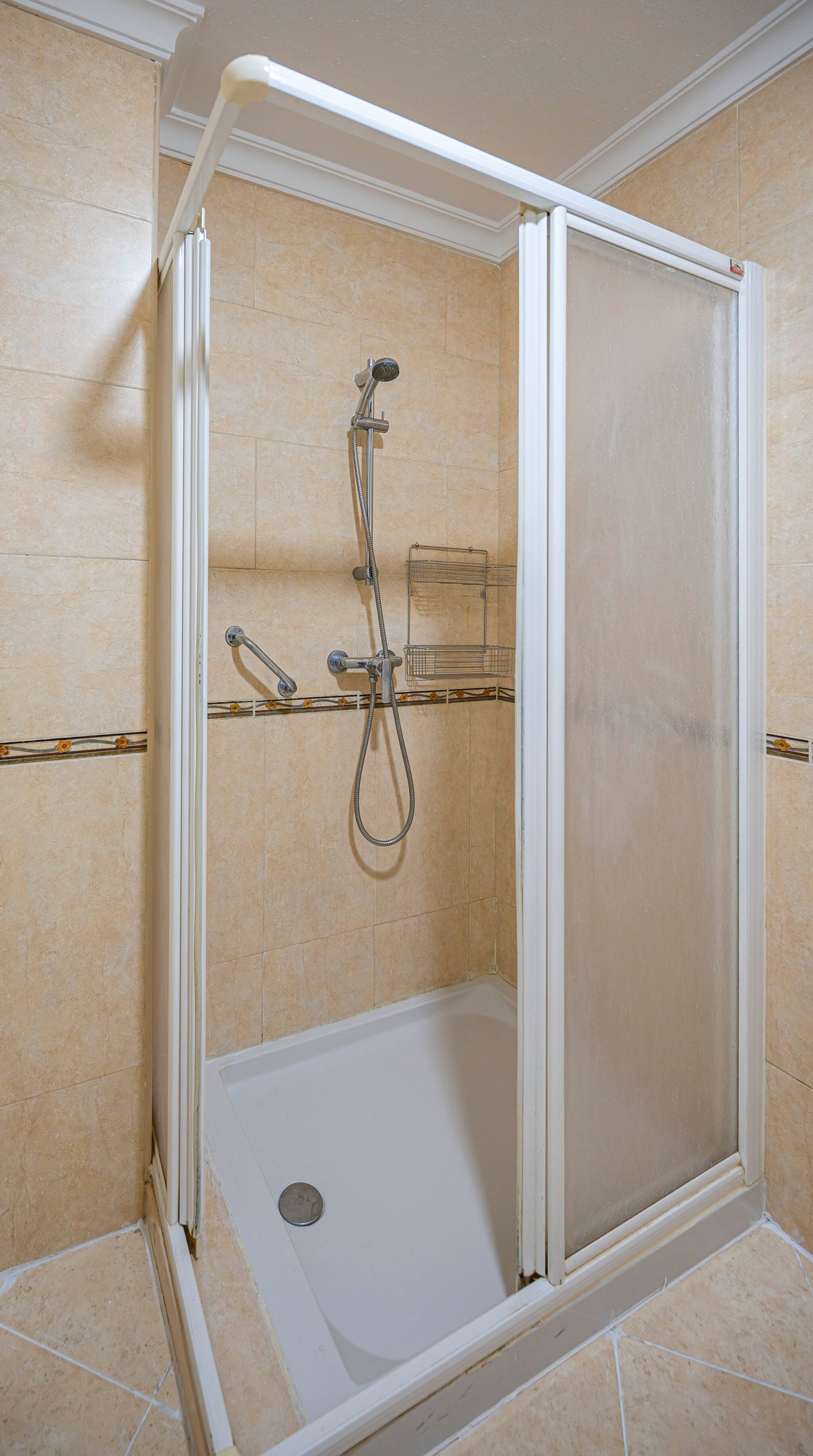 >Modern and functional bathroom with enclosed shower, large sink with storage cabinet and large illuminated mirror. Its warm-toned finishes create a cosy atmosphere.