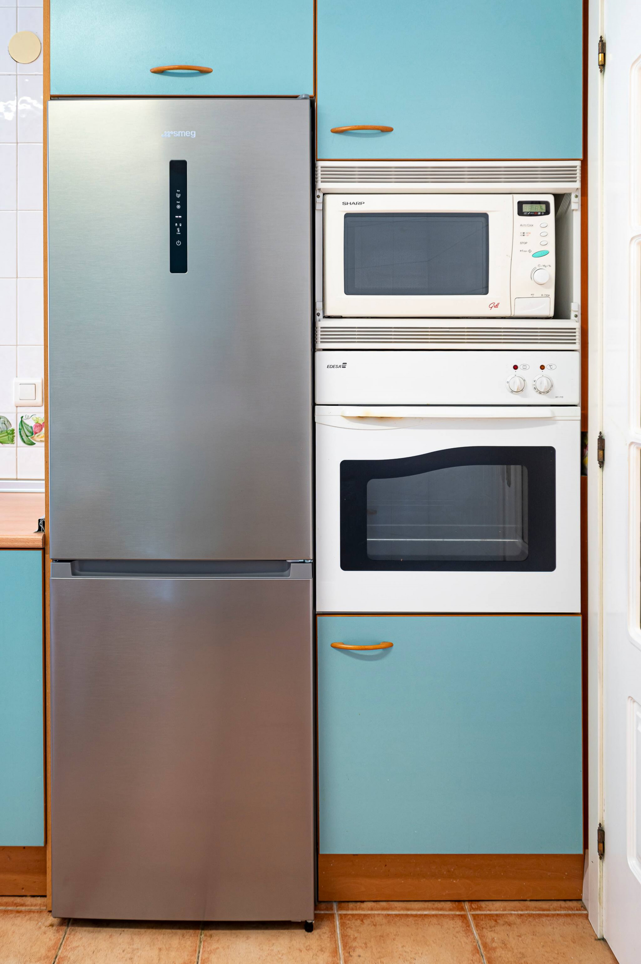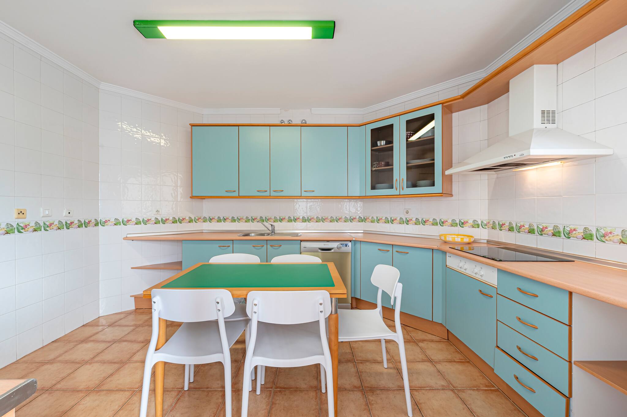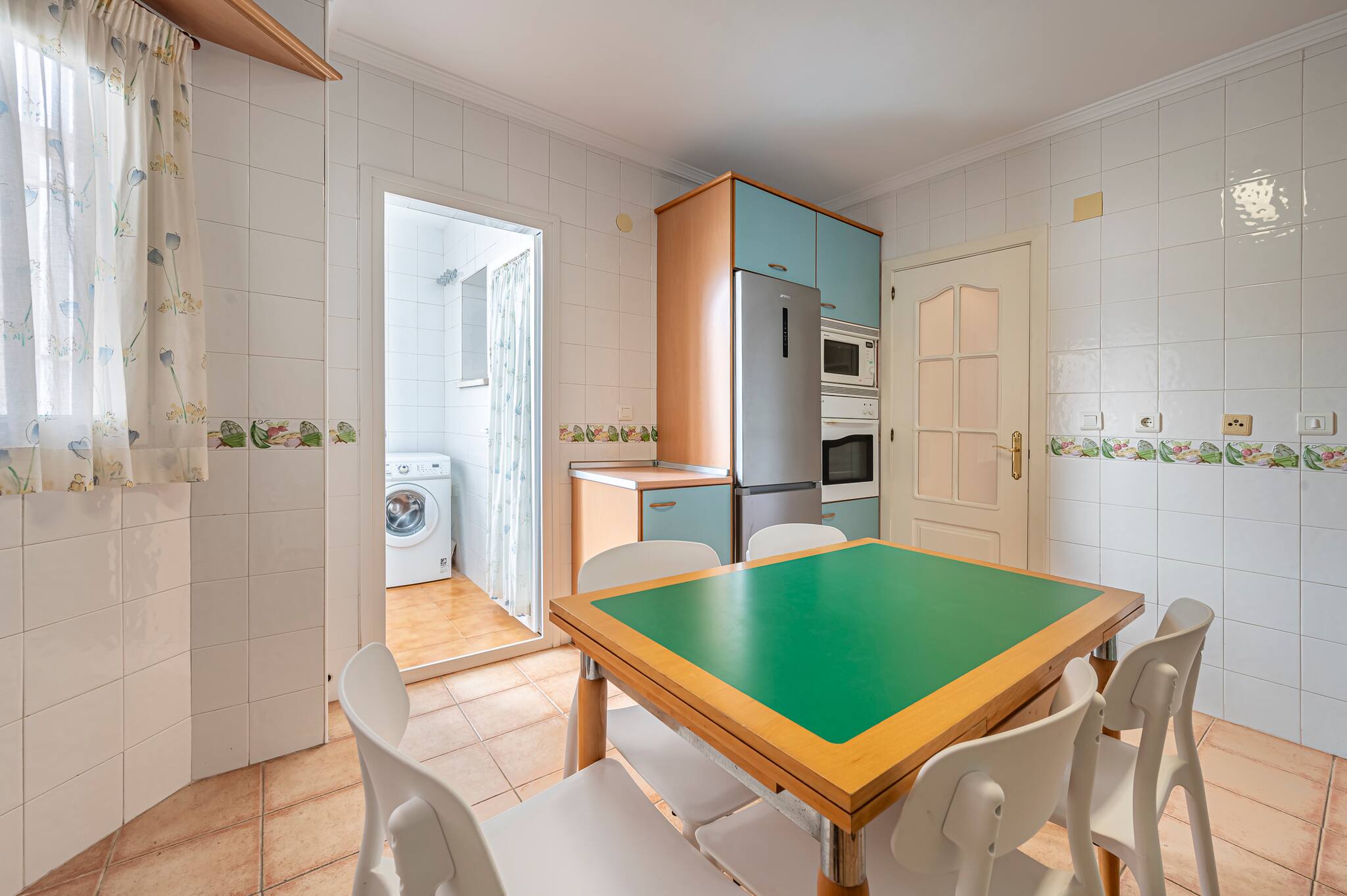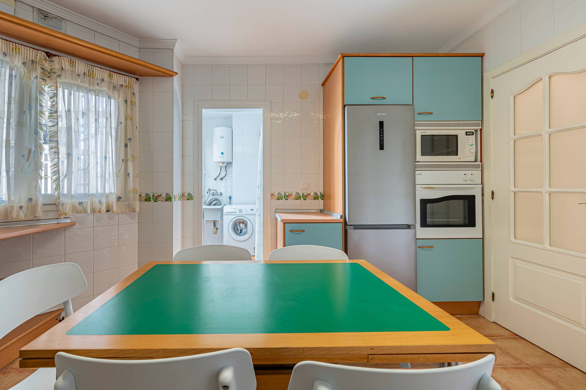 >Kitchen: The kitchen is independent, in light tones and with a large countertop. It is fully equipped with an oven, fridge, microwave, dishwasher, coffee machine (espresso), toaster, washing machine and all the necessary utensils to prepare meals in one. It has a table for 5 people. From here you enter the laundry room.