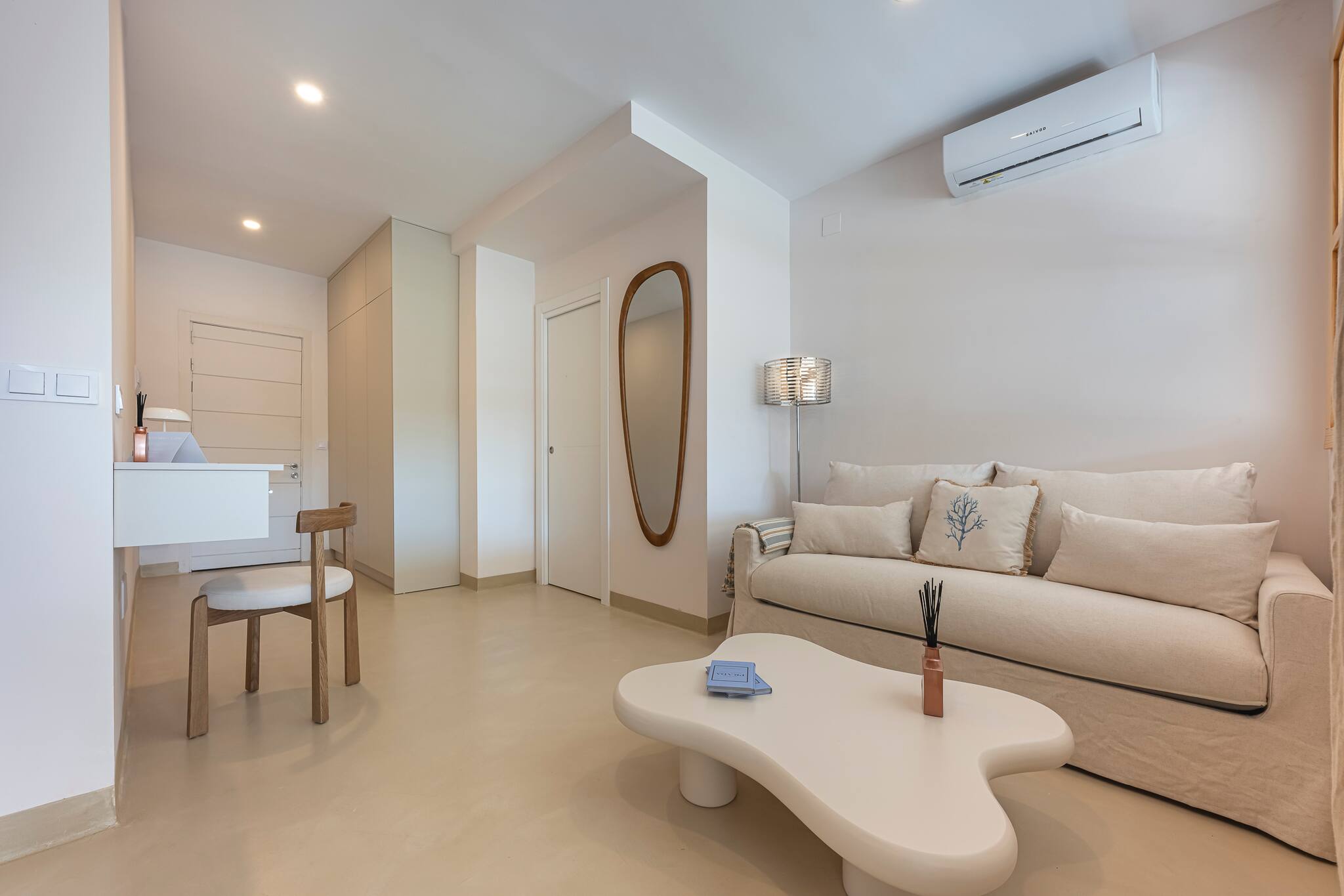 > Living Room: The living room is a bright and cosy space, perfect for relaxing or unwinding after a day at the beach. It features a comfortable two-seater sofa, a coffee table, and a TV, creating an ideal spot to chill. Next to it is the entrance hall with a functional console and a large built-in wardrobe.