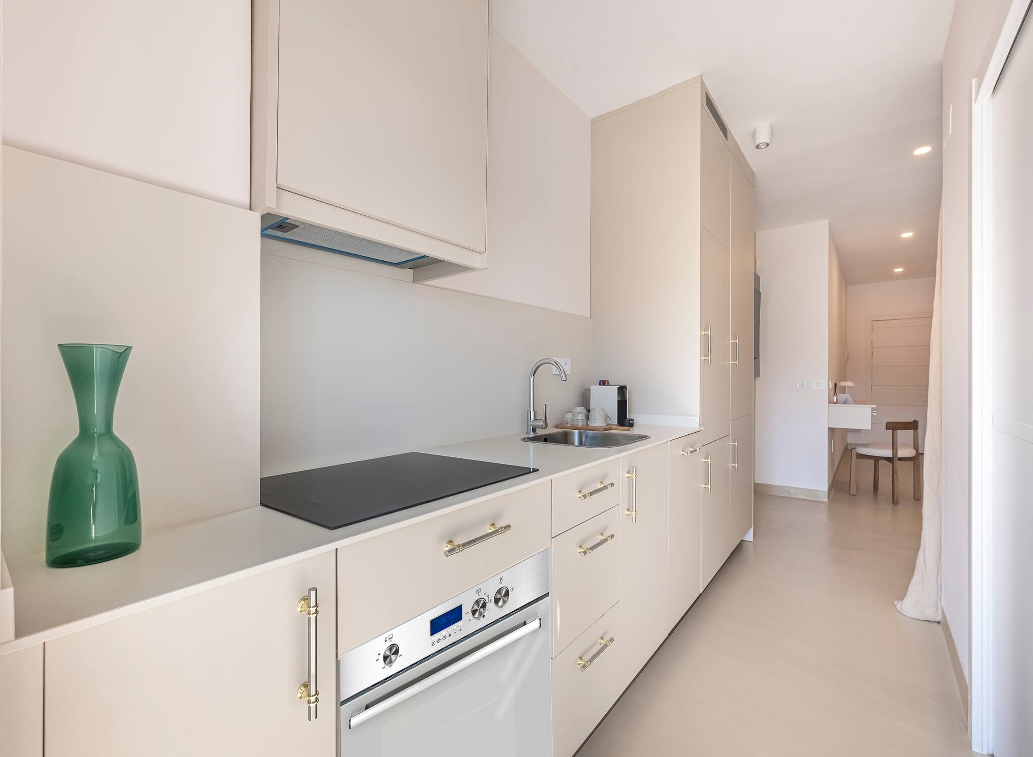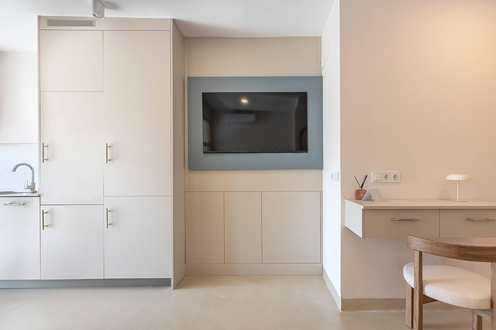Upon entering the studio you will find a fully equipped kitchen with an oven, microwave, dishwasher, refrigerator and freezer, coffee machine, water heater, toaster and all the crockery to enjoy a delicious meal. It features a breakfast bar in light wood and a modern style in light tones.