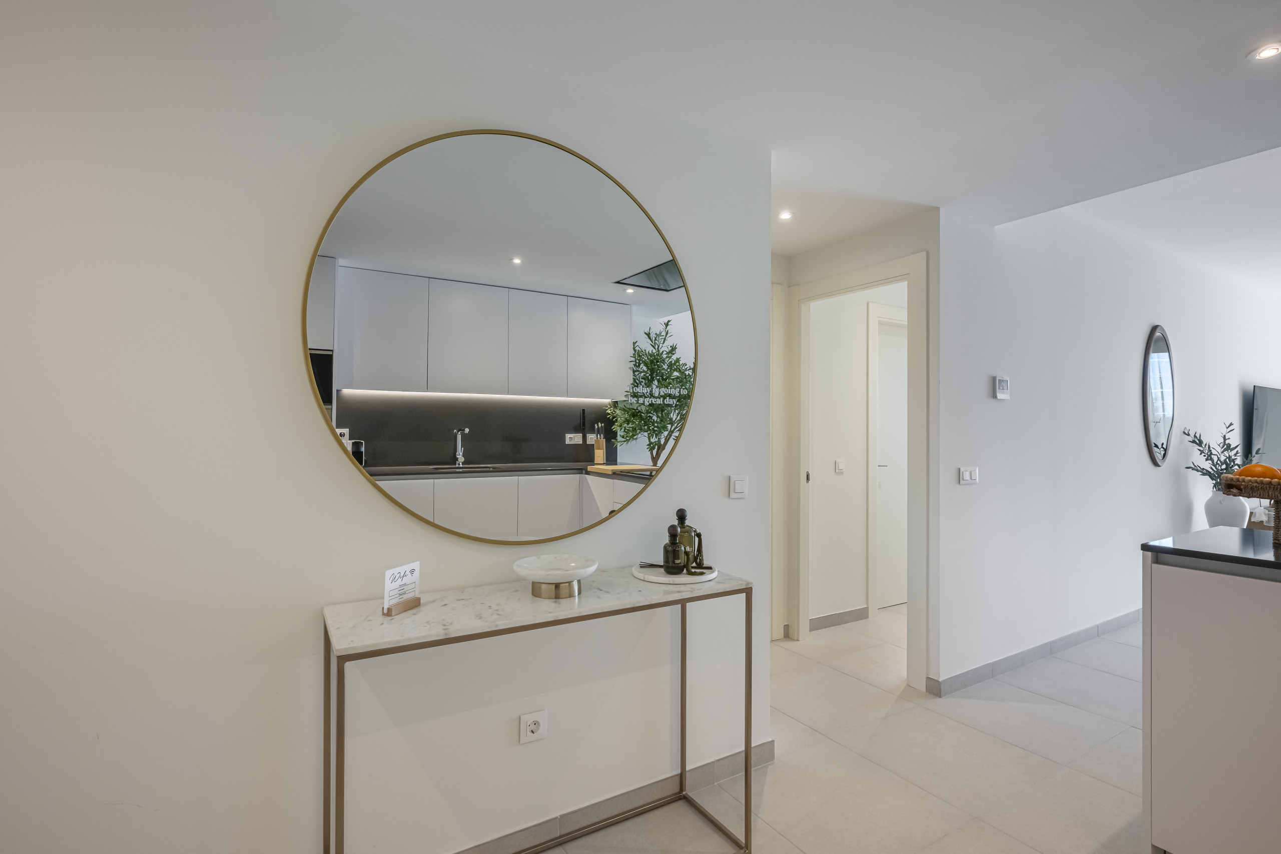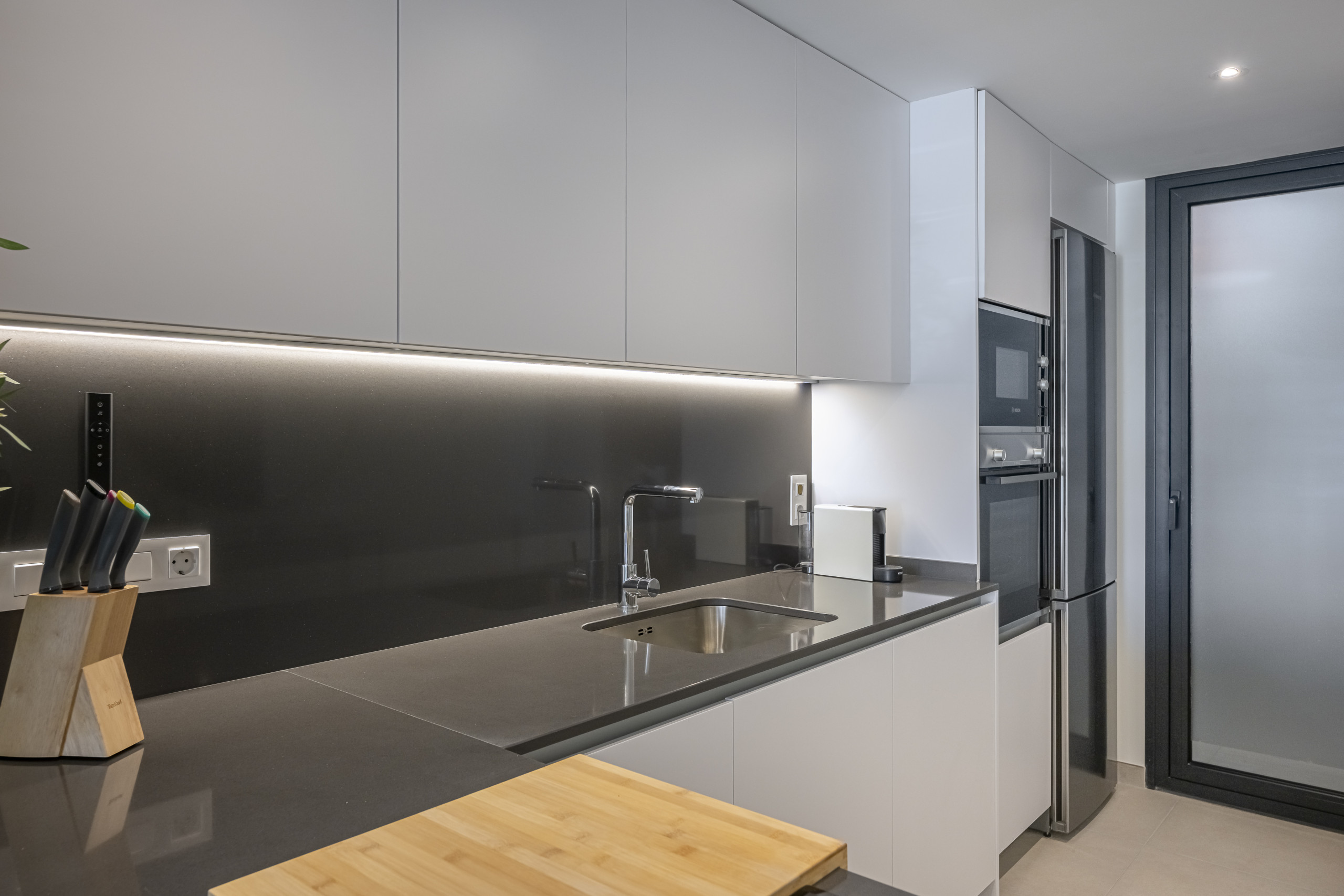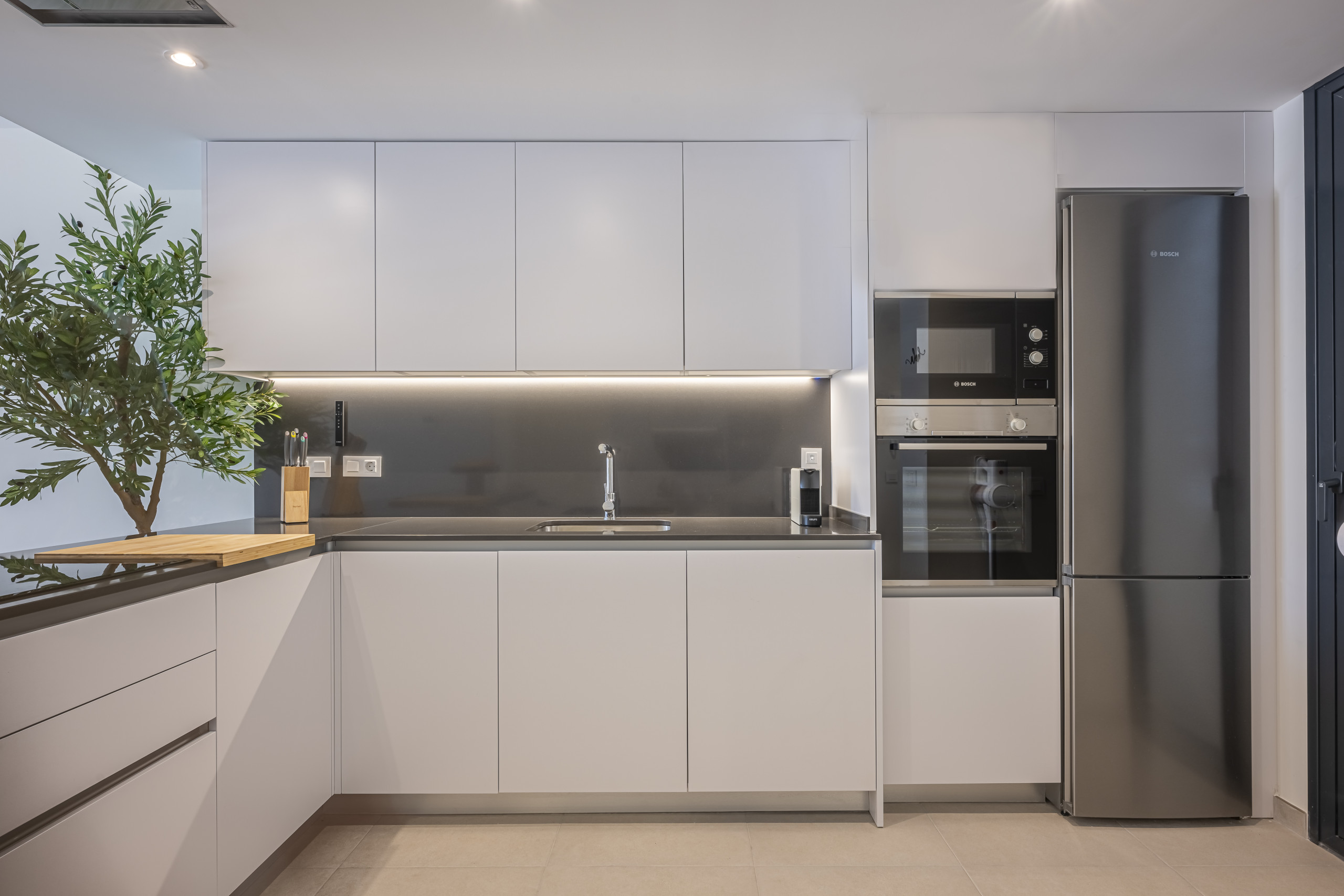 A fully equipped premium kitchen including a dishwasher, coffee maker, and all high-end utensils. It also features a separate laundry room with a tumble dryer, perfect for longer stays.