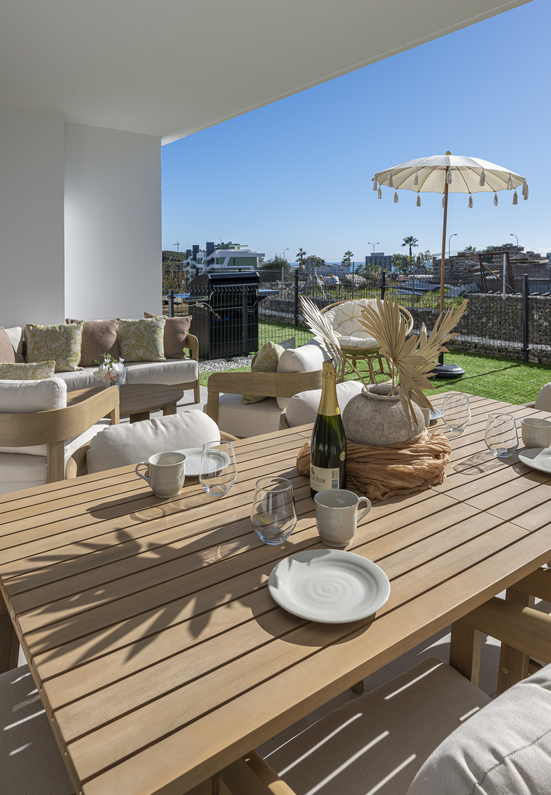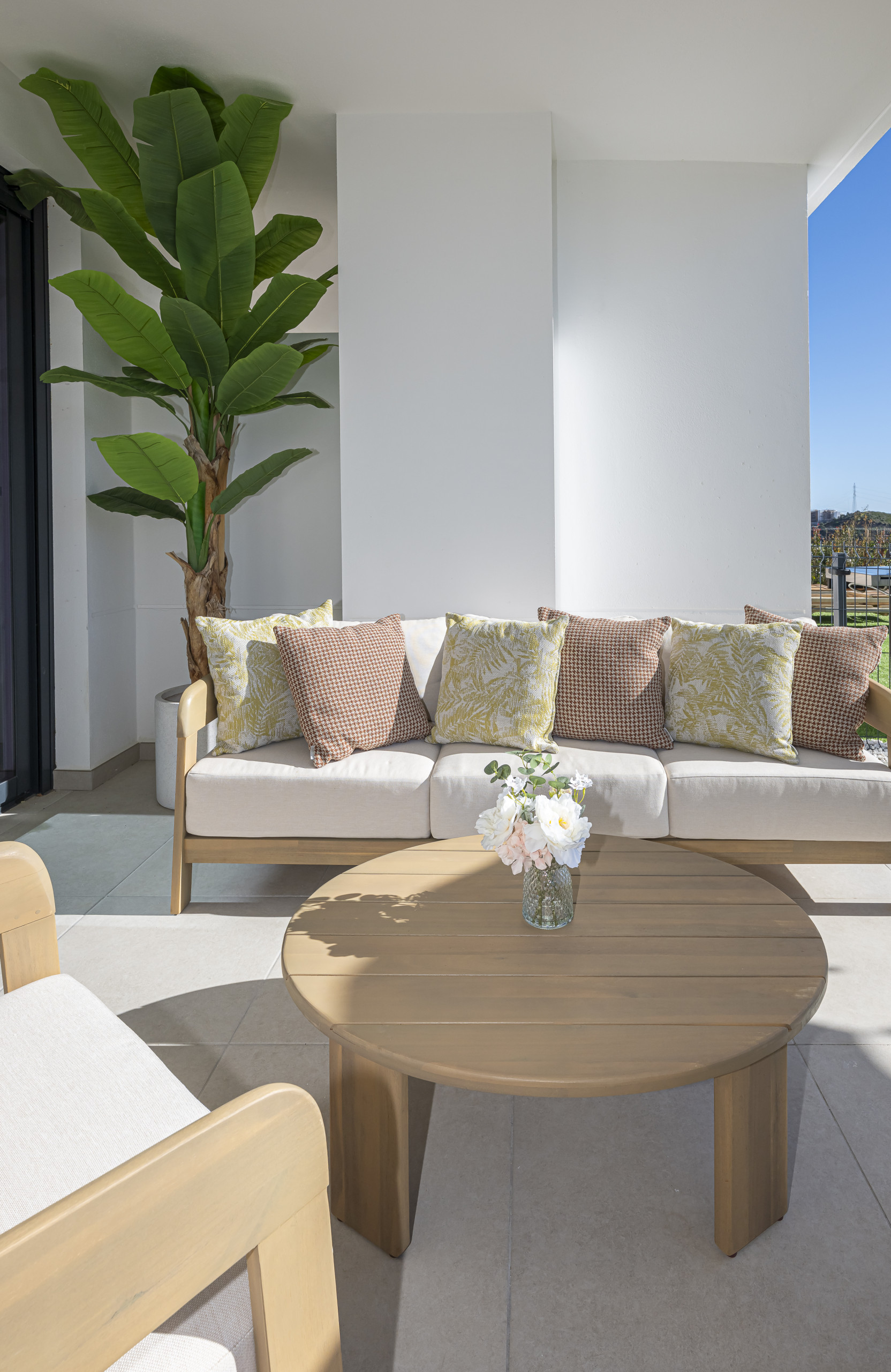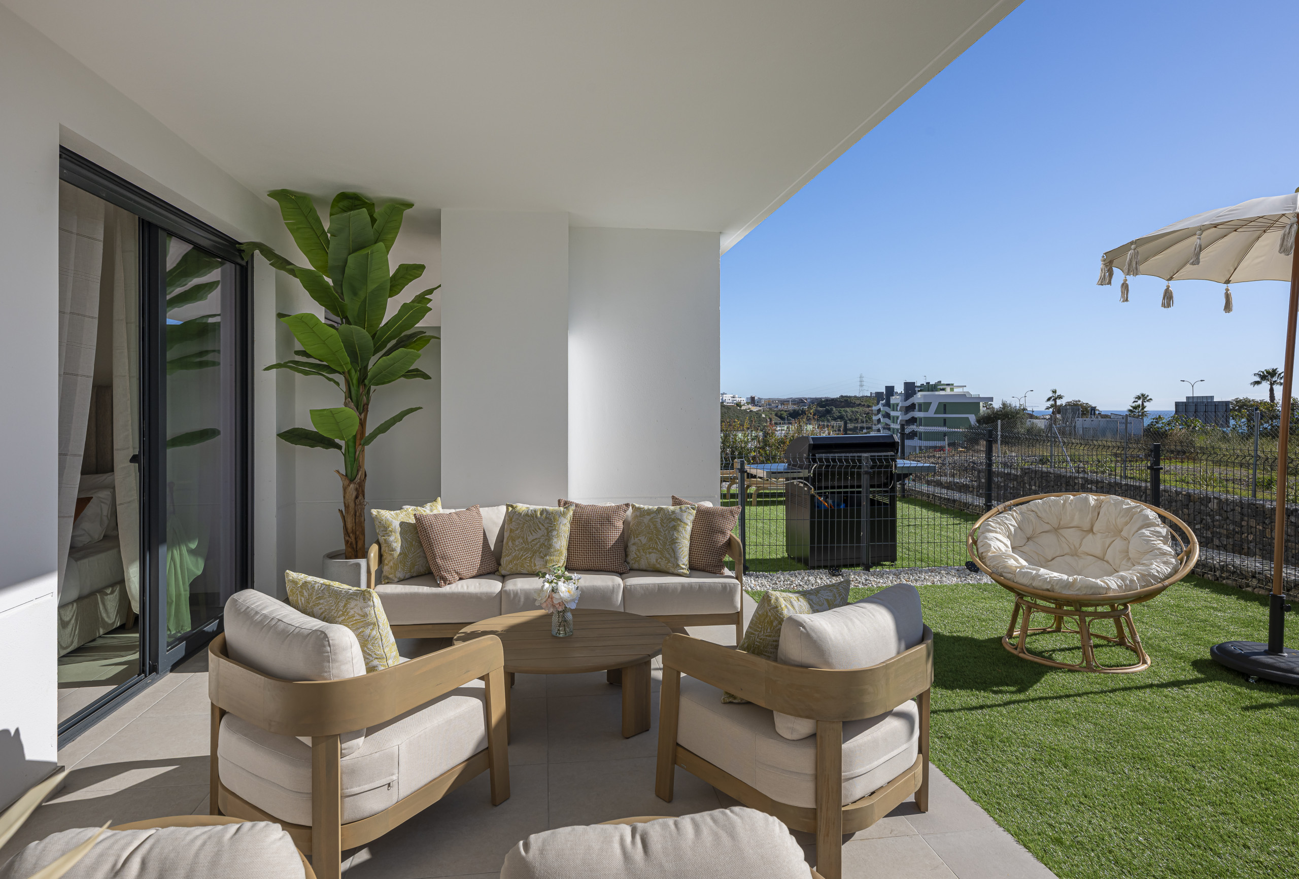 This contemporary home is designed for functionality and relaxation, offering a spacious layout that integrates the indoor living areas with a beautiful private terrace.