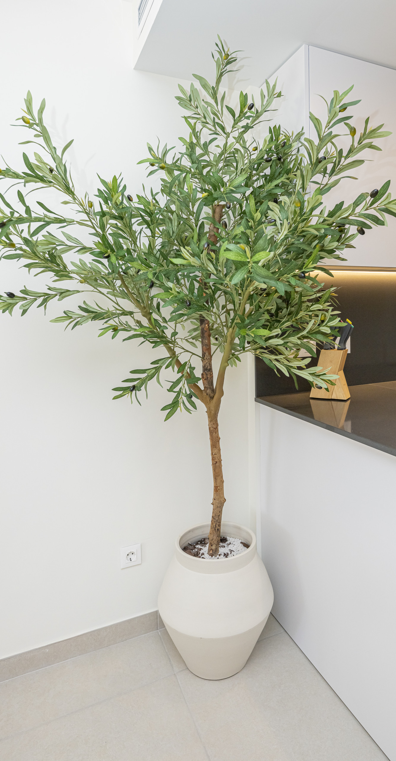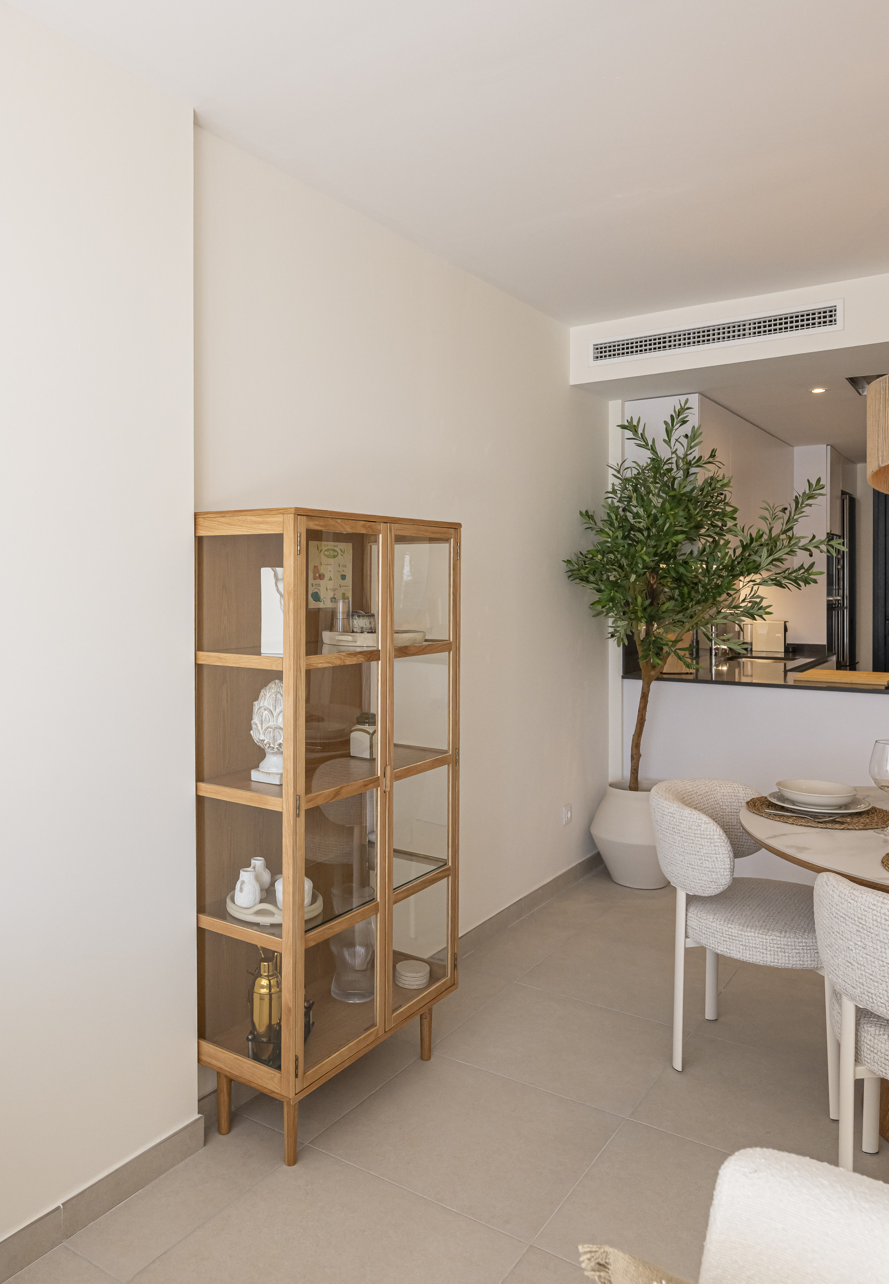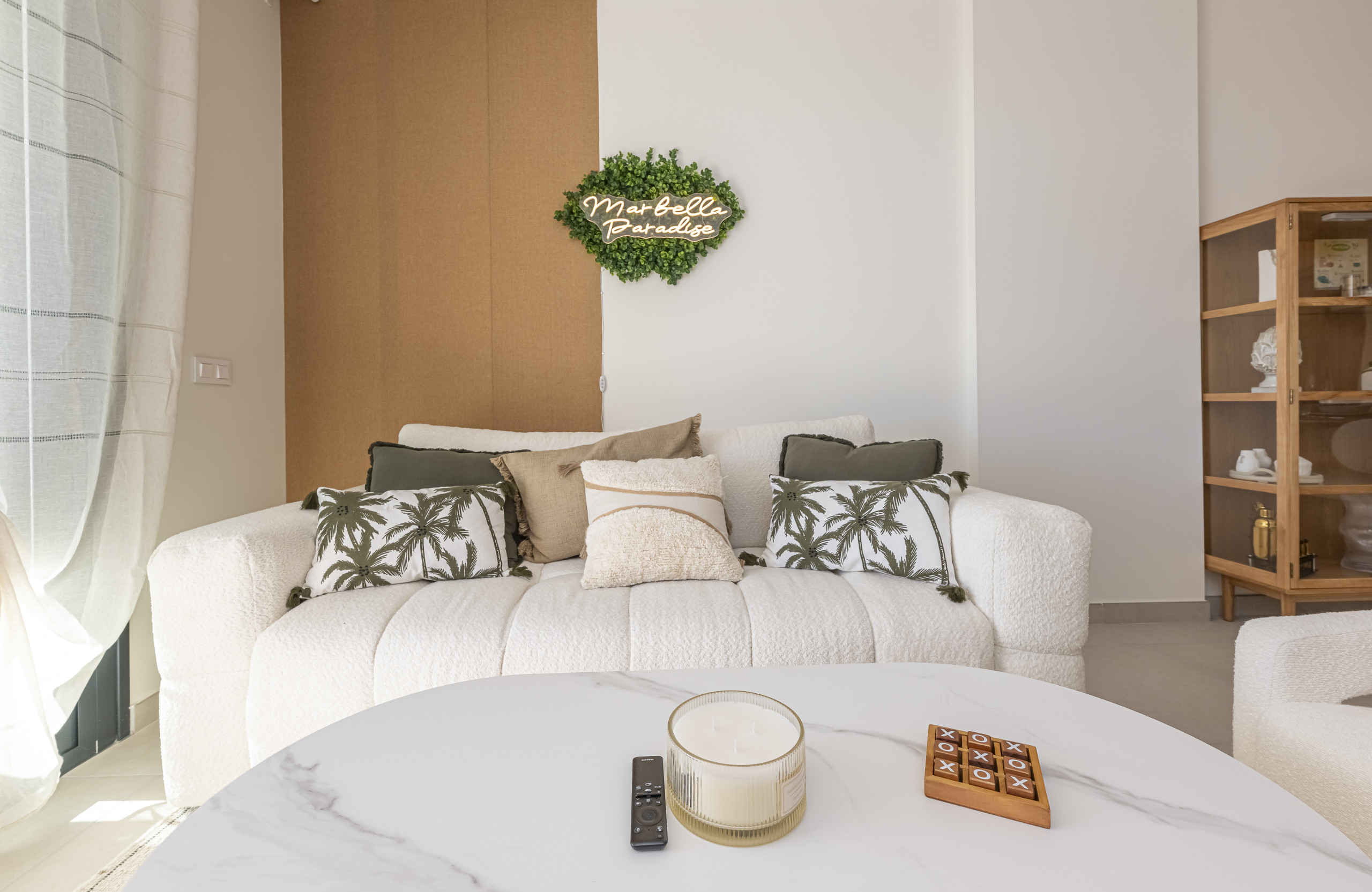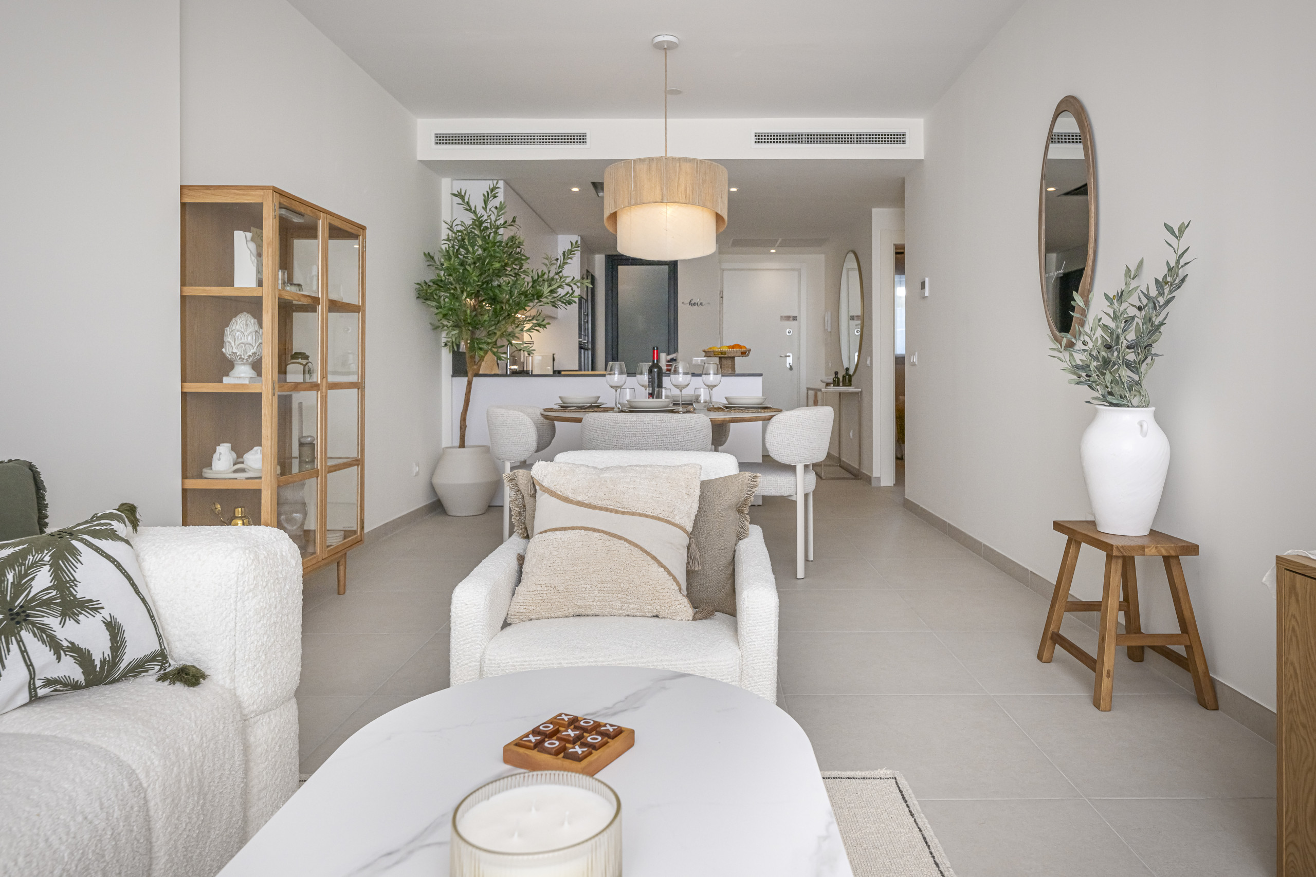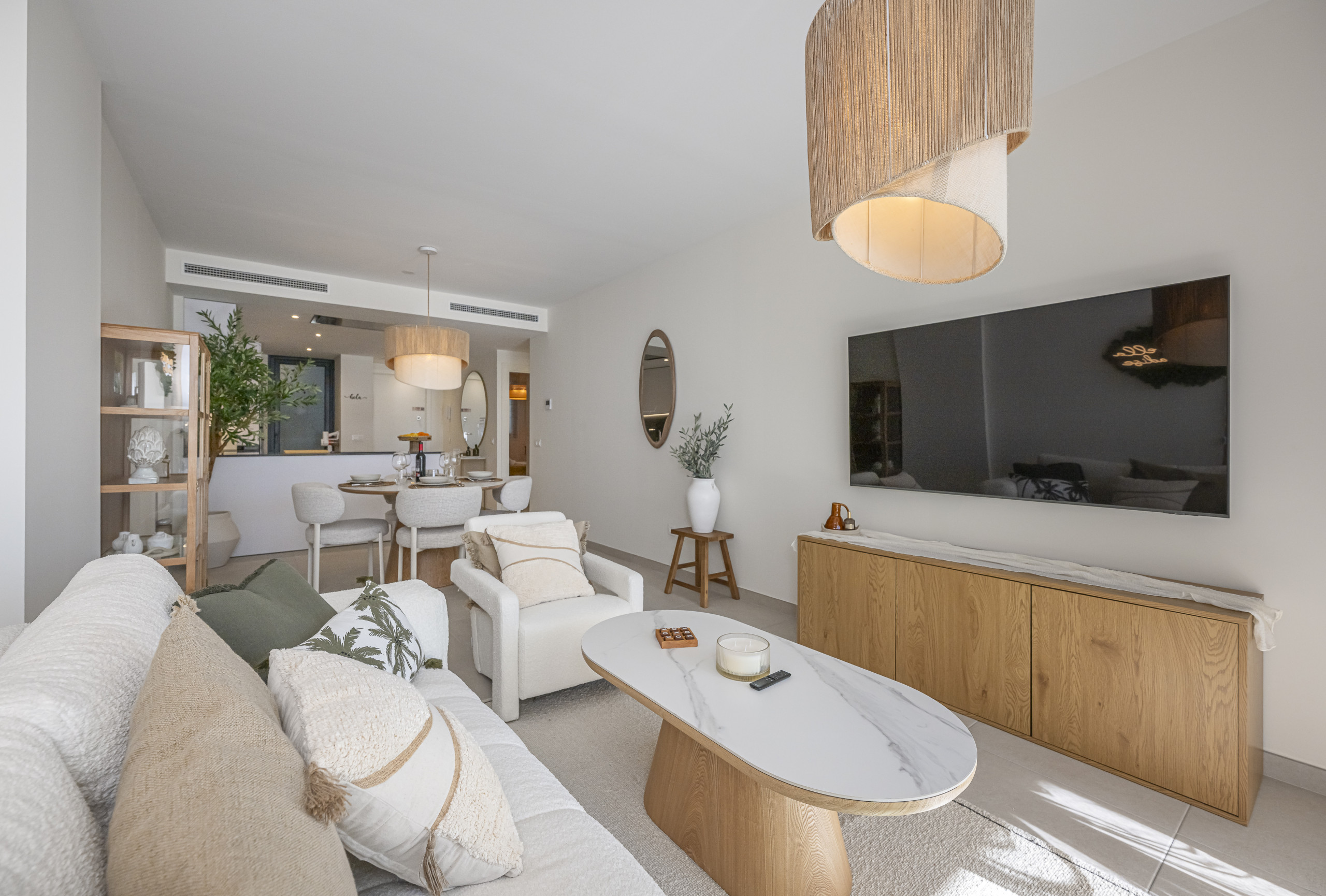 An expansive and bright social area designed for groups of up to 8 guests. It features a large Smart TV, elegant furniture, and seamless access to the terrace. The space is equipped with centralized air conditioning and underfloor heating for year-round comfort.