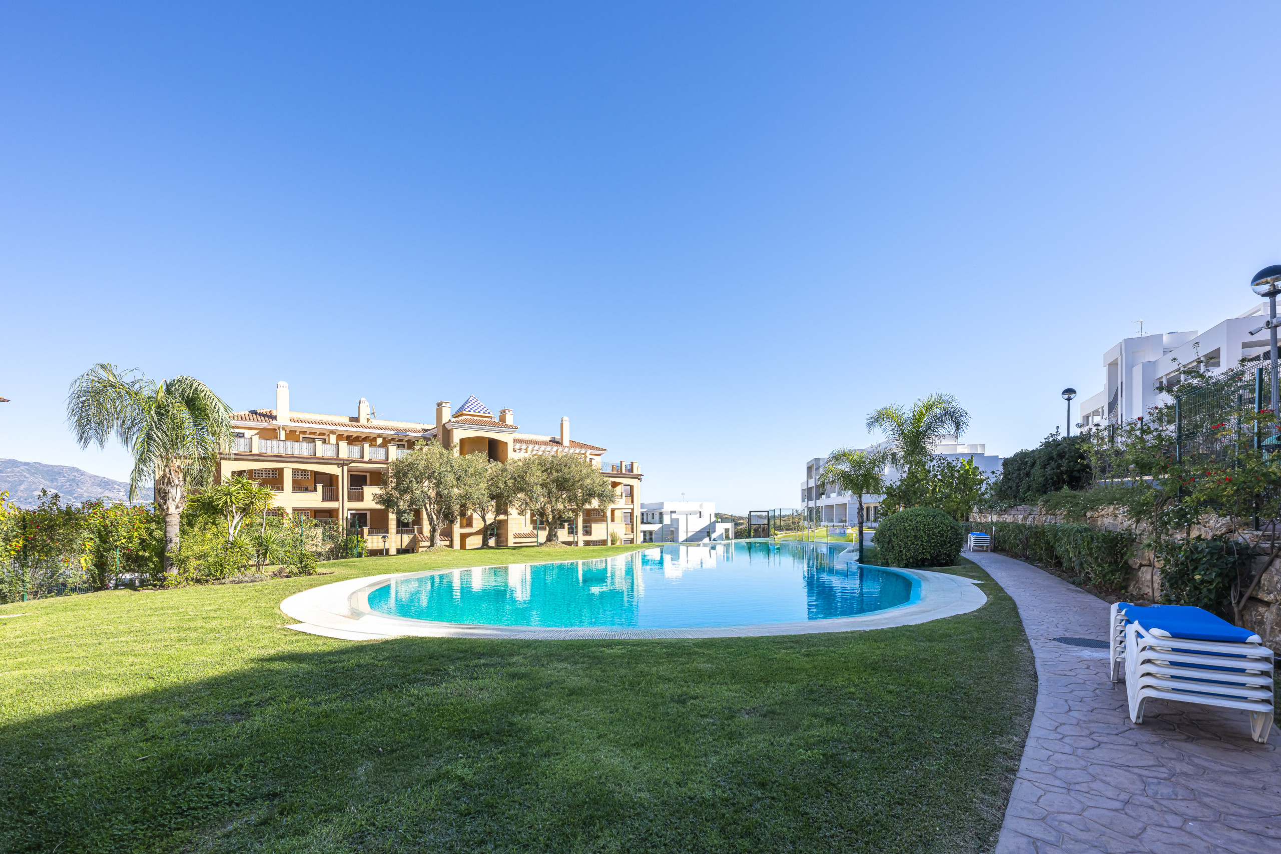 The residential complex features a large outdoor swimming pool surrounded by well-kept gardens. For your convenience, the apartment includes a dedicated underground parking space (No. 4) with direct lift access to the ground floor.