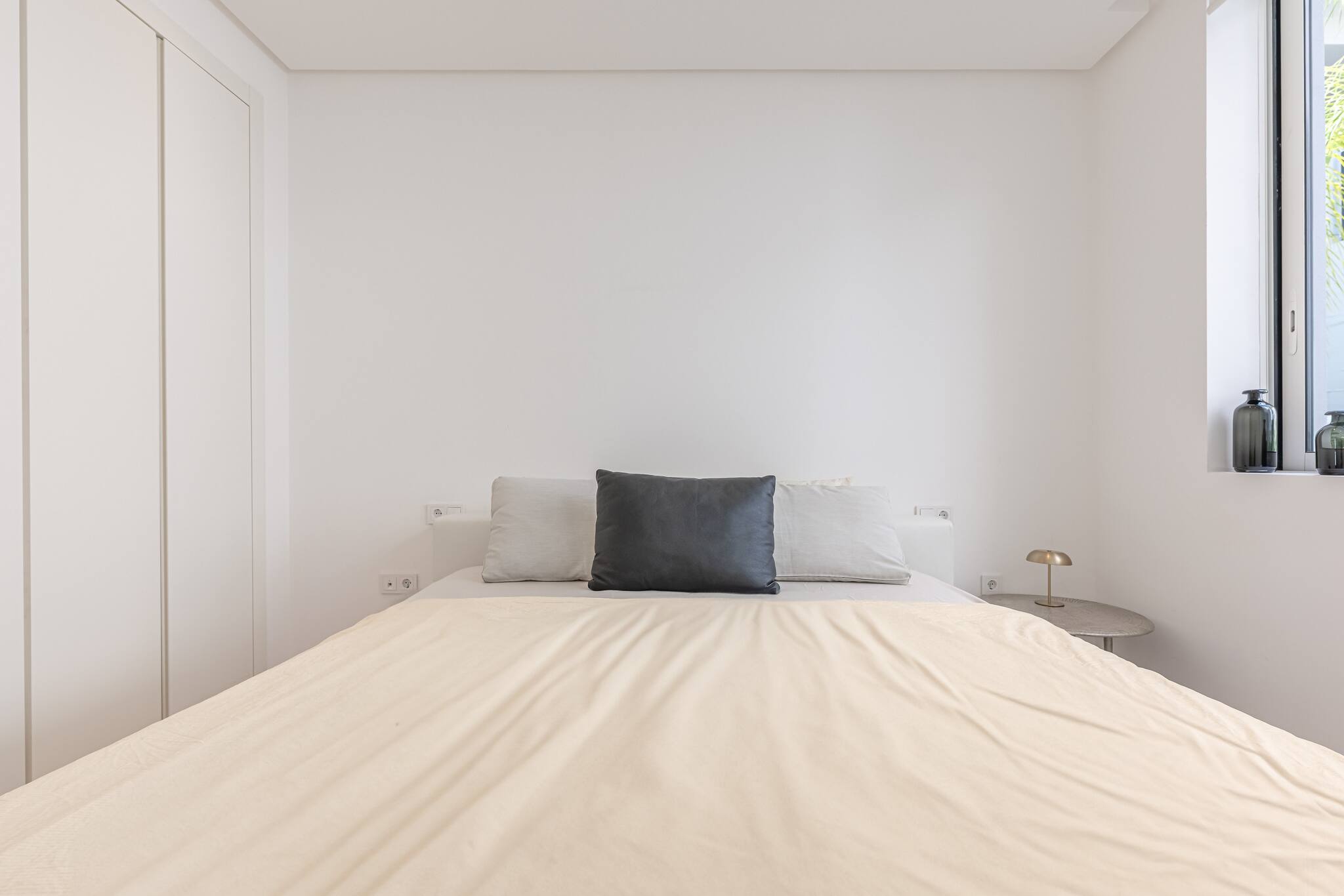 The flat has two bedrooms. In the main bedroom, you have a comfortable double bed, air conditioning, and an en-suite bathroom.