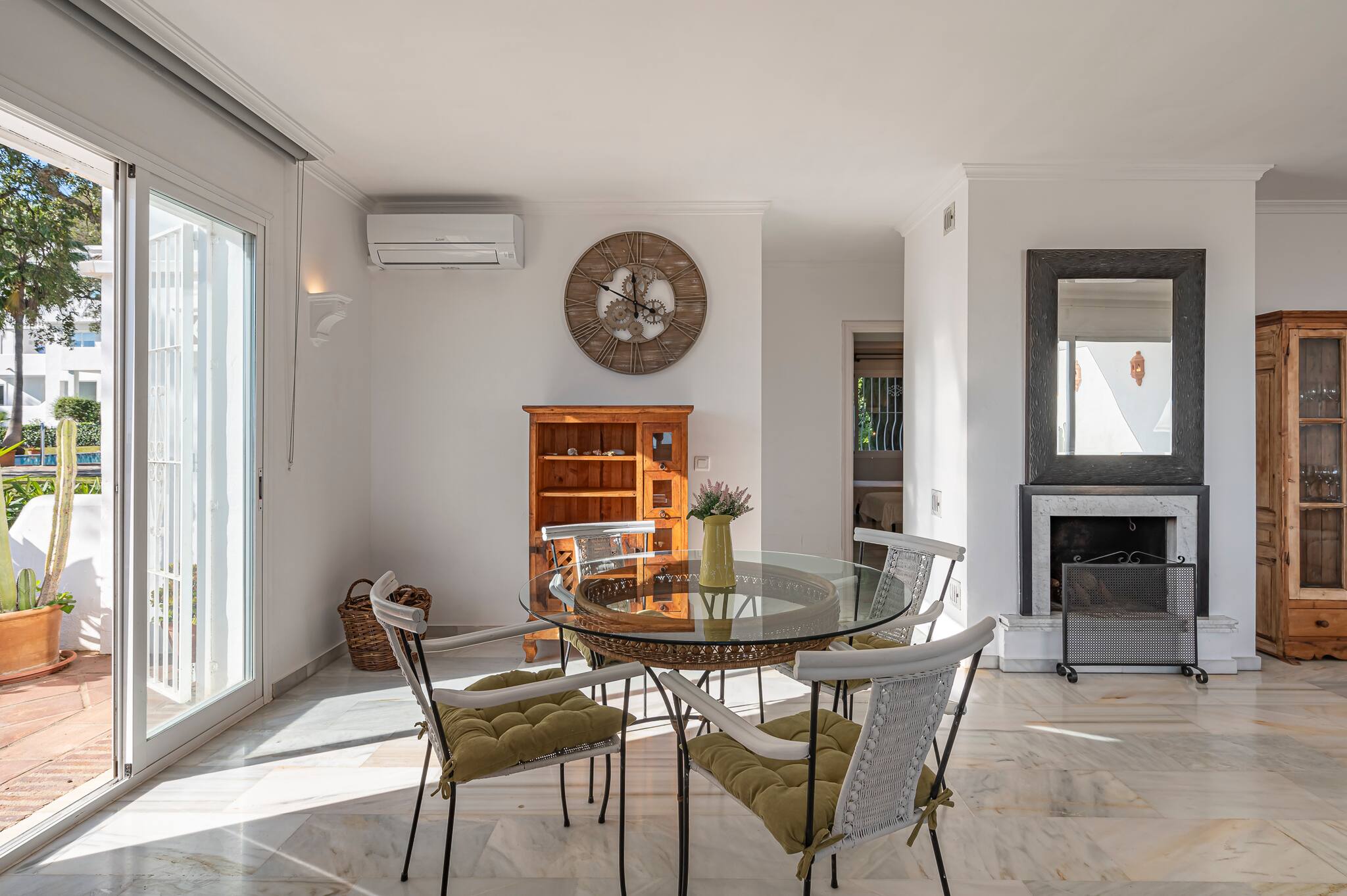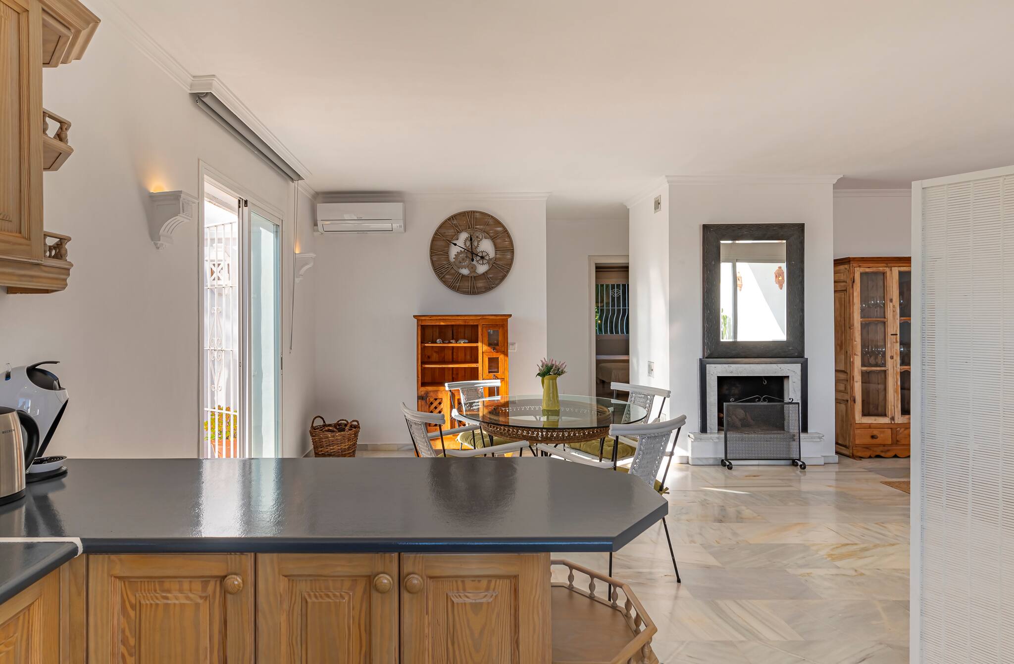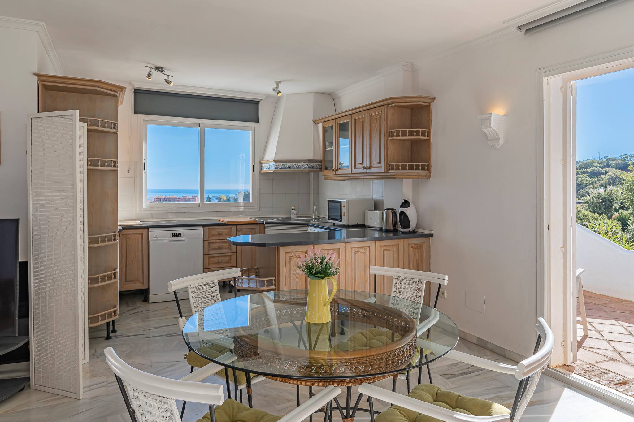 The living room is connected to the dining area and kitchen, and has access to the two terraces and air conditioning for greater comfort.