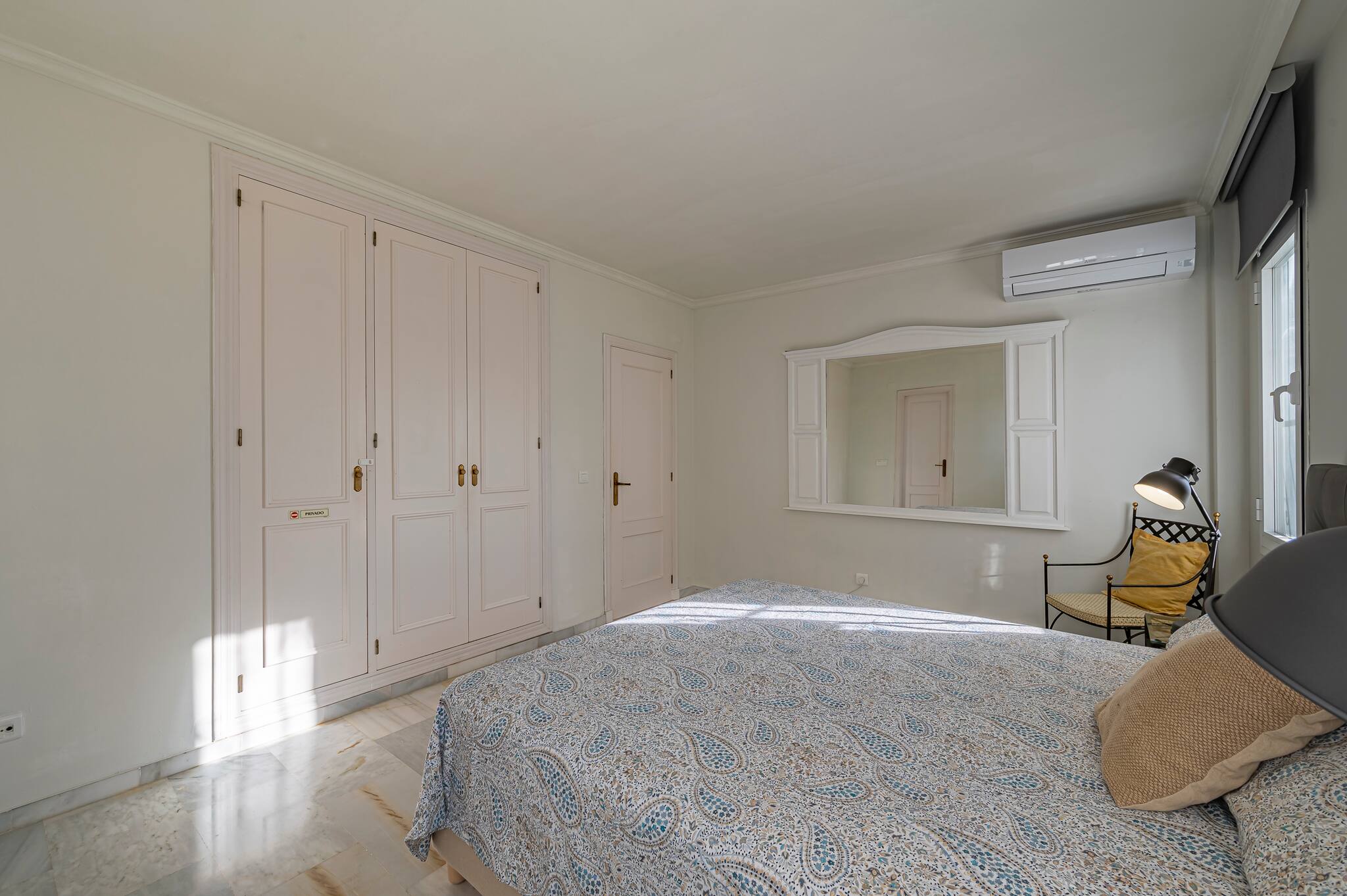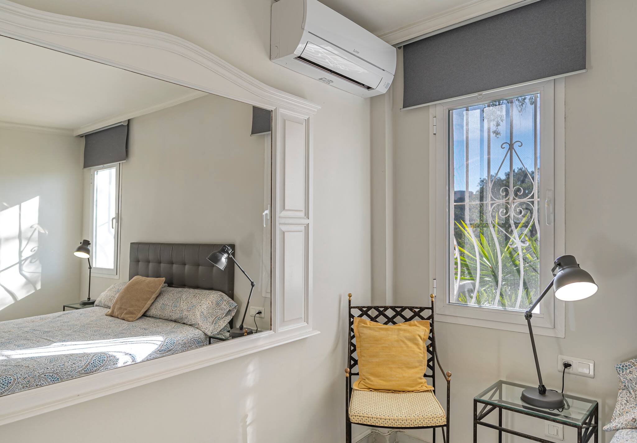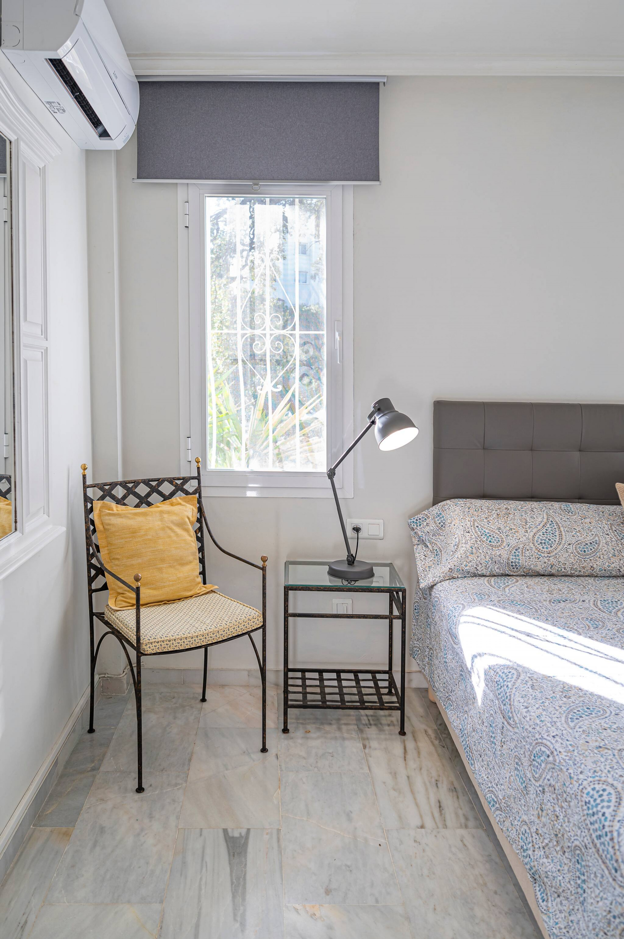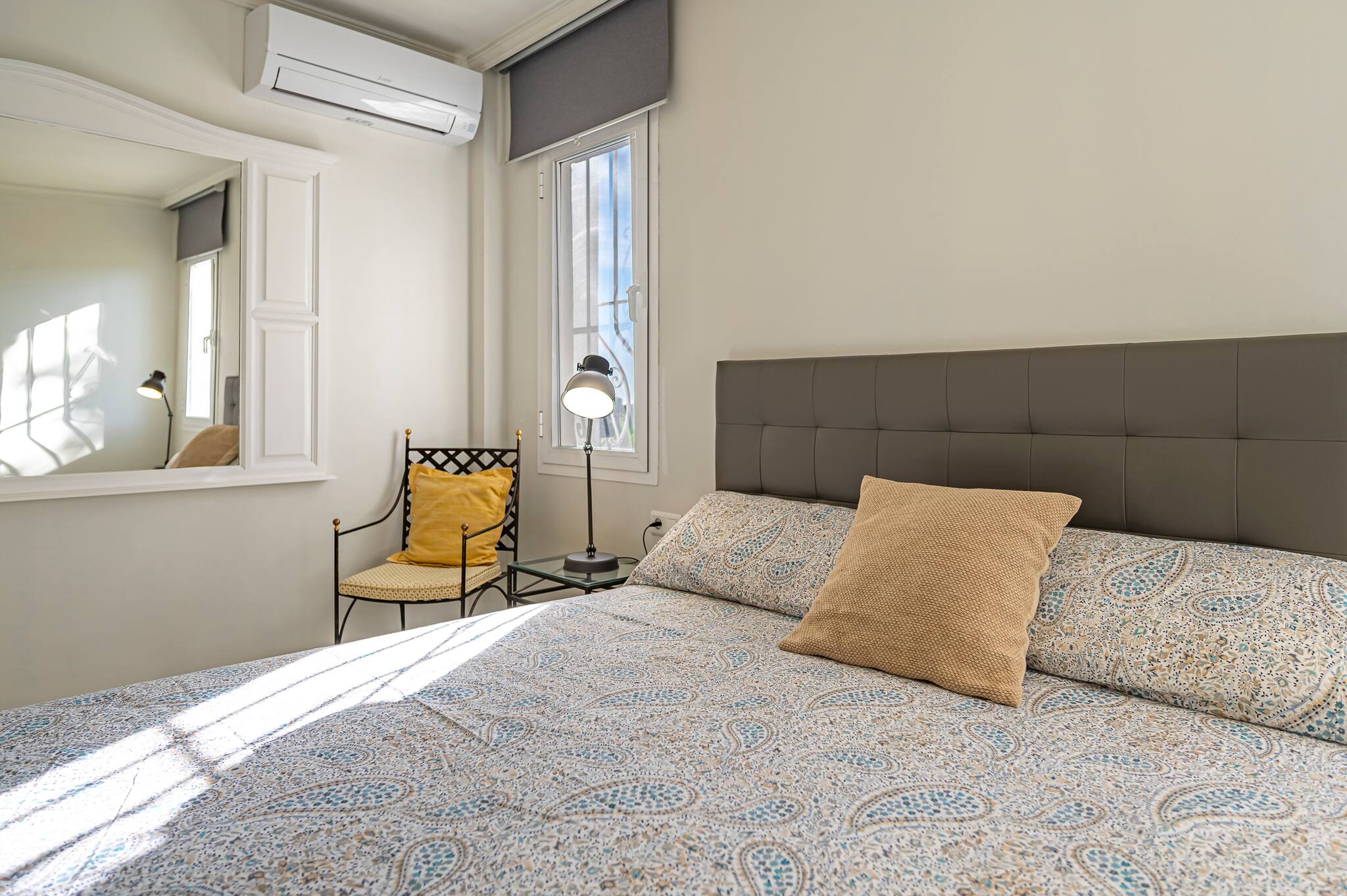 The flat has two bedrooms. In the main bedroom, you have a comfortable double bed, air conditioning, and an en-suite bathroom.