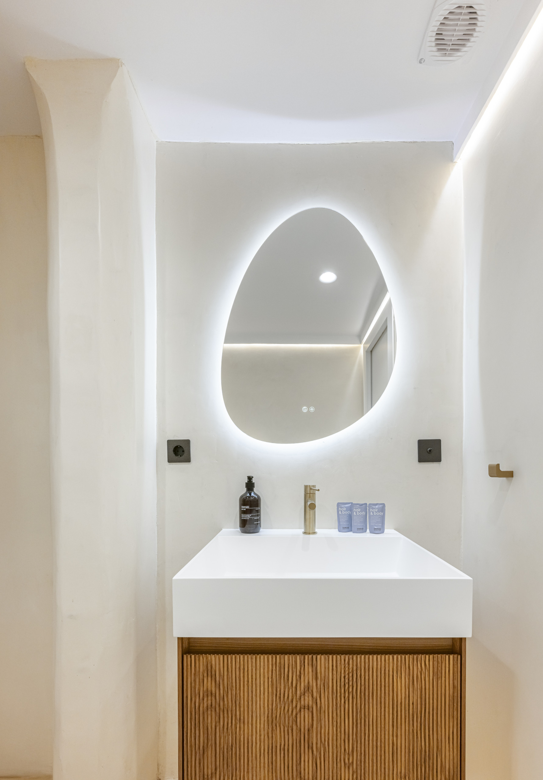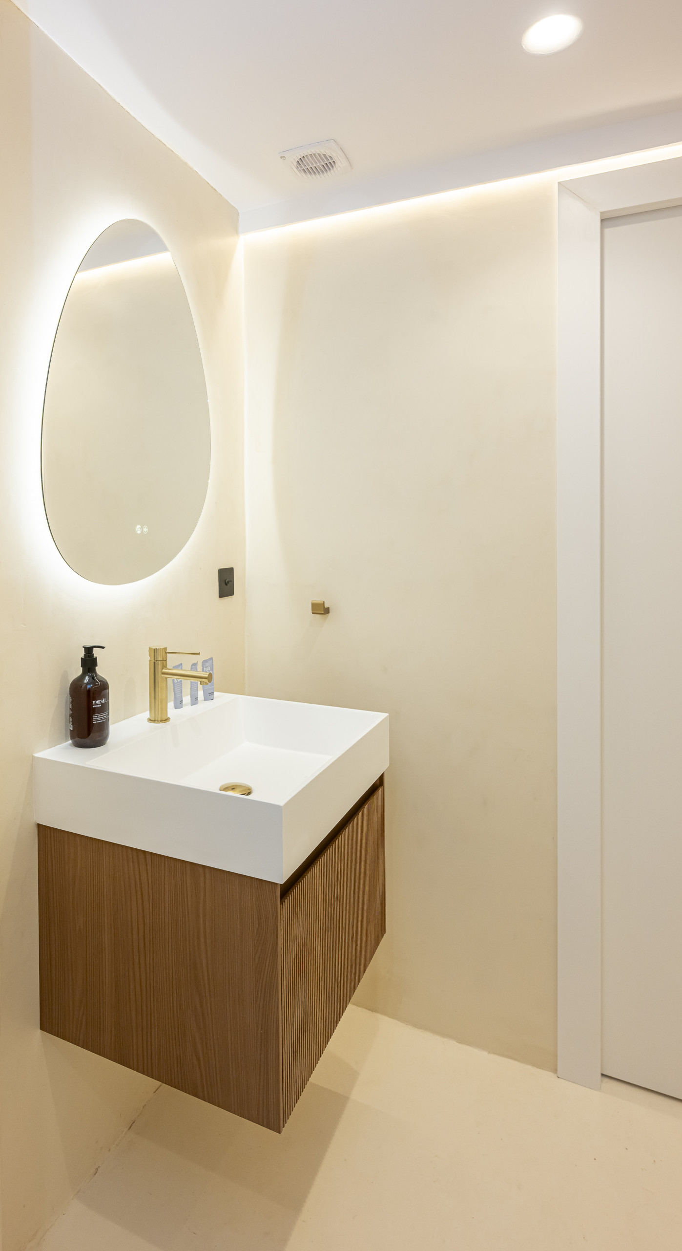 > This bathroom combines neutral-toned walls with gold finishes and warm wood, achieving a balance between modernity and comfort. Subtle lighting enhances the texture of the materials and transforms the marble shower and sink into a sophisticated corner for personal care.