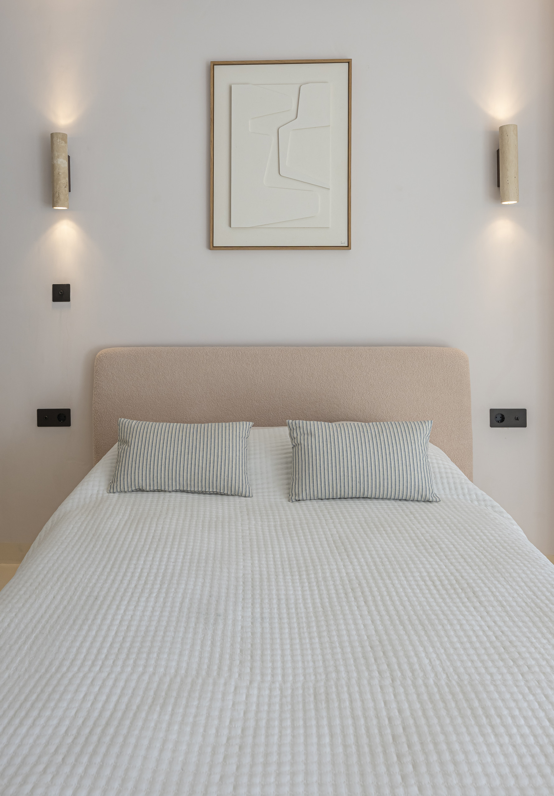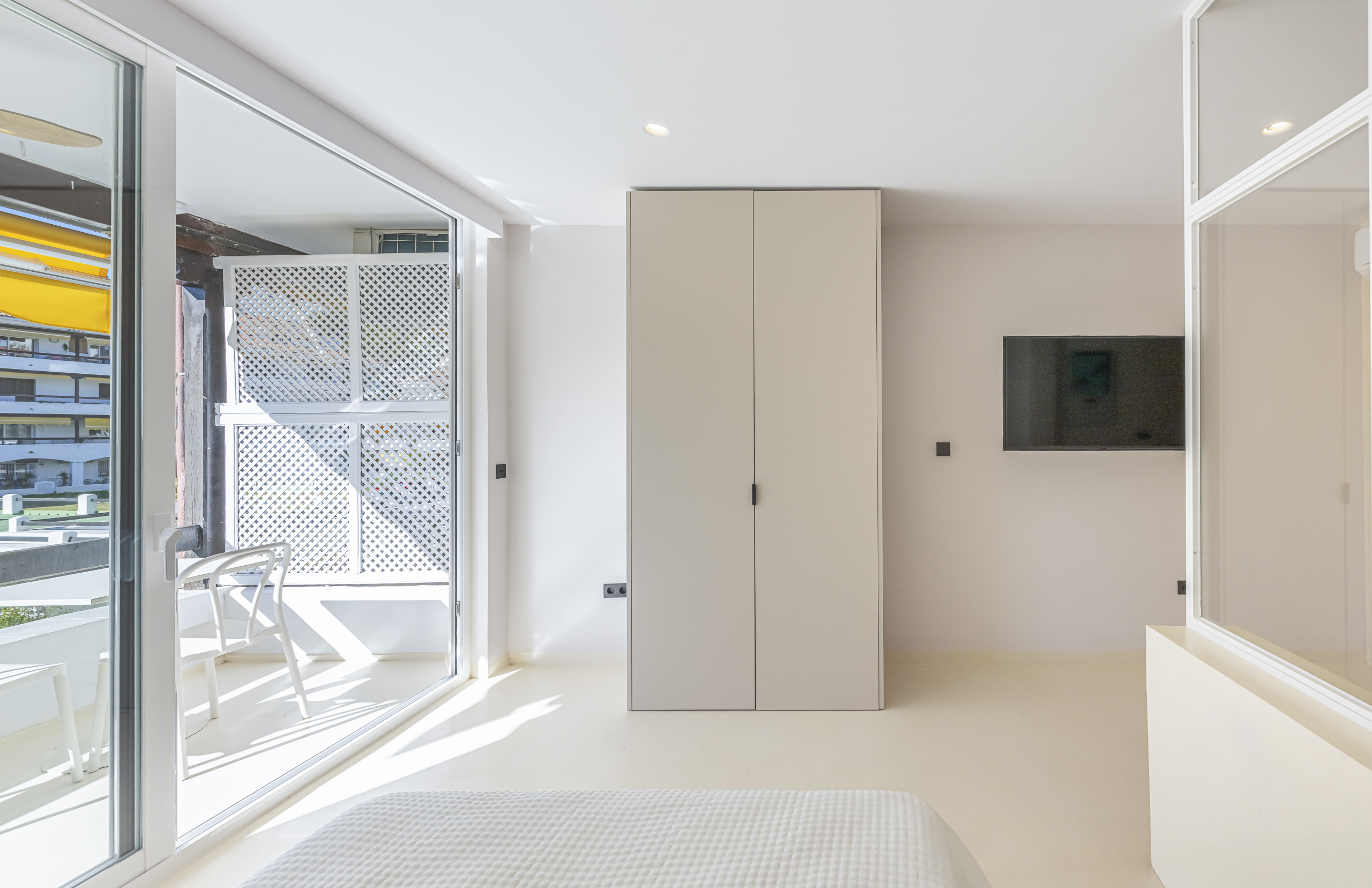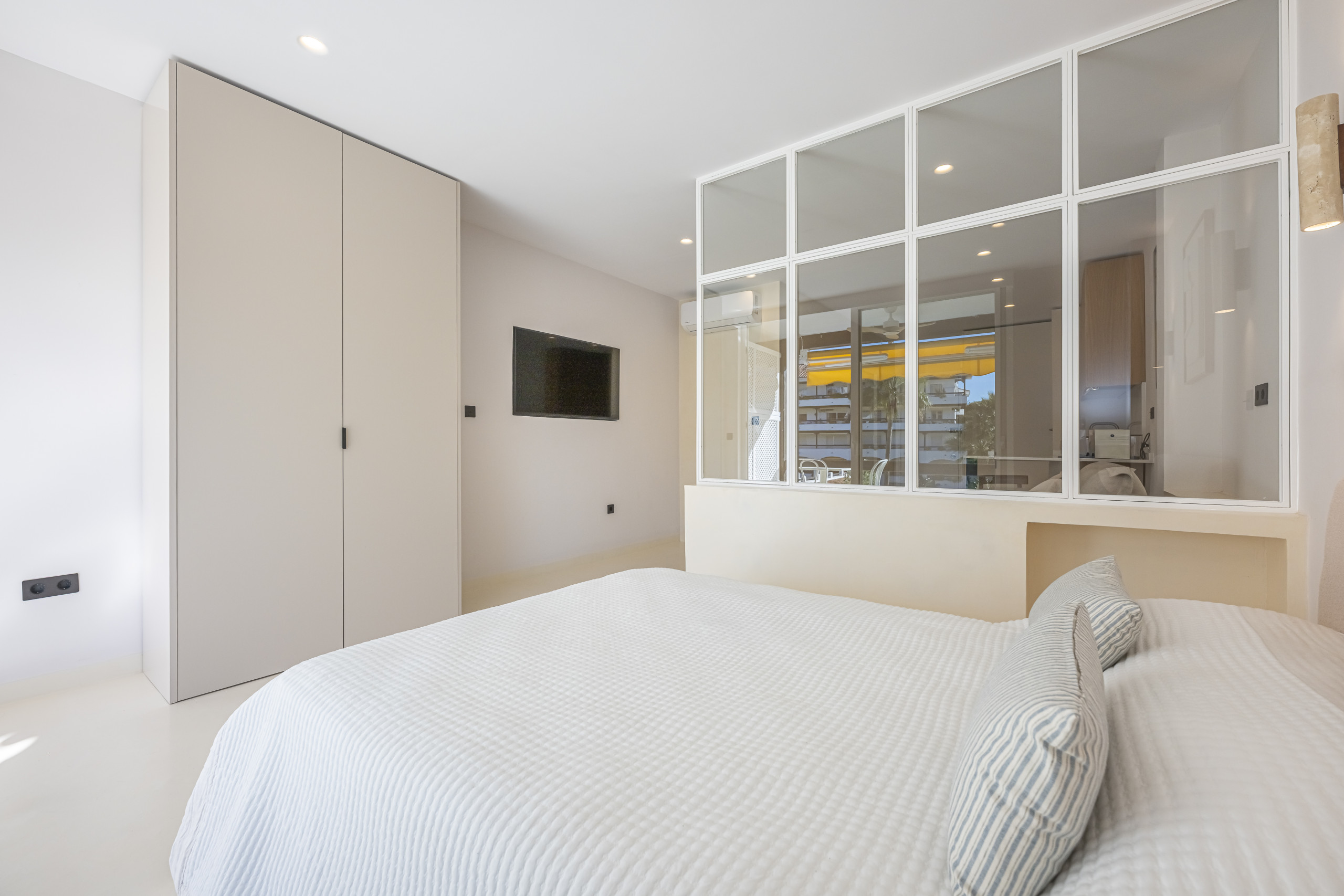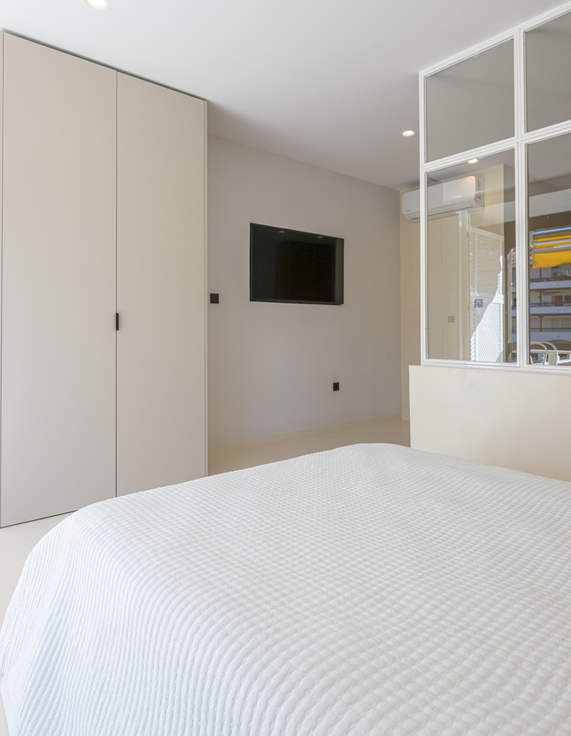 > Cosy bedroom with a 135 cm double bed, designed to provide comfort and tranquillity. It has a mirror and a TV for moments of relaxation. Its large windows offer direct access to the balcony and fill the room with natural light throughout the day.